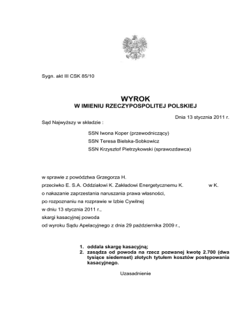Sygn. akt III CSK 85/10 WYROK W IMIENIU RZECZYPOSPOLITEJ POLSKIEJ Dnia 13 stycznia 2011 r. Sąd Najwyższy w składzie : SSN Iwona Koper (przewodniczący) SSN Teresa Bielska-Sobkowicz SSN Krzysztof Pietrzykowski (sprawozdawca) w sprawie z powództwa Grzegorza H. przeciwko E. S.A. Oddziałowi K. Zakładowi Energetycznemu K. w K. o nakazanie zaprzestania naruszania prawa własności, po rozpoznaniu na rozprawie w Izbie Cywilnej w dniu 13 stycznia 2011 r., skargi kasacyjnej powoda od wyroku Sądu Apelacyjnego z dnia 29 października 2009 r., 1. oddala skargę kasacyjną; 2. zasądza od powoda na rzecz pozwanej kwotę 2.700 (dwa tysiące siedemset) złotych tytułem kosztów postępowania kasacyjnego. Uzasadnienie 2 Sąd Okręgowy wyrokiem z dnia 2 lipca 2009 r. nakazał pozwanej „E.” S.A. Oddział K. - Zakładowi Energetycznemu w K. usunięcie z nieruchomości stanowiącej własność powoda Grzegorza H. trzech słupów elektrycznych i stacji trafo oraz zasądził od pozwanej na rzecz powoda kwotę 7 417 złotych tytułem kosztów procesu. Sąd Okręgowy ustalił, że w 1964 r. sporne urządzenia energetyczne zostały wzniesione na rzeczonej nieruchomości, która stanowiła wtedy własność Skarbu Państwa. Dnia 3 kwietnia 1997 r. Agencja Własności Rolnej Skarbu Państwa (obecnie Agencja Nieruchomości Rolnych) sprzedała tę nieruchomość Irenie H. i Ireneuszowi H., od których następnie własność nieruchomości nabył powód. Sąd Okręgowy uznał, że powództwo zasługuje na uwzględnienie, gdyż pozwana nie wykazała tytułu prawnego do korzystania z nieruchomości powoda. Pozwanej nie przysługuje służebność, która w szczególności nie została nabyta przez pozwaną w drodze zasiedzenia. Przedsiębiorstwo państwowe „Zakład Energetyczny K.” w K., utworzone dnia 1 stycznia 1989 r., nie zostało „automatycznie uwłaszczone” na majątku Skarbu Państwa ani wskutek zmiany art. 128 k.c. (od dnia 1 lutego 1989 r.), ani późniejszego uchylenia tego przepisu. Sąd Okręgowy nie znalazł też podstawy do zastosowania art. 5 k.c. Pozwana wniosła apelację od wyroku Sądu Okręgowego. Sąd Apelacyjny wyrokiem z dnia 29 października 2010 r. zmienił zaskarżony wyrok w ten sposób, że powództwo oddalił i zasądził od powoda na rzecz pozwanej kwotę 3 617 złotych tytułem kosztów procesu oraz zasądził od powoda na rzecz pozwanej kwotę 6 500 złotych tytułem kosztów postępowania apelacyjnego. Podkreślił, że w niniejszej sprawie, skoro Skarb Państwa był właścicielem zarówno rzeczonej nieruchomości, jak i urządzeń elektroenergetycznych, jest oczywiste, iż nie było podstaw prawnych do ustanawiania służebności przesyłowej. Nie można więc skutecznie podnosić, że w wyniku zbycia nieruchomości przez Skarb Państwa na rzecz osób fizycznych wzniesienie urządzeń energetycznych na nieruchomości stałoby się bezprawne, a w konsekwencji uzasadniało powództwo o ich usunięcie na podstawie art. 222 k.c. Jest zaś oczywiste, że Skarb Państwa, zbywając rzeczoną nieruchomość, nie przeniósł na nabywców prawa własności tych urządzeń, które nie mogły być częścią składową nieruchomości z uwagi na art. 49 3 k.c. Własność urządzeń energetycznych jako majątek Skarbu Państwa przeszła na nowy podmiot (spółkę handlową z udziałem Skarbu Państwa). Sąd Apelacyjny, odwołując się do poglądu wyrażonego w wyroku Sądu Najwyższego z dnia 28 czerwca 2005 r., I CK 14/05 (niepubl.), przyjął, że w odniesieniu do eksploatacji tych urządzeń doszło do nawiązania między Skarbem Państwa a spółką prawa handlowego (poprzednikiem pozwanej) stosunku cywilnoprawnego, mianowicie obligacji realnej, charakteryzującej się trwałością i ciągłością, choć niebędącej formalnie ograniczonym prawem rzeczowym. Nabywcy nieruchomości, których następcą prawnym jest powód, wstąpili jako strona do tego stosunku cywilnoprawnego w miejsce Skarbu Państwa. Powód w skardze kasacyjnej zaskarżył wyrok Sądu Apelacyjnego w całości, zarzucając naruszenie przepisów prawa materialnego, mianowicie art. 140 k.c., przez konstruowanie obligacji realnej o cechach prawa rzeczowego ograniczonego z obejściem art. 244 k.c. Sąd Najwyższy zważył, co następuje: Podniesiony w skardze kasacyjnej zarzut naruszenia art. 140 w związku z art. 244 k.c. jest o tyle trafny, że obowiązujące prawo rzeczywiście nie stwarza podstaw do konstruowania w niniejszej sprawie obligacji realnej z obejściem zasady numerus clausus praw rzeczowych. W polskim prawie istnieją wprawdzie tzw. zobowiązania realne, których źródłem jest jednak zawsze przepis ustawy (np. prawa osobiste lub roszczenia ujawnione w księdze wieczystej oraz stosunki prawne kontraktacji, najmu, dzierżawy, leasingu, dożywocia i spółdzielczego lokatorskiego prawa do lokalu). Tworzenie innych zobowiązań realnych, a więc bez wyraźnej podstawy prawnej, jest niedopuszczalne. Poza tym jednak zarzut naruszenia art. 140 k.c. nie jest uzasadniony. Zgodnie z tym przepisem, granice wykonywania prawa własności są wyznaczone przez ustawy, zasady współżycia społecznego i społeczno-gospodarcze przeznaczenie prawa. Przepisem ustawy, który w niniejszej sprawie ogranicza wykonywanie prawa własności nieruchomości, jest art. 49 § 1 k.c., stosownie do którego urządzenia służące m.in. do doprowadzania energii elektrycznej nie należą do części składowych nieruchomości, jeżeli wchodzą w skład przedsiębiorstwa. W uzasadnieniu uchwały składu 7 sędziów z dnia 8 marca 2006 r., III CZP 105/05 4 (OSNC 2006, nr 10, poz. 159) Sąd Najwyższy wyjaśnił m.in., że status prawny przyłączonych do sieci urządzeń objętych treścią art. 49 k.c. zależy od tego, czy stają się one częścią składową instalacji należącej do przedsiębiorstwa. W razie odpowiedzi twierdzącej, urządzenia te tracą swoją odrębność i stają się własnością właściciela inst