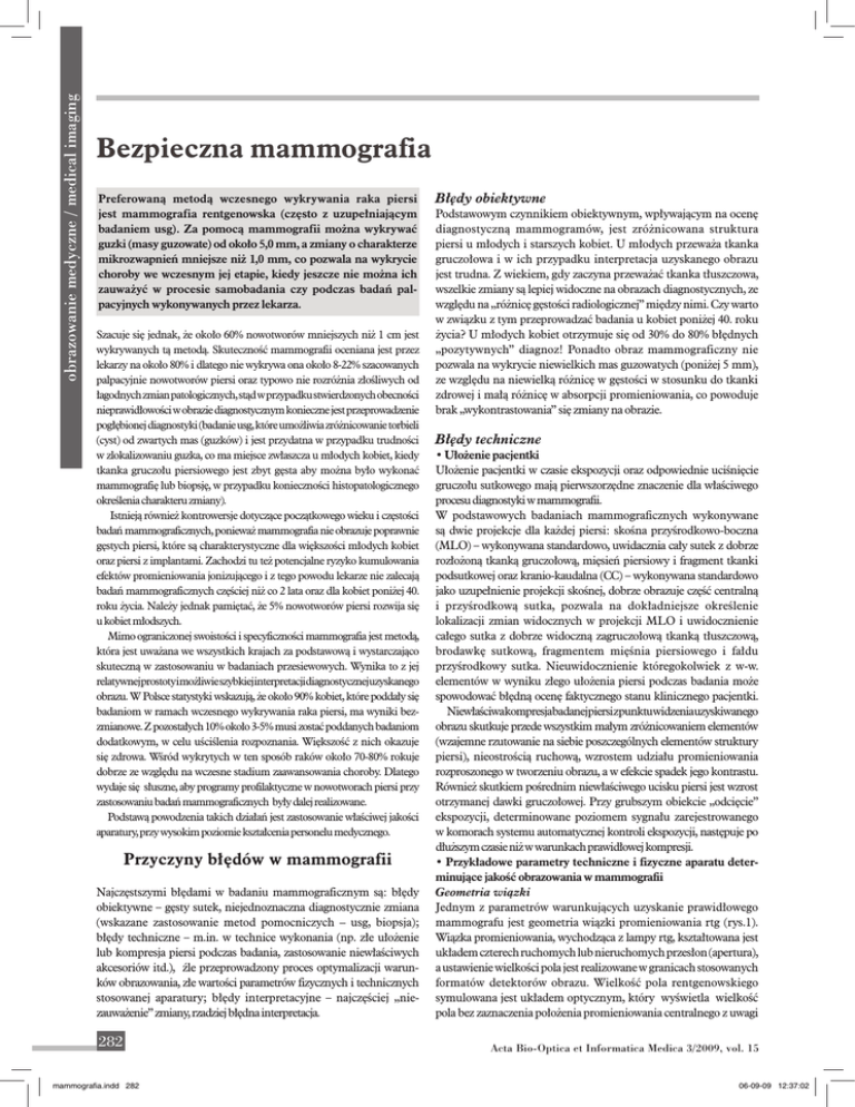 obrazowanie medyczne / medical imaging Bezpieczna mammografia Preferowaną metodą wczesnego wykrywania raka piersi jest mammografia rentgenowska (często z uzupełniającym badaniem usg). Za pomocą mammografii można wykrywać guzki (masy guzowate) od około 5,0 mm, a zmiany o charakterze mikrozwapnień mniejsze niż 1,0 mm, co pozwala na wykrycie choroby we wczesnym jej etapie, kiedy jeszcze nie można ich zauważyć w procesie samobadania czy podczas badań palpacyjnych wykonywanych przez lekarza. Szacuje się jednak, że około 60% nowotworów mniejszych niż 1 cm jest wykrywanych tą metodą. Skuteczność mammografii oceniana jest przez lekarzy na około 80% i dlatego nie wykrywa ona około 8-22% szacowanych palpacyjnie nowotworów piersi oraz typowo nie rozróżnia złośliwych od łagodnych zmian patologicznych, stąd w przypadku stwierdzonych obecności nieprawidłowości w obrazie diagnostycznym konieczne jest przeprowadzenie pogłębionej diagnostyki (badanie usg, które umożliwia zróżnicowanie torbieli (cyst) od zwartych mas (guzków) i jest przydatna w przypadku trudności w zlokalizowaniu guzka, co ma miejsce zwłaszcza u młodych kobiet, kiedy tkanka gruczołu piersiowego jest zbyt gęsta aby można było wykonać mammografię lub biopsję, w przypadku konieczności histopatologicznego określenia charakteru zmiany). Istnieją również kontrowersje dotyczące początkowego wieku i częstości badań mammograficznych, ponieważ mammografia nie obrazuje poprawnie gęstych piersi, które są charakterystyczne dla większości młodych kobiet oraz piersi z implantami. Zachodzi tu też potencjalne ryzyko kumulowania efektów promieniowania jonizującego i z tego powodu lekarze nie zalecają badań mammograficznych częściej niż co 2 lata oraz dla kobiet poniżej 40. roku życia. Należy jednak pamiętać, że 5% nowotworów piersi rozwija się u kobiet młodszych. Mimo ograniczonej swoistości i specyficzności mammografia jest metodą, która jest uważana we wszystkich krajach za podstawową i wystarczająco skuteczną w zastosowaniu w badaniach przesiewowych. Wynika to z jej relatywnejprostotyimożliwieszybkiejinterpretacjidiagnostycznejuzyskanego obrazu. W Polsce statystyki wskazują, że około 90% kobiet, które poddały się badaniom w ramach wczesnego wykrywania raka piersi, ma wyniki bezzmianowe. Z pozostałych 10% około 3-5% musi zostać poddanych badaniom dodatkowym, w celu uściślenia rozpoznania. Większość z nich okazuje się zdrowa. Wśród wykrytych w ten sposób raków około 70-80% rokuje dobrze ze względu na wczesne stadium zaawansowania choroby. Dlatego wydaje się słuszne, aby programy profilaktyczne w nowotworach piersi przy zastosowaniu badań mammograficznych były dalej realizowane. Podstawą powodzenia takich działań jest zastosowanie właściwej jakości aparatury, przy wysokim poziomie kształcenia personelu medycznego. Przyczyny błędów w mammografii Najczęstszymi błędami w badaniu mammograficznym są: błędy obiektywne – gęsty sutek, niejednoznaczna diagnostycznie zmiana (wskazane zastosowanie metod pomocniczych – usg, biopsja); błędy techniczne – m.in. w technice wykonania (np. złe ułożenie lub kompresja piersi podczas badania, zastosowanie niewłaściwych akcesoriów itd.), źle przeprowadzony proces optymalizacji warunków obrazowania, złe wartości parametrów fizycznych i technicznych stosowanej aparatury; błędy interpretacyjne – najczęściej „niezauważenie” zmiany, rzadziej błędna interpretacja. 282 mammografia.indd 282 Błędy obiektywne Podstawowym czynnikiem obiektywnym, wpływającym na ocenę diagnostyczną mammogramów, jest zróżnicowana struktura piersi u młodych i starszych kobiet. U młodych przeważa tkanka gruczołowa i w ich przypadku interpretacja uzyskanego obrazu jest trudna. Z wiekiem, gdy zaczyna przeważać tkanka tłuszczowa, wszelkie zmiany są lepiej widoczne na obrazach diagnostycznych, ze względu na „różnicę gęstości radiologicznej” między nimi. Czy warto w związku z tym przeprowadzać badania u kobiet poniżej 40. roku życia? U młodych kobiet otrzymuje się od 30% do 80% błędnych „pozytywnych” diagnoz! Ponadto obraz mammograficzny nie pozwala na wykrycie niewielkich mas guzowatych (poniżej 5 mm), ze względu na niewielką różnicę w gęstości w stosunku do tkanki zdrowej i małą różnicę w absorpcji promieniowania, co powoduje brak „wykontrastowania” się zmiany na obrazie. Błędy techniczne • Ułożenie pacjentki Ułożenie pacjentki w czasie ekspozycji oraz odpowiednie uciśnięcie gruczołu sutkowego mają pierwszorzędne znaczenie dla właściwego procesu diagnostyki w mammografii. W podstawowych badaniach mammograficznych wykonywane są dwie projekcje dla każdej piersi: skośna przyśrodkowo-boczna (MLO) – wykonywana standardowo, uwidacznia cały sutek z dobrze rozłożoną tkanką gruczołową, mięsień piersiowy i fragment tkanki podsutkowej oraz kranio-kaudalna (CC) – wykonywana standardowo jako uzupełnienie projekcji skośnej, dobrze obrazuje część centralną i przyśrodkową sutka, pozwala na dokładniejsze określenie lokalizacji zmian widocznych w projekcji MLO i uwidocznienie całego sutka z dobrze widoczną zagruczołową tkanką tłuszczową, brodawkę sutkową, fragmentem mięśnia piersiowego i fałdu przyśrodkowy sutka. Nieuwidocznienie któregokolwiek z w-w. elementów w wyniku złego ułożenia piersi podczas badania może spowodować błędną ocenę faktycznego stanu klinicznego pacjentki. Niewłaściwakompresjabadanejpiersizpunktuwidzeniauzyskiwanego obrazu skutkuje przede wszystkim małym zróżnicowaniem elementów (wzajemne rzutowanie na siebie poszczególnych elementów struktury piersi), nieostrością ruchową, wzrostem udziału promieniowania rozproszonego w tworzeniu obrazu, a w efekcie spadek jego kontrastu. Również skutkiem pośrednim niewłaściwego ucisku piersi jest wzrost otrzymanej dawki
