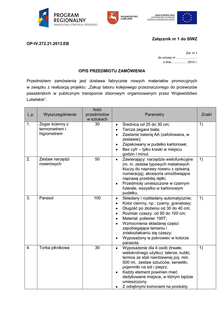 Załącznik nr 1 do SIWZ OP-IV.272.21.2013.EB Zał. nr 1 do umowy nr ………………… z dnia …………… 2013 r. OPIS PRZEDMIOTU ZAMÓWIENIA Przedmiotem zamówienia jest dostawa fabrycznie nowych materiałów promocyjnych w związku z realizacją projektu: „Zakup taboru kolejowego przeznaczonego do przewozów pasażerskich w publicznym transporcie zbiorowym organizowanym przez Województwo Lubelskie”. L.p. Wyszczególnienie Ilość przedmiotów w sztukach 30 1. Zegar ścienny z termometrem i higrometrem 2. Zestaw narzędzi rowerowych 50 3. Parasol 100 4. Torba piknikowa 30 Parametry Średnica od 25 do 30 cm; Tarcza zegara biała; Zasilanie baterią AA (zafoliowana, w zestawie); Zapakowany w pudełko kartonowe; Bez cyfr – tylko kreski w miejscu godzin i minut. Zawierający: narzędzie wielofunkcyjne (m. in. zestaw typowych metalowych kluczy do naprawy roweru z opisaną numeracją), akcesoria umożliwiające naprawę przebitej dętki; Przedmioty umieszczone w czarnym futerale, wszystko w kartonowym pudełku. Składany i rozkładany automatycznie; Kolor ciemny, np.: czarny, granatowy; Długość po złożeniu od 30 do 40 cm; Rozmiar czaszy: od 90 do 100 cm; Materiał: poliester 190T; Wzmocnienia składanej części zapobiegające łamaniu i zniekształcaniu się czaszy; Wyposażony w pokrowiec w kolorze parasola. Wyposażenie dla 4 osób (trwałe, wielokrotnego użytku): talerze, kubki, termos ze stali nierdzewnej poj. min. 500 ml, zestaw sztućców, serwetki, pojemniki na sól i pieprz; Każdy element powinien mieć dedykowane miejsce, w którym będzie umieszczony. Z odrębnymi komorami na produkty Znaki 1) 1) 1) 1) (chłodzoną wkładami) i na wyposażenie; Rozmiary: 35 x 30 x 25 cm (± 15 cm); Z uchwytem do niesienia i paskiem na ramię; Kolorystka pastelowa. 5. Torba zakupowa 150 Wykonana z juty; Uchwyty ze sznurka; Zapięcie na guzik; Wymiary: 45 x 35 x 15 cm (± 10 cm) 6. Kubek termiczny 100 Ze stali szlachetnej i plastiku (czarny) – wewnątrz stal nierdzewna; Przykrywka z zamykanym ustnikiem; Ergonomiczna, nienagrzewająca się rączka; Kształt podstawy powinien umożliwiać przewożenie kubka w samochodzie (na dedykowanym miejscu); Pojemność min. 400 ml. 7. Zestaw do pielęgnacji 50 Wyposażenie: dwie szczotki, metalowa obuwia łyżka do butów zintegrowana ze szczotką do ubrań, dwie pasty (czarna i bezbarwna) oraz gąbka do aplikacji pasty. Wszystko zapakowane w czarne etui, zamykane na suwak. 8. Pamięć USB 100 Pojemność min. 32 GB; (pendrive) Metalowe, w kształcie klucza; Pakowany w etui; Obudowa pamięci dwustronnie grawerowana laserowo. 9. Kalendarz trójdzielny 120 Główka kalendarza – wizualizacja na 2014 rok pojazdu zakupionego w projekcie (dostarczona przez Zamawiającego); Wypełnienie pozostałych przestrzeni w uzgodnieniu z Zamawiającym (logotypy RPO, dane adresowe). 10. Kalendarz biurkowy 50 Stojący; na 2014 rok W układzie tygodniowym (jedna strona – jeden tydzień), z możliwością nanoszenia notatek. 1) Zestaw znaków w układzie horyzontalnym: logo Narodowej Strategii Spójności + herb Województwa Lubelskiego + emblemat Unii Europejskiej, widok poglądowy: Opcjonalnie, w przypadku wystarczającej ilości miejsca i zapewnienia czytelności, dodatkowo: OP-IV.272.21.2013.EB Załącznik nr 1 do SIWZ - Opis przedmiotu zamówienia – materiały promocyjne do projektu „Zakup taboru kolejowego przeznaczonego do przewozów pasażerskich w publicznym transporcie zbiorowym organizowanym przez Województwo Lubelskie” 2/3 1) 1) 1) 1) 2) 2) hasło Regionalnego Programu Operacyjnego Województwa Lubelskiego na lata 2007 – 2013: Informacja o współfinansowaniu projektu: Projekt współfinansowany ze środków Europejskiego Funduszu Rozwoju Regionalnego w ramach Regionalnego Programu Operacyjnego Województwa Lubelskiego na lata 2007-2013 2) Zestaw znaków, jak w odnośniku 1) (wszystkie obowiązkowe) oraz dodatkowy napis o treści: „egzemplarz bezpłatny”. Znakowanie materiałów promocyjnych należy wykonać techniką dostosowaną do tworzywa, z którego wykonano dany produkt. Zestaw znaków (względnie napisów) oraz ich rozmieszczenie musi być zgodne z Wytycznymi dla Beneficjentów w zakresie informacji i promocji w ramach Regionalnego Programu Operacyjnego Województwa Lubelskiego na lata 2007 – 2013, publikowanymi na stronie www.rpo.lubelskie.pl (zakładka: Informacja i promocja > Obowiązki informacyjno-promocyjne). Rozmieszczenie znaków należy przekazać Zamawiającemu do akceptacji. W przypadku poz. 9 – 10 tabeli (kalendarze) należy uwzględnić kolorowe grafiki przedstawiające przedmiot promowanego projektu. Grafiki (względnie zdjęcia) dostarczy Zamawiający. Do zadania Wykonawcy będzie należało jednak wykonanie aranżacji (rozmieszczenia) i obróbki graficznej dostarczonych materiałów w porozumieniu z Zamawiającym. Zamawiający wymaga aby wszystkie dostarczone materiały spełniały odpowiednie normy krajowe i europejskie i były dopuszczone do użytkowania w Polsce. Realizacja niniejszego zamówienia powinna uwzględniać polityki horyzontalne Unii Europejskiej, w szczególności polityki ochrony środowiska. Tam, gdzie jest to możliwe i zgodne z zasadami gospodarności, stosować należy materiały ekologiczne. OP-IV.272.21.2013.EB Załącznik nr 1 do SIWZ - Opis przedmiotu zamówienia – materiały promocyjne do projektu „Zakup taboru kolejowego przeznaczonego do przewozów pasażerskich w publicznym transporcie zbiorowym organizowanym przez Województwo Lubelskie” 3/3