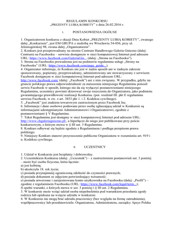 REGULAMIN KONKURSU „PREZENTY LUBIĄ KOBIETY” z dnia 26.02.2016 r. I. POSTANOWIENIA OGÓLNE 1. Organizatorem konkursu z okazji Dnia Kobiet „PREZENTY LUBIĄ KOBIETY”, zwanego dalej „Konkursem”, jest EM GRUPA z siedzibą we Wrocławiu 54-056, przy ul. Jeleniogórskiej 98, zwana dalej „Organizatorem”. 2. Konkurs jest przeprowadzany na stronie Centrum Handlowego Galeria Gniezno (dalej: Centrum) na Facebooku – serwisie dostępnym w sieci komputerowej Internet pod adresem URL: https://www.facebook.com/GaleriaGni... (dalej: „Strona na Facebooku”). 3. Strona na Facebooku prowadzona jest na podstawie regulaminu usługi „Strony na Facebooku” (URL: https://www.facebook.com/page_guide...). 4. Organizator informuje, że Konkurs nie jest w żaden sposób ani w żadnym zakresie sponsorowany, popierany, przeprowadzany, administrowany ani stowarzyszony z serwisem Facebook dostępnym w sieci komputerowej Internet pod adresem URL: http://www.facebook.com/ (dalej: „Facebook”) ani z nim związany. W przypadku, gdyby na gruncie polskiego prawa odpowiedzialność za naruszenia niniejszego Regulaminu ponosił serwis Facebook w sposób, którego nie da się wyłączyć postanowieniami niniejszego Regulaminu, uczestnicy powinni skierować swoje roszczenia do Organizatora, jako podmiotu gwarantującego prawidłowość realizacji Konkursu. (por. rozdział III. pkt E regulaminu serwisu Facebook, w zw. z art. 3853 pkt 1. i 2. Kodeksu cywilnego). 5. „Facebook” jest znakiem towarowym zastrzeżonym przez Facebook Inc. 6. Informacje i dane osobowe podawane przez osobę zgłaszającą udział w Konkursie są informacjami udostępnianymi Administratorowi i Organizatorowi, zgodnie z postanowieniami § V Regulaminu. 7. Tekst Regulaminu jest dostępny w sieci komputerowej Internet pod adresem URL: http://www.chgaleriagniezno.pl/, a hiperłącze do niego jest publikowane przy poście konkursowym, o którym mowa w § III ust. 3 Regulaminu. 8. Konkurs odbywać się będzie zgodnie z Regulaminem i podlega przepisom prawa polskiego. 9. Niniejszy Konkurs stanowi przyrzeczenie publiczne Organizatora w rozumieniu art. 919 i n. Kodeksu cywilnego. II. UCZESTNICY 1. Udział w Konkursie jest bezpłatny i dobrowolny. 2. Uczestnikiem Konkursu (dalej: „Uczestnik”) – z zastrzeżeniem postanowień ust. 3 poniżej – może być osoba fizyczna, która łącznie: a) jest kobietą; b) ukończyła 18. rok życia; c) posiada przynajmniej ograniczoną zdolność do czynności prawnych; d) posiada dokument ze zdjęciem potwierdzający tożsamość; e) posiada utworzone i zarejestrowane konto użytkownika na Facebooku (dalej: „Profil”) – zgodnie z regulaminem Facebooka (URL: https://www.facebook.com/legal/term...); f) spełni warunki, o których mowa w ust. 3 poniżej i § III ust. 2 Regulaminu. 3. W konkursie może wziąć udział osoba niepełnoletnia pod warunkiem przesłania zgody rodzica lub opiekuna na wzięcie udziału w konkursie. 4. W Konkursie nie mogą brać udziału pracownicy (bez względu na formę zatrudnienia), współpracownicy lub przedstawiciele: Organizatora, Administratora, zarządcy Apsys Polska S.A. z siedzibą w Warszawie, lokali handlowych lub usługowych na terenie Centrum, ani członkowie ich rodzin. Przez członków rodziny rozumie się na potrzeby Konkursu: wstępnych, zstępnych, rodzeństwo, małżonków, rodziców współmałżonka oraz osoby pozostające w stosunku przysposobienia. III. CZAS I WARUNKI KONKURSU 1. Konkurs rozpoczyna się w dniu 01.03.2016 r. o godzinie 12:30 i trwa do dnia 08.03.2016 r. do godziny 23:59, przez co rozumie się moment, do którego Uczestnicy mają prawo zgłaszać Odpowiedź w Konkursową określoną w ust. 4 poniżej. 2. Warunkami uczestnictwa w Konkursie są łącznie: a) wykonanie zadania konkursowego, o którym mowa w ust. 4 poniżej; b) zapoznanie się z treścią Regulaminu przed przystąpieniem do Konkursu; c) udzielenie zgód i przesłanie Organizatorowi informacji, oświadczeń i danych – zgodnie z postanowieniami ust. 6, 7, 8 poniżej oraz § IV ust. 8. 3. Organizator publikuje na Fanpage’u zadanie konkursowe przy użyciu funkcjonalności „Status” udostępnianej przez Facebook tzw. post (dalej: „Pytanie Konkursowe”). W treści Pytań Konkursowych Organizator publikuje również hiperłącze do adresu URL niniejszego Regulaminu (§ I ust. 7 Regulaminu). 4. Zadanie konkursowe polega na opublikowaniu komentarza do posta konkursowego przy pomocy funkcjonalności „Dodaj komentarz” („Napisz komentarz”) udostępnianej przez Facebook (dalej: „Odpowiedź Konkursowa”), w którym uczestnik musi wskazać 1 z 7 zestawów nagród zaprezentowanych na grafice konkursowej, który chce otrzymać wraz z wypowiedzią, dlaczego to właśnie on powinien otrzymać dany zestaw nagród. Odpowiedzi Konkursowe powinny być opublikowane przez Uczestnika do 08 marca 2016r. do godziny 23:59. Odpowiedź Konkursowa ma mieć formę: słowną lub słowno-graficzną – odpowiednio do Pytania Konkursowego oraz zgodnie z funkcjonalnościami udostępnianymi przez Facebook. 5. Uczestnik może opublikować dowolną ilość Odpowiedzi Konkursowych w czasie trwania Konkursu. 6. Opublikowanie Odpowiedzi Konkursowej jest równoznaczne z oświadczeniem, że Uczestnik jest wyłącznym twórcą tej Odpowiedzi Konkursowej i/lub że Uczestnikowi przysługują do niej (jako całości) nieograniczone osobiste i majątkowe prawa autorskie i prawa pokrewne, a także iż Odpowiedź Konkursowa nie narusza praw autorskich osób trzecich, uprawnień jakiejkolwiek osoby związanych z rozpowszechnianiem jej wizerunku, jest wolna od niedozwolonych zapożyczeń oraz nie mają miejsca żadne inne okoliczności, które mogłyby narazić Organizatora lub Administratora na odpowiedzialność wobec osób trzecich z tytułu eksploatacji Odpowiedzi Konkursowej na polach eksploatacji wymienionych w ust. 7 poniżej. Publikując Odpowiedź Konkursową, każdy Uczestnik godzi si