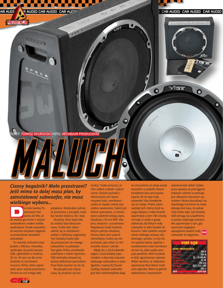 CAR AUDIO CAR AUDIO CAR AUDIO CAR AUDIO CAR AUDIO CAR AUDIO CAR AUDIO CAR AUDIO CAR AUDIO CAR AUDIO CAR AUDIO MALUCH TEKST: TOMASZ OKUROWSKI FOTO: ARCHIWUM PRODUCENTA Ciasny bagażnik? Mało przestrzeni? Jeśli mimo to dalej masz plan, by zainstalować subwoofer, nie masz wielkiego wyboru... D la mnie bomba. Po pierwszym meldunku od Vibe, że do redakcji gna kurier z nowym subwooferem, miałem wielkie wyobrażenia. Przede wszystkim, że wreszcie odzyskam bagażnik na przewożenie wszelakich rozmaitości. Te nadzieje wzbudził nowy projekt z Albionu: niewielka, zamknięta skrzynka basowa SQ8 z głośnikiem o średnicy 20 cm. W sam raz dla mnie. Znudziła mi się bowiem mocarna 30’tka, która zajmowała sporo wolnej przestrzeni. Zmiana na coś innego była 112 pożądana. Wiedziałem jednak, że przemiana z początku może być bardzo bolesna. No i była. Skrzynka, która dojechała do redakcji była fabrycznie nowa. Trzeba było zatem uzbroić się w cierpliwość i zadbać o delikatną rozgrzewkę. Tym bardziej trudno było się przyzwyczaić do nowego subwoofera na pokładzie. Tam gdzie 30’tka umożliwiała szaleństwo z niskim rejestrem, SQ8 nieśmiało odzywał się bardzo delikatnym pomrukiem. Praw fizyki oszukać się nie da. Na początku jest więcej czasu, by przyjrzeć się kon- strukcji. Trzeba przyznać, że Vibe zadbał o detale i wykończenie. Głośnik pochodzi z referencyjnej serii Space: masywny kosz, membrana i cewka ze stopów metali oraz solidne zawieszenie. Całość jest dobrze spasowana, a chromowane ozdobniki dodają szyku. Obudowę z 18 mm MDF sklejono, skręcono i uszczelniono. Wątpliwości budzi materiał, którym pokryto obudowę. Dziwny lakier jest szalenie niemedialny; trudno się nim pochwalić, gdy widać na nim wszelkie otarcia i odciski. Mijały dni, a SQ 8 nabierało wigoru. Coraz bardziej zapominałem o obecności znacznie większego subwoofera w aucie. Zgodnie z nazwą SQ (Sound Quality), brytyjski subwoofer grał dość wstrzemięźliwie dając do zrozumienia, że celuje przede wszystkim w audiofili, którym kompletnie obce jest basowe łupanie. Bo do tego mały subwoofer Vibe kompletnie się nie nadaje. Próżne zatem nadzieje tych, którzy liczyli na mega zabawę z małej skrzynki. Zapomnijcie o tym. Vibe zresztą nie kryje, iż celuje w grupę odbiorców, dla których mały subwoofer to tylko kwiatek do kożucha. Takie subtelne uzupełnienie solidnego zestawu trójdrożnego z przodu. I w tej mierze wypada dobrze. Zgodnie z oczekiwaniami mała membrana nie leni się, tylko szybko pompuje powietrze. Robi to jednak w dość ograniczonym zakresie. Widać wyraźnie, że radykalnie ograniczony litraż tłamsi możliwości głośnika. Mimo to głośnik wybrzmiewa z przyzwoitym wykończeniem detali. Szybka praca sprawia, że przeciąganie kolejnych uderzeń w perkusję jest całkowicie nieznanym zjawiskiem. Można doszukiwać się twardszego brzmienia na miarę dobrego kick basu. Im jednak niżej trzeba zejść, tym bardziej SQ8 domaga się uzupełnienia w postaci większego partnera. Nie zapominajcie o tym, gdy zauroczeni wyglądem zapragniecie wsadzić mały subwoofer do bagażnika. VIBE SQ8 DANE PRODUCENTA Moc RMS 300 W Moc maks 900 W Pasmo 36 – 28 000 Hz Skuteczność 91 dB Średnica woofera 200 mm Obudowa 265 x 315 x 180 Cena zestawu 549 zł INFO AUTO FAN