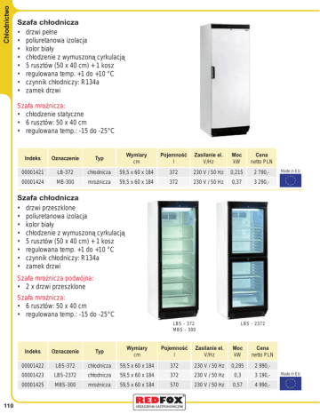Chłodnictwo Szafa chłodnicza • drzwi pełne • poliuretanowa izolacja • kolor biały • chłodzenie z wymuszoną cyrkulacją • 5 rusztów (50 x 40 cm) + 1 kosz • regulowana temp. +1 do +10 °C • czynnik chłodniczy: R134a • zamek drzwi Szafa mroźnicza: • chłodzenie statyczne • 6 rusztów: 50 x 40 cm • regulowana temp.: -15 do -25°C Indeks Oznaczenie Typ Wymiary cm Pojemność l Zasilanie el. V/Hz Moc kW Cena netto PLN 00001421 LB-372 chłodnicza 59,5 x 60 x 184 372 230 V / 50 Hz 0,215 2 790,- 00001424 MB-300 mroźnicza 59,5 x 60 x 184 372 230 V / 50 Hz 0,37 3 290,- Made in EU Szafa chłodnicza • drzwi przeszklone • poliuretanowa izolacja • kolor biały • chłodzenie z wymuszoną cyrkulacją • 5 rusztów (50 x 40 cm) + 1 kosz • regulowana temp. +1 do +10 °C • czynnik chłodniczy: R134a • zamek drzwi Szafa mroźnicza podwójna: • 2 x drzwi przeszklone Szafa mroźnicza: • 6 rusztów: 50 x 40 cm • regulowana temp.: -15 do -25°C LBS - 372 MBS - 300 Oznaczenie Typ Wymiary cm Pojemność l Zasilanie el. V/Hz Moc kW Cena netto PLN 00001422 LBS-372 chłodnicza 59,5 x 60 x 184 372 230 V / 50 Hz 0,295 2 990,- 00001423 LBS-2372 chłodnicza 59,5 x 60 x 184 372 230 V / 50 Hz 0,3 3 190,- 00001425 MBS-300 mroźnicza 59,5 x 60 x 184 570 230 V / 50 Hz 0,57 4 990,- Indeks 110 LBS - 2372 Made in EU Chłodnictwo Szafa chłodnicza • poliuretanowa izolacja • stalowa obudowa powlekana białą powłoką antykorozyjną • wnętrze bezpieczne dla żywności • solidne drzwi z magnetyczną uszczelką • na życzenie odwrotnie otwierane drzwi • 2 regulowane nóżki i 2 kółka ułatwiające transport • cyfrowy termometr • mechaniczna regulacja z automatycznym rozmrażaniem • hermetyczny kompresor z zabezpieczeniem • statyczny system kondensacyjny z wentylatorem • ilość półek: 5 (65 x 53 cm) + 1 • regulowana temp.: +0° do +8°C • czynnik chłodniczy: R134a • zamek drzwi Szafa mroźnicza • dwie regulowane nóżki • cyfrowy termometr • ilość półek: 6 (65 x 53 cm) + 1 • regulowana temp.: -18° do -25°C • czynnik chłodniczy: R404a system kondensacyjny Made in EU Oznaczenie Typ Wymiary cm Pojemność l Zasilanie el. V/Hz Moc kW Cena netto PLN 00001429 LB-640 chłodnicza 77,5 x 73 x 186,5 640 230 V / 50 Hz 0,24 3 990,- 00001430 MB-640 mroźnicza 77,5 x 73 x 186,5 640 230 V / 50 Hz 0,24 4 550,- Indeks 111 Chłodnictwo Szafa chłodnicza • wykonanie nierdzewne • temperatura 0°C do +8°C • ruszty białe z tworzywa o wymiarze GN 2/1 • chłodzenie z wymuszoną cyrkulacją • czynnik chłodniczy: R134a • zamek drzwi Szafa mroźnicza: • temperatura -18°C do -22°C • rozmrażanie ręczne Indeks Wymiary cm Made in EU RT - 142L RT - 142M RT - 70L RT - 70M Pojemność l (brutto/netto) Ilość rusztów Zasilanie el. V/Hz Moc kW Cena netto PLN Oznaczenie Typ 00007348 RT-70L chłodnicza 71 x 80 x201 700 / 600 3 230 V / 50 Hz 0,48 4 450,- 00007350 RT-70M mroźnicza 71 x 80 x201 700 / 600 3 230 V / 50 Hz 0,88 5 650,- 00007349 RT-142L chłodnicza 140 x 80 x201 1400 / 1300 6 230 V / 50 Hz 0,71 6 800,- 00007351 RT-142M mroźnicza 140 x 80 x201 1400 / 1300 6 230 V / 50 Hz 1,32 7 800,- Chłodziarka podblatowa • wykonanie nierdzewne (zewnętrzne) • cyfrowy pomiar temperatury • zamek drzwi • temperatura 0°C do +8°C • 3x ruszt biały z tworzywa • chłodzenie z wymuszoną cyrkulacja • czynnik chłodniczy: R134a Zamrażarka podblatowa: • temperatura -10°C do -24°C • chłodzenie statyczne • rozmrażanie ręczne 112 Made in EU Indeks Oznaczenie Typ Wymiary cm Pojemność l (brutto/netto) Zasilanie el. V/Hz Moc kW Cena netto PLN 00007346 UR 200S chłodziarka 60 x 62 x 84,5 200 / 130 230 V / 50 Hz 0,15 1 890,- 00007347 UF 200S zamrażarka 60 x 62 x 84,5 200 / 130 230 V / 50 Hz 0,15 2 090,- Chłodnictwo Stół chłodniczy dwudrzwiowy • automatyczne odmrażanie • wykonanie nierdzewne • elektroniczna jednostka sterująca • wewnętrzny wentylator • 2x ruszt na prowadnicach • nierdzewna płyta robocza • temperatura komory chłodniczej +2°C / +8°C • czynnik chłodniczy: R134a Indeks Oznaczenie Wymiary cm Zasilanie el. V/Hz Moc kW Cena netto PLN 00001407 ST - 902 90 x 70 x 85 230 V / 50 Hz 0,24 2 990,- Made in EU Stół chłodniczy na sałatki • automatyczne odmrażanie • wykonanie nierdzewne • elektroniczna jednostka sterująca • wewnętrzny wentylator • 2x ruszt na prowadnicach • polietylenowa deska do krojenia • nierdzewna otwierana pokrywa • temperatura komory chłodniczej +2°C / +8°C • pojemność GN - 2x GN 1/1 + 2x GN 1/4 • czynnik chłodniczy: R134a Indeks Oznaczenie Wymiary cm Zasilanie el. V/Hz Moc kW Cena netto PLN 00001402 S - 900 90 x 70 x 85 230 V / 50 Hz 0,24 2 790,- Made in EU Stół chłodniczy czteroszufladowy • automatyczne odmrażanie • wykonanie nierdzewne • elektroniczna jednostka sterująca • wewnętrzny wentylator • 4x szuflada • nierdzewna płyta robocza • temperatura komory chłodniczej +2°C / +8°C • czynnik chłodniczy: R134a Indeks Oznaczenie Wymiary cm Zasilanie el. V/Hz Moc kW Cena netto PLN 00007344 SZ - 902 90 x 70 x 85 230 V / 50 Hz 0,24 4 900,- Made in EU 113 Chłodnictwo Stół do pizzy dwudrzwiowy • automatyczne odmrażanie • granitowa płyta robocza • pojemność nadstawki: 5x GN 1/6 + nierdzewna higieniczna osłona • wykonanie nierdzewne • wewnętrzny wentylator • 2x ruszt na prowadnicach • temperatura komory chłodniczej +2°C / +8°C • czynnik chłodniczy: R134a Indeks Oznaczenie Wymiary cm Zasilanie el. V/Hz Moc kW Cena netto PLN 00001406 SP - 902 90 x 70 x 85 230 V / 50 Hz 0,25 3 190,- Made in EU Stół do pizzy trzydrzwiowy z chłodzoną witrynką • automatyczne odmrażanie • granitowa płyta robocza • pojemność nadstawki: 6x GN 1/4 • wykonanie nierdzewne • elektroniczna jednostka sterująca • wewnętrzny wentylator • 3x ruszt na prowadnicach • temperatura komory chłodniczej +2°C / +10°C •