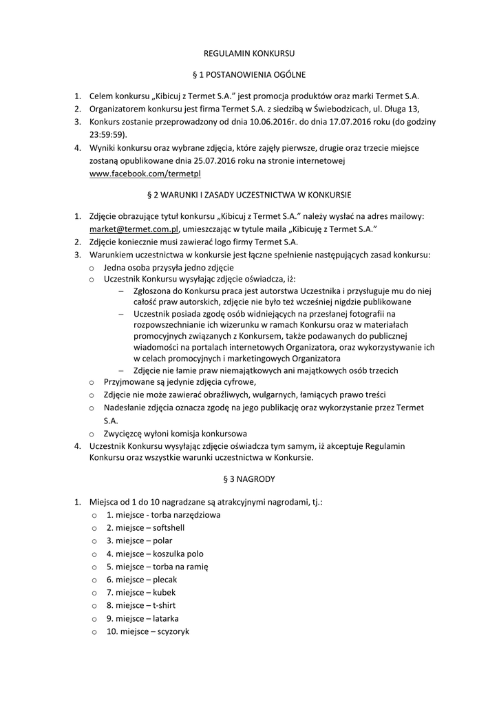 REGULAMIN KONKURSU § 1 POSTANOWIENIA OGÓLNE 1. Celem konkursu „Kibicuj z Termet S.A.” jest promocja produktów oraz marki Termet S.A. 2. Organizatorem konkursu jest firma Termet S.A. z siedzibą w Świebodzicach, ul. Długa 13, 3. Konkurs zostanie przeprowadzony od dnia 10.06.2016r. do dnia 17.07.2016 roku (do godziny 23:59:59). 4. Wyniki konkursu oraz wybrane zdjęcia, które zajęły pierwsze, drugie oraz trzecie miejsce zostaną opublikowane dnia 25.07.2016 roku na stronie internetowej www.facebook.com/termetpl § 2 WARUNKI I ZASADY UCZESTNICTWA W KONKURSIE 1. Zdjęcie obrazujące tytuł konkursu „Kibicuj z Termet S.A.” należy wysłać na adres mailowy: [email protected], umieszczając w tytule maila „Kibicuję z Termet S.A.” 2. Zdjęcie koniecznie musi zawierać logo firmy Termet S.A. 3. Warunkiem uczestnictwa w konkursie jest łączne spełnienie następujących zasad konkursu: o Jedna osoba przysyła jedno zdjęcie o Uczestnik Konkursu wysyłając zdjęcie oświadcza, iż: Zgłoszona do Konkursu praca jest autorstwa Uczestnika i przysługuje mu do niej całość praw autorskich, zdjęcie nie było też wcześniej nigdzie publikowane Uczestnik posiada zgodę osób widniejących na przesłanej fotografii na rozpowszechnianie ich wizerunku w ramach Konkursu oraz w materiałach promocyjnych związanych z Konkursem, także podawanych do publicznej wiadomości na portalach internetowych Organizatora, oraz wykorzystywanie ich w celach promocyjnych i marketingowych Organizatora Zdjęcie nie łamie praw niemajątkowych ani majątkowych osób trzecich o Przyjmowane są jedynie zdjęcia cyfrowe, o Zdjęcie nie może zawierać obraźliwych, wulgarnych, łamiących prawo treści o Nadesłanie zdjęcia oznacza zgodę na jego publikację oraz wykorzystanie przez Termet S.A. o Zwycięzcę wyłoni komisja konkursowa 4. Uczestnik Konkursu wysyłając zdjęcie oświadcza tym samym, iż akceptuje Regulamin Konkursu oraz wszystkie warunki uczestnictwa w Konkursie. § 3 NAGRODY 1. Miejsca od 1 do 10 nagradzane są atrakcyjnymi nagrodami, tj.: o 1. miejsce - torba narzędziowa o 2. miejsce – softshell o 3. miejsce – polar o 4. miejsce – koszulka polo o 5. miejsce – torba na ramię o 6. miejsce – plecak o 7. miejsce – kubek o 8. miejsce – t-shirt o 9. miejsce – latarka o 10. miejsce – scyzoryk 2. Wszelkie wątpliwości dotyczące zasad Konkursu, postanowień jego Regulaminu i interpretacji rozstrzyga Organizator. 3. Zdobywcy nagród zostaną powiadomieni o wygranej pocztą elektroniczną w przeciągu 7 (siedmiu) dni roboczych od ogłoszenia wyników, na adres mailowy, z którego zostało nadesłane zdjęcie 4. Celem potwierdzenia przyjęcia nagrody, powiadomiony Zdobywca powinien przekazać dane korespondencyjne pocztą elektroniczną na adres mailowy: [email protected] w terminie siedmiu dni od dnia wysłania powiadomienia, celem wysłania nagrody konkursowej. § 4 DANE OSOBOWE UCZESTNIKÓW KONKURSU 1. Przystępując do Konkursu i akceptując niniejszy regulamin Uczestnik wyraża zgodę na przetwarzanie jego danych osobowych przez Organizatora. Dane będą przetwarzane w celu przeprowadzenia Konkursu oraz w związku z wydaniem nagrody. § 5 POSTANOWIENIA KOŃCOWE Organizator ma prawo do zmiany postanowień niniejszego Regulaminu, o ile nie wpłynie to na pogorszenie warunków uczestnictwa w Konkursie. Dotyczy to w szczególności zmian terminów poszczególnych czynności konkursowych. Zmieniony Regulamin obowiązuje od czasu opublikowania go na stronie www.facebook.com/termet.pl