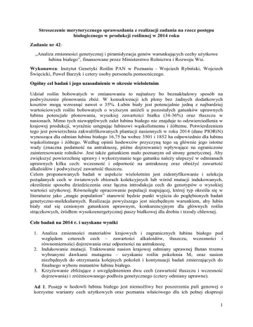 Streszczenie merytorycznego sprawozdania z realizacji zadania na rzecz postępu biologicznego w produkcji roślinnej w 2014 roku Zadanie nr 42: „Analiza zmienności genetycznej i piramidyzacja genów warunkujących cechy użytkowe łubinu białego”, finansowane przez Ministerstwo Rolnictwa i Rozwoju Wsi. Wykonawca: Instytut Genetyki Roślin PAN w Poznaniu - Wojciech Rybiński, Wojciech Święcicki, Paweł Barzyk i cztery osoby personelu pomocniczego. Ogólny cel badań i jego uzasadnienie w okresie wieloletnim Udział roślin bobowatych w zmianowaniu to najtańszy bo beznakładowy sposób na podwyższenie plonowania zbóż. W konsekwencji ich plony bez żadnych dodatkowych kosztów mogą wzrosnąć nawet o 35%. Łubin biały jest potencjalnie jedną z najbardziej wartościowych roślin bobowatych o wyższym aniżeli u pozostałych gatunków uprawnych łubinu potencjale plonowania, wysokiej zawartości białka (34-36%) oraz tłuszczu w nasionach. Mimo tych niewątpliwych zalet łubinu białego nie znajduje to odzwierciedlenia w krajowej produkcji, wyraźnie ustępując łubinowi wąskolistnemu i żółtemu. Potwierdzeniem tego jest powierzchnia zakwalifikowanych plantacji nasiennych w roku 2014 (dane PIORiN) wynosząca dla odmian łubinu białego 16,75 ha wobec 3501 i 1852 ha odpowiednio dla łubinu wąskolistnego i żółtego. Według opinii hodowców przyczyną tego są głównie jego istotne wady (znaczna podatność na antraknozę, późne dojrzewanie) wpływające na ograniczone zainteresowanie rolników. Jest także gatunkiem mało poznanym od strony genetycznej. Aby zwiększyć powierzchnię uprawy i wykorzystanie tego gatunku należy ulepszyć w odmianach uprawnych kilka cech: wczesność i odporność na antraknozę oraz obniżyć zawartość alkaloidów i podwyższyć zawartość tłuszczu. Celem proponowanych badań w aspekcie wieloletnim jest zidentyfikowanie i selekcja pożądanych cech w światowych zbiorach kolekcyjnych lub wśród mutacji indukowanych, określenie sposobu dziedziczenia oraz łączna introdukcja cech do genotypów o wysokiej wartości użytkowej. Równoległe opracowanie populacji mapującej, której typ określa się w literaturze jako „magic population” stanowić będzie punkt wyjścia do pogłębionych badań genetyczno-molekularnych. Realizacja powyższego jest niezbędnym warunkiem, aby łubin biały stał się cenionym gatunkiem uprawnym, konkurencyjnym dla głównych roślin strączkowych, źródłem wysokoenergetycznej paszy białkowej dla drobiu i trzody chlewnej. Cele badań na 2014 r. i uzyskane wyniki 1. Analiza zmienności materiałów krajowych i zagranicznych łubinu białego pod względem czterech cech – zawartości alkaloidów, tłuszczu, wczesności i równomierności dojrzewania oraz odporności na antraknozę. 2. Indukowanie mutacji. Traktowanie nasion krajowej odmiany uprawnej Butan trzema wybranymi dawkami mutagenu – uzyskanie roślin pokolenia M1 oraz nasion niezbędnych do otrzymania kolejnych pokoleń i kontynuacji badań zmierzających do finalnego wyboru mutantów łubinu białego. 3. Krzyżowanie zbliżające z uwzględnieniem dwu cech (zawartość tłuszczu i wczesność dojrzewania) i zróżnicowanego podłoża genetycznego (cztery odmiany uprawne). Ad 1. Postęp w hodowli łubinu białego jest niemożliwy bez poszerzenia puli genowej o korzystne warianty cech użytkowych oraz poznania właściwego dla ich pełnej ekspresji 1 podłoża genetycznego. Stąd materiał badawczy stanowiło 150 obiektów pochodzących z światowych zasobów genowych łubinu białego analizowanych na podstawie dostępnej bazy danych i testów polowo-laboratoryjnych. Oceniane kolekcjonowane formy dzikie i prymitywne, odmiany lokalne, mutanty i odmiany uprawne charakteryzowały się szerokim zakresem zmienności zawartości alkaloidów w nasionach, począwszy od form niskoalkaloidowych do form o wysokiej zawartości. Mimo, że średnia zawartość alkaloidów była stosunkowo wysoka na poziomie ponad 3 %, zidentyfikowano formy niskoalkaloidowe o zróżnicowanym pochodzeniu geograficznym reprezentowane głównie przez odmiany lokalne. W profilu alkaloidów dominowała obecność lupaniny, stanowiącej średnio 73 % sumy alkaloidów, będąc tym samym specyficznym alkaloidem, typowym dla łubinu białego. Pozostałe alkaloidy jak: hydrosksylupanina, multiflorina i angustifolina stanowiły uzupełnienie struktury alkaloidów. Nasiona obiektów kolekcyjnych okazały się bogatym źródłem zmienności zawartości tłuszczu w szerokim zakresie od 7 do 14 % i przewyższają pod tym względem nasiona zarówno łubinu żółtego jak i wąskolistnego. Uzyskana zmienność pozwoliła na identyfikację form wysokotłuszczowych umożliwiając tym samym ich wykorzystanie w dalszych etapach badań. W profilu kwasów tłuszczowych nasion łubinu białego dominującym okazał się kwas oleinowy oraz linolowy stanowiących ponad 70 % udziału wszystkich kwasów tłuszczowych. Mniejsza jest zwartość kwasu linolenowego, palmitynowego, stearynowego, eikozenowego oraz erukowego. Wykazano ponadto korzystny stosunek kwasów omega–3 do omega-6. Stosunek ten, 1:2 (niekorzystny dla nasion łubinu żółtego czy wąskolistnego) według danych literaturowych uważany jest za prawie idealny z punktu widzenia potrzeb żywnościowych. Pośród ocenianych obiektów kolekcyjnych po infekcji roślin w szklarni przez grzyb Colletotrichum lupini nie zidentyfikowano form o pełnej odporności na antraknozę. Stwierdzono natomiast szeroki zakres reakcji roślin na infekcję wyrażony zróżnicowanym stopniem porażenia w odniesieniu do poszczególnych obiektów kolekcyjnych. Formy o najmniejszym stopniu podatności (zwiększonej tolerancji) na antraknozę mogą zostać wykorzystane na dalszych etapach prac zadania badawczego. Z kolei na podstawie obserwacji polowych materiałów kolekcyjnych zidentyfikowano linie o wcześniejszym dojrzewaniu, które stanowić będą materia