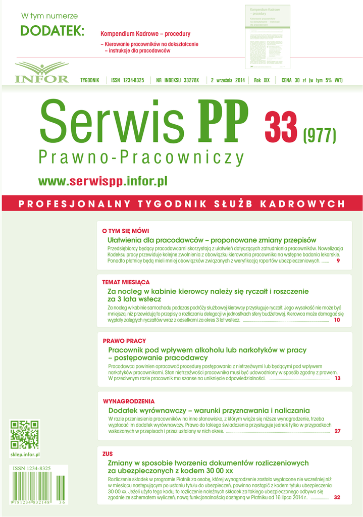 W tym numerze DODATEK: Kompendium Kadrowe – procedury – Kierowanie pracowników na dokształcanie – instrukcje dla pracodawców TYGODNIK ISSN 1234-8325 NR INDEKSU 33278X 2 września 2014 Rok XIX CENA 30 zł (w tym 5% VAT) Serwis PP 33 (977) Prawno-Pracowniczy www.serwispp.infor.pl PROFESJONALNY TYGODNIK SŁUŻB KADROWYCH O TYM SIĘ MÓWI Ułatwienia dla pracodawców – proponowane zmiany przepisów Przedsiębiorcy będący pracodawcami skorzystają z ułatwień dotyczących zatrudniania pracowników. Nowelizacja Kodeksu pracy przewiduje kolejne zwolnienia z obowiązku kierowania pracownika na wstępne badania lekarskie. Ponadto płatnicy będą mieli mniej obowiązków związanych z weryfikacją raportów ubezpieczeniowych. ....... 9 TEMAT MIESIĄCA Za nocleg w kabinie kierowcy należy się ryczałt i roszczenie za 3 lata wstecz Za nocleg w kabinie samochodu podczas podróży służbowej kierowcy przysługuje ryczałt. Jego wysokość nie może być mniejsza, niż przewidują to przepisy o rozliczaniu delegacji w jednostkach sfery budżetowej. Kierowca może domagać się wypłaty zaległych ryczałtów wraz z odsetkami za okres 3 lat wstecz. ................................................................................... 10 PRAWO PRACY Pracownik pod wpływem alkoholu lub narkotyków w pracy – postępowanie pracodawcy Pracodawca powinien opracować procedurę postępowania z nietrzeźwymi lub będącymi pod wpływem narkotyków pracownikami. Stan nietrzeźwości pracownika musi być udowodniony w sposób zgodny z prawem. W przeciwnym razie pracownik ma szanse na uniknięcie odpowiedzialności. .......................................................... 13 WYNAGRODZENIA Dodatek wyrównawczy – warunki przyznawania i naliczania W razie przeniesienia pracowników na inne stanowisko, z którym wiąże się niższe wynagrodzenie, trzeba wypłacać im dodatek wyrównawczy. Prawo do takiego świadczenia przysługuje jednak tylko w przypadkach wskazanych w przepisach i przez ustalony w nich okres. .................................................................................................... 27 ZUS ISSN 1234-8325 Zmiany w sposobie tworzenia dokumentów rozliczeniowych za ubezpieczonych z kodem 30 00 xx Rozliczenie składek w programie Płatnik za osobę, której wynagrodzenie zostało wypłacone nie wcześniej niż w miesiącu następującym po ustaniu tytułu do ubezpieczeń, powinno nastąpić z kodem tytułu ubezpieczenia 30 00 xx. Jeżeli użyto tego kodu, to rozliczenie należnych składek za takiego ubezpieczonego odbywa się zgodnie ze schematem wyliczeń, nową funkcjonalnością dostępną w Płatniku od 16 lipca 2014 r.. .................. 32 Zapraszamy na warsztaty T E M AT WA R S Z TAT Ó W T E R M I N I L O K A L I Z A C JA Zasiłki rodzicielskie - ustalanie uprawnień i podstawa wymiaru zasiłku. Praktyka stosowania 19 września 2014 r., Warszawa zmienionych przepisów, najnowsze orzecznictwo, wyjaśnienia ZUS, Ministerstwa Pracy oraz Państwowej Inspekcji Pracy. 469 zł (w tym 23% VAT) KO S Z T P R O WA D Z Ą C Y Renata Majewska W P R O G R A M I E WA R S Z TAT Ó W 1. Zasady udzielania i przyznawania pracownikowi podstawowego i dodatkowego urlopu macierzyńskiego, podstawowego i dodatkowego urlopu na warunkach macierzyńskiego oraz urlopu rodzicielskiego 2. Nabycie prawa do zasiłku macierzyńskiego 3. Wysokość zasiłku macierzyńskiego 4. Ustalanie podstawy wymiaru zasiłku macierzyńskiego pracowników 5. Podstawa wymiaru zasiłku macierzyńskiego dla osób niebędących pracownikami, z uwzględnieniem zmiany obowiązującej od 1.12.2013 r. 6. Dokumentowanie prawa do zasiłku macierzyńskiego po zmianach 7. Ubezpieczenia społeczne i zdrowotne osób pobierających zasiłki macierzyńskie 8. Uprawnienia pracowników przebywających na zasiłkach macierzyńskich Więcej informacji na stronie www.okk.infor.pl INFORMACJE I ZAMÓWIENIA: www.sklep.infor.pl [email protected] 22 212 07 30 SPIS TREŚCI Spis treści AKTUALNOŚCI Przegląd zmian prawa ............................................ 4 Kiedy przysługuje prawo do zasiłku chorobowego w związku z wypadkiem przy pracy zleceniobiorcy ......................................................... 35 Kalendarz ważnych terminów .............................. 5 Wskaźniki i stawki ................................................. 6 DZIAŁALNOŚĆ SOCJALNA Sposoby dofinansowania wyprawki szkolnej O TYM SIĘ MÓWI dla dziecka pracownika ......................................... 37 Ułatwienia dla pracodawców – proponowane O TO PYTAJĄ KADROWI zmiany przepisów ................................................... 9 Czy w razie skrócenia okresu wypowiedzenia TEMAT MIESIĄCA – PRZEŁOMOWE WYROKI SN I TK z tytułu zwolnień grupowych pracownik straci prawo do wyższej odprawy ................................... 39 Czy w umowie o pracę można zmienić Za nocleg w kabinie kierowcy należy się ryczałt właściwość sądu, który będzie rozstrzygał spory i roszczenie za 3 lata wstecz ................................... 10 pracownicze ............................................................. 39 Czy można zawierać wieloletnie umowy o pracę PRAWO PRACY na czas określony .................................................... 39 Pracownik pod wpływem alkoholu Czy skrócony okres wypowiedzenia umowy lub narkotyków w pracy – postępowanie o pracę wpływa na prawo do urlopu .................... 39 pracodawcy .............................................................. 13 Z WOKANDY Z kim należy podpisać umowę o pracę w celu Nie każde naganne zachowanie pracownika przygotowania zawodowego – z młodocianym uzasadnia rozwiązanie umowy o pracę czy z jego rodzicami ............................................... 17 bez wypowiedzenia ................................................ 40 PYTANIA Z FORUM WYNAGRODZENIA Jak wyliczać wskaźnik zatrudnienia i kiedy Dodatek wyrównawczy – warunki przyznawania nale