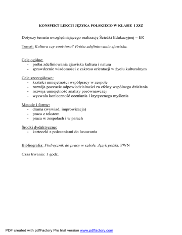 KONSPEKT LEKCJI JĘZYKA POLSKIEGO W KLASIE I ZSZ Dotyczy tematu uwzględniającego realizację Ścieżki Edukacyjnej – ER Temat: Kultura czy cool-tura? Próba zdefiniowania zjawiska. Cele ogólne: - próba zdefiniowania zjawiska kultura i natura - sprawdzenie wiadomości z zakresu orientacji w życiu kulturalnym Cele szczegółowe: - kształci umiejętności współpracy w zespole - rozwija poczucie odpowiedzialności za efekty wspólnego działania - rozwija umiejętność analizy porównawczej - wyzwala konieczność oceniania i krytycznego myślenia Metody i formy: - drama (wywiad, improwizacja) - praca z tekstem - praca w zespołach i w parach Środki dydaktyczne: - karteczki z poleceniami do losowania Bibliografia: Podręcznik do pracy w szkole. Język polski. PWN Czas trwania: 1 godz. PDF created with pdfFactory Pro trial version www.pdffactory.com Przebieg lekcji: - - zapisanie tematu lekcji na tablicy zapoznanie z celem i charakterem pracy na lekcji rozdanie kartek po jednej na rząd uczniowie na otrzymanych kartkach zapisują własne refleksje na temat: „co to jest kultura?”, czytając poprzednią wypowiedź ucznia, ponieważ uwagi nie mogą się powtarzać, pracują w rzędach tj. zespołach , posyłając kartkę, wygrywa zespół, który pierwszy ukończył zadanie sprawdzenie wykonanego zadania odczytanie z podręcznika różnych definicji pojęcia kultura i porównanie ich z refleksjami uczniów, zapisanie notatki w zeszycie kolejne zadanie polega na zdefiniowaniu pojęcia natura, uczniowie pracują tak jak poprzednio (zmiana kolejności posyłania kartek) odczytanie zadania i porównanie z definicją jaką podaje podręcznik, zapisanie notatki w zeszycie na tablicy schemat – kultura i jej rodzaje przyporządkowanie pojęć odpowiednio kulturze masowej i wysokiej (ochotnicy losują karteczki i przypisują odpowiednio ww pojęciom) klasa opowiada się po wybranej stronie, tworząc tym samym dwa zespoły dyskusja między zespołami jako próba przekonania obozu przeciwnego o wartościach kultury masowej lub elitarnej dwóch ochotników otrzymuje polecenia typu – przeprowadź wywiad z..., ochotnicy opracowują zestaw pytań dla swych rozmówców, których następnie wybierają z klasy i przeprowadzają wywiad Zad. dom. Przygotuj spis treści czasopisma – „Kultura Masowa” lub „Kultura przez duże K” oraz projekt okładki. Oprac.: D. Talik PDF created with pdfFactory Pro trial version www.pdffactory.com KONSPEKT LEKCJI J. POLSKIEGO W KLASIE I Technikum TEMAT: Dlaczego nikt nie mieszka na wyspie Utopii? METODY: metoda przekładu intersemiotycznego FORMY: praca indywidualna i zbiorowa. CELE: uczeń powinien: - dokonać przekładu intersemiotycznego (obrazowe przedstawienie treści utworu ), - znać i rozumieć termin utopia, - porównać własną analizę tekstu z odczytaniem utworu przez innych uczniów, - samodzielnie zinterpretować omawiany na lekcji wiersz, ŚRODKI DYDAKTYCZNE: Podręcznik do pracy w domu. Język polski (literatura i nauka o języku ). Tekst Wisławy Szymborskiej pt. Utopia. Czyste kartki papieru, KLUCZOWE POJĘCIA: utopia; symbol drzewa, jaskini, CZAS TRWANIA LEKCJI: 1-2 godz. PRZEBIEG LEKCJI: 1. Odczytanie wiersza Wisławy Szymborskiej pt. Utopia (nauczyciel). 2. Ponowne odczytanie utworu (każdy uczeń po cichu). 3. Uczniowie rysują na kartkach mapę wyspy uwzględniając realia przedstawione w utworze. 4. Rozłożenie rysunków pod tablicą, obejrzenie przez uczniów prac wykonanych przez innych, porównanie ze swoją pracą. 5. Wybrany uczeń wskazuje elementy powtarzające się na wszystkich rysunkach. Wypisanie ich na tablicy. jezioro jaskinia dolina las morze WYSPA droga szczyt krzaki drzewo 6. Wyszukiwanie w tekście określeń do podanych haseł. DROGA DRZEWO KRZAKI droga dojścia drzewo Słusznego Domysłu, drzewo Zrozumienia krzaki z odpowiedziami PDF created with pdfFactory Pro trial version www.pdffactory.com źródło ŻRÓDŁO DOLINA JASKINIA JEZIORO SZCZYT Ach Więc To Tak dolina Oczywistości w której mieszka Sens jezioro Głębokiego Przekonania Pewność Niewzruszona, Istota Rzeczy Pytania dotyczące wymienionych haseł: Czy istnieją w rzeczywistości miejsca wymienione przez poetkę? Gdzie zatem one się znajdują? (Na wyspie Utopii). A gdzie leży wyspa Utopia? (Nie ma takiej wyspy). Co to więc takiego Utopia? Czas do namysłu. Uczniowskie próby odczytania znaczenia tego terminu. Podyktowanie terminu utopia (nie mająca szans urzeczywistnienia i nie licząca się z realnym stanem rzeczy i stosunków społecznych wizja idealnego społeczeństwa, potocznie mrzonka, plan, pomysł, idealny, ale nieżyciowy, nieziszczalny. Do jakiej dziedziny życia odnoszą się te pojęcia? (do sfery ludzkiego poznania) Interpretacja symboli występujących w tekście (nauczyciel). SYMBOL DRZEWA (drzewo poznania dobra i zła. Adam i Ewa spożyli owoc tego drzewa i nauczyli się dokonywać wyborów moralnych), ,,Nie ma bowiem drzewa dobrego, które by rodziło owoc zły, ani...” [Ewangelia Św. Łukasza] Zatem ludzi można oceniać po owocach ich działania. To człowiek musi dokonać wyboru między dobrem i złem. W wierszu Szymborskiej jest na odwrót. Człowiek nie musi wybierać, wszystko jest jasne i jednoznaczne. SYMBOL JASKINI (1ks. Samuela – Dawid schronił się w jaskini Adullam a wraz z nim wszyscy uciśnieni), symbol zwątpienia, jaskinia Platona, symbol znikomości wiedzy ludzkiej, mizernych perspektyw poznania); ludzie w jaskini przyjmują poznawane za pomocą zmysłów ,,rzeczy” za rzeczywiste, a one są jedynie odbiciem, cieniem idei), u Szymborskiej w jaskini leży sens, a więc znów na odwrót. Dlaczego na wyspie nikt nie mieszka? (Życie na wyspie, która rozstrzygała ludzkie wątpliwości, ułatwiała wybory moralne, okazało się niemożliwe. Według Szymborskiej prawda nie powinna być człowiekowi dana, lecz musi być przez niego doświadczona na drodze prób i błędów. Rzeczą ludzką jest błądzić, 