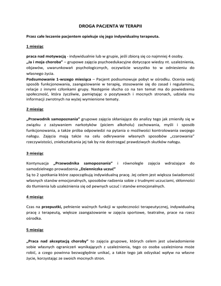 DROGA PACJENTA W TERAPII Przez całe leczenie pacjentem opiekuje się jego indywidualny terapeuta. 1 miesiąc praca nad motywacją - indywidualnie lub w grupie, jeśli zbiorą się co najmniej 4 osoby. „Ja i moja choroba” – grupowe zajęcia psychoedukacyjne dotyczące wiedzy nt. uzależnienia, objawów, uwarunkowań psychologicznych, oczywiście wszystko to w odniesieniu do własnego życia. Podsumowanie 1-wszego miesiąca – Pacjent podsumowuje pobyt w ośrodku. Ocenia swój sposób funkcjonowania, zaangażowanie w terapię, stosowanie się do zasad i regulaminu, relacje z innymi członkami grupy. Następnie słucha co na ten temat ma do powiedzenia społeczność, która życzliwie, pamiętając o pozytywach i mocnych stronach, udziela mu informacji zwrotnych na wyżej wymienione tematy. 2 miesiąc „Przewodnik samopoznania” grupowe zajęcia skłaniające do analizy tego jak zmieniły się w związku z zażywaniem narkotyków (piciem alkoholu) zachowania, myśli i sposób funkcjonowania, a także próba odpowiedzi na pytania o możliwości kontrolowania swojego nałogu. Zajęcia mają także na celu odkrywanie własnych sposobów „czarowania” rzeczywistości, zniekształcania jej tak by nie dostrzegać prawdziwych skutków nałogu. 3 miesiąc Kontynuacja „Przewodnika samopoznania” i równolegle zajęcia wdrażające do samodzielnego prowadzenia „Dzienniczka uczuć” Są to 2 spotkania które zapoczątkują indywidualną pracę. Jej celem jest większa świadomość własnych stanów emocjonalnych, sposobów radzenia sobie z trudnymi uczuciami, skłonności do tłumienia lub uzależnienia się od pewnych uczuć i stanów emocjonalnych. 4 miesiąc Czas na przepustki, pełnienie ważnych funkcji w społeczności terapeutycznej, indywidualną pracę z terapeutą, większe zaangażowanie w zajęcia sportowe, teatralne, prace na rzecz ośrodka. 5 miesiąc „Praca nad akceptacją choroby” to zajęcia grupowe, których celem jest uświadomienie sobie własnych ograniczeń wynikających z uzależnienia, tego co osoba uzależniona może robić, a czego powinna bezwzględnie unikać, a także tego jak odzyskać wpływ na własne życie, korzystając ze swoich mocnych stron. 6 miesiąc Pacjent przygotowuje własny Życiorys i przedstawia go na Grupie zadaniowej. Dotychczas diagnozą i leczeniem objęty był głównie ten fragment życia pacjenta, który związany jest z braniem przez niego narkotyków. Dzięki życiorysowi istnieje możliwość przyjrzenia się swojemu życiu szerzej – przez pryzmat doświadczeń wczesnodziecięcych, okres wczesnoszkolny, okres dojrzewania i dorosłość. Pojawia się możliwość zrozumienia tych faktów i nadania im znaczenia w teraźniejszości, a zatem mogą one stanowić ważny element dalszej pracy terapeutycznej w ramach Grupy Zadaniowej oraz stanowić materiał do tworzenia Osobistego Planu Terapii. Podkreśla się także ich znaczenie z perspektywy zapobiegania nawrotom w uzależnieniu. Osobisty Plan Terapii, ma uwzględniać ważne problemy pacjenta, nie poruszane w głównym programie terapii. 7 miesiąc Realizacja zadań wynikających z Osobistego Planu Terapii oraz Trening zapobiegania nawrotom, który ma dostarczyć wiedzy i umiejętności potrzebnych do powstrzymania nawrotu choroby. 8 miesiąc Kontynuacja zadań wynikających z Osobistego Planu Terapii 9 miesiąc Kontynuacja zadań wynikających z Osobistego Planu Terapii 10 miesiąc Trening kompetencji społecznych – warsztat kształcący ważne umiejętności przydatne przy poszukiwaniu pracy, nawiązywaniu kontaktów zawodowych i towarzyskich, wyrażania własnych potrzeb i innych umiejętności, potrzebnych w codziennym życiu oraz kontynuacja zadań wynikających z Osobistego Planu Terapii 11 miesiąc Kontynuacja zadań wynikających z Osobistego Planu Terapii 12 miesiąc Moja mapa świata – indywidualna praca przygotowująca do opuszczenia ośrodka. Jej celem jest większa świadomość własnych, mocnych stron, możliwości korzystania ze wsparcia, ale również potencjalnych zagrożeń. W ramach tych zajęć pacjent przygotowuje też plan na pierwsze tygodnie po ośrodku. Praca przedstawiana jest na grupie zadaniowej, w obecności terapeuty. Równolegle z tym co powyżej pacjent uczestniczy w życiu społeczności terapeutycznej, pełniąc w niej, przemiennie, różne, ważne funkcje. Są one okazją do nabywania potrzebnych w życiu umiejętności, do korekty własnych przekonań, zarówno tych dotyczących codziennego życia jak i tych głębszych, odnoszących się do ważnych życiowych wartości, do sensu życia bez narkotyków. Co kilka miesięcy organizujemy - wyrosłą z nurtu psychodramatycznego - grę grupową. Jej celem jest określenie w jakim miejscu procesu grupowego znajduje się społeczność, oraz jakie role nieformalne pełnią poszczególne osoby w grupie. Bardzo wyraźnie zarysowują się także charakterystyczne wzorce funkcjonowania pacjentów w życiu, które dzięki grze pacjenci odkrywają nazywają i mogą zmieniać.