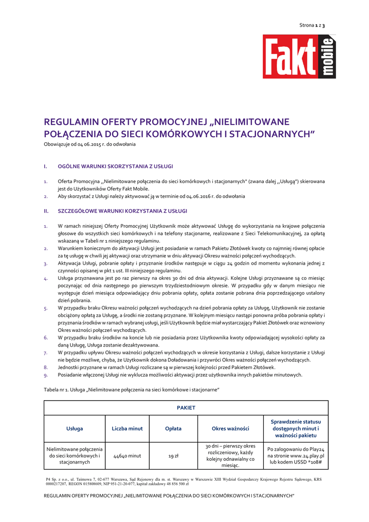 Strona 1 z 3 REGULAMIN OFERTY PROMOCYJNEJ „NIELIMITOWANE POŁĄCZENIA DO SIECI KOMÓRKOWYCH I STACJONARNYCH” Obowiązuje od 04 06.2015 r. do odwołania I. OGÓLNE WARUNKI SKORZYSTANIA Z USŁUGI 1. 2. Oferta Promocyjna ,,Nielimitowane połączenia do sieci komórkowych i stacjonarnych" (zwana dalej ,,Usługą”) skierowana jest do Użytkowników Oferty Fakt Mobile. Aby skorzystać z Usługi należy aktywować ją w terminie od 04.06.2016 r. do odwołania II. SZCZEGÓŁOWE WARUNKI KORZYSTANIA Z USŁUGI 1. W ramach niniejszej Oferty Promocyjnej Użytkownik może aktywować Usługę do wykorzystania na krajowe połączenia głosowe do wszystkich sieci komórkowych i na telefony stacjonarne, realizowane z Sieci Telekomunikacyjnej, za opłatą wskazaną w Tabeli nr 1 niniejszego regulaminu. Warunkiem koniecznym do aktywacji Usługi jest posiadanie w ramach Pakietu Złotówek kwoty co najmniej równej opłacie za tę usługę w chwili jej aktywacji oraz utrzymanie w dniu aktywacji Okresu ważności połączeń wychodzących. Aktywacja Usługi, pobranie opłaty i przyznanie środków następuje w ciągu 24 godzin od momentu wykonania jednej z czynności opisanej w pkt 1 ust. III niniejszego regulaminu. Usługa przyznawana jest po raz pierwszy na okres 30 dni od dnia aktywacji. Kolejne Usługi przyznawane są co miesiąc poczynając od dnia następnego po pierwszym trzydziestodniowym okresie. W przypadku gdy w danym miesiącu nie występuje dzień miesiąca odpowiadający dniu pobrania opłaty, opłata zostanie pobrana dnia poprzedzającego ustalony dzień pobrania. W przypadku braku Okresu ważności połączeń wychodzących na dzień pobrania opłaty za Usługę, Użytkownik nie zostanie obciążony opłatą za Usługę, a środki nie zostaną przyznane. W kolejnym miesiącu nastąpi ponowna próba pobrania opłaty i przyznania środków w ramach wybranej usługi, jeśli Użytkownik będzie miał wystarczający Pakiet Złotówek oraz wznowiony Okres ważności połączeń wychodzących. W przypadku braku środków na koncie lub nie posiadania przez Użytkownika kwoty odpowiadającej wysokości opłaty za daną Usługę, Usługa zostanie dezaktywowana. W przypadku upływu Okresu ważności połączeń wychodzących w okresie korzystania z Usługi, dalsze korzystanie z Usługi nie będzie możliwe, chyba, że Użytkownik dokona Doładowania i przywróci Okres ważności połączeń wychodzących. Jednostki przyznane w ramach Usługi rozliczane są w pierwszej kolejności przed Pakietem Złotówek. Posiadanie włączonej Usługi nie wyklucza możliwości aktywacji przez użytkownika innych pakietów minutowych. 2. 3. 4. 5. 6. 7. 8. 9. Tabela nr 1. Usługa „Nielimitowane połączenia na sieci komórkowe i stacjonarne” PAKIET Usługa Nielimitowane połączenia do sieci komórkowych i stacjonarnych Liczba minut 44640 minut Opłata Okres ważności Sprawdzenie statusu dostępnych minut i ważności pakietu 19 zł 30 dni – pierwszy okres rozliczeniowy, każdy kolejny odnawialny co miesiąc. Po zalogowaniu do Play24 na stronie www.24.play.pl lub kodem USSD *108# P4 Sp. z o.o., ul. Taśmowa 7, 02-677 Warszawa, Sąd Rejonowy dla m. st. Warszawy w Warszawie XIII Wydział Gospodarczy Krajowego Rejestru Sądowego, KRS 0000217207, REGON 015808609, NIP 951-21-20-077, kapitał zakładowy 48 856 500 zł REGULAMIN OFERTY PROMOCYJNEJ „NIELIMITOWANE POŁĄCZENIA DO SIECI KOMÓRKOWYCH I STACJONARNYCH” Strona 2 z 3 III. AKTYWACJA, DEZAKTYWACJA I KORZYSTANIE Z USŁUGI 1. W celu aktywacji Usługi należy wykonać jedną z następujących czynności: a. wybrać i zatwierdzić na klawiaturze telefonu krótki kod USSD : *111*579*1# b. wysłać SMS pod numer 579 o treści START. Koszt SMS wynosi 0 zł, jeśli został wysłany z terytorium kraju. c. wybrać na klawiaturze telefonu *111#, a następnie w sekcji promocje wybrać odpowiednią opcję, d. zalogować się na swoje konto w serwisie Play24 (24.play.pl) i następnie wybrać odpowiednią opcję w zakładce "Pakiety i usługi" e. udać się do Punktu Sprzedaży P4 i zlecić sprzedawcy uruchomienie wybranej usługi. f. zadzwonić na Infolinię Fakt Mobile pod nr +48 799 599 999 Opłata za aktywację Usługi jest pobierana automatycznie w chwili dokonania aktywacji Usługi. W ramach niniejszej Oferty Promocyjnej nie można aktywować jednocześnie więcej niż jednej Usługi. Aby dezaktywować Usługę należy wykonać jedną z następujących czynności: a. wybrać i zatwierdzić na klawiaturze telefonu krótki kod: *111*579*2# b. wysłać SMS pod numer 579 o treści STOP. Koszt SMS wynosi 0 zł, jeśli został wysłany z terytorium kraju. c. wybrać na klawiaturze telefonu *111#, a następnie w sekcji promocje wybrać odpowiednią opcję, d. zalogować się na swoje konto w serwisie Play24 (24.play.pl) i następnie wybrać odpowiednią opcję w zakładce "Pakiety i Usługi" e. udać się do Punktu Sprzedaży P4 i zlecić sprzedawcy uruchomienie wybranej usługi. f. zadzwonić na Infolinię Fakt Mobile pod nr +48 799 599 999 Dezaktywacja Usługi następuje w ciągu 24 godzin od chwili wykonania jednej z czynności opisanej powyżej. Po dezaktywacji Użytkownik może dokonać ponownej aktywacji na zasadach opisanych w niniejszym regulaminie. Po dezaktywacji Użytkownik może korzystać z Usługi do końca okresu rozliczeniowego. Po dezaktywacji Usługi i po upłynięciu okresu rozliczeniowego za Usługę opłaty za połączenia naliczane są zgodnie z Cennikiem Fakt Mobile. Aby sprawdzić, czy Usługa jest włączona należy: a. wybrać i zatwierdzić na klawiaturze telefonu krótki kod USSD : *111*579*3# a. wysłać SMS pod numer 579 o treści STAN. Koszt SMS wynosi 0 zł, jeśli został wysłany z terytorium kraju. b. wybrać na klawiaturze telefonu *111#, a następnie w sekcji promocje wybrać odpowiednią opcję c. zalogować się na swoje konto w serwisie Play24 (24.play.pl) i sprawdzić status usługi d. udać się do Punktu Sprzedaży P4 i zlecić 