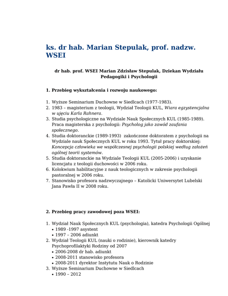 ks. dr hab. Marian Stepulak, prof. nadzw. WSEI dr hab. prof. WSEI Marian Zdzisław Stepulak, Dziekan Wydziału Pedagogiki i Psychologii 1. Przebieg wykształcenia i rozwoju naukowego: 1. Wyższe Seminarium Duchowne w Siedlcach (1977-1983). 2. 1983 – magisterium z teologii, Wydział Teologii KUL, Wiara egzystencjalna w ujęciu Karla Rahnera. 3. Studia psychologiczne na Wydziale Nauk Społecznych KUL (1985-1989). Praca magisterska z psychologii: Psycholog jako zawód zaufania społecznego. 4. Studia doktoranckie (1989-1993) zakończone doktoratem z psychologii na Wydziale nauk Społecznych KUL w roku 1993. Tytuł pracy doktorskiej: Koncepcja człowieka we współczesnej psychologii polskiej według założeń ogólnej teorii systemów. 5. Studia doktoranckie na Wydziale Teologii KUL (2005-2006) i uzyskanie licencjatu z teologii duchowości w 2006 roku. 6. Kolokwium habilitacyjne z nauk teologicznych w zakresie psychologii pastoralnej w 2006 roku. 7. Stanowisko profesora nadzwyczajnego – Katolicki Uniwersytet Lubelski Jana Pawła II w 2008 roku. 2. Przebieg pracy zawodowej poza WSEI: 1. Wydział Nauk Społecznych KUL (psychologia), katedra Psychologii Ogólnej 1989 -1997 asystent 1997 – 2006 adiunkt 2. Wydział Teologii KUL (nauki o rodzinie), kierownik katedry Psychoprofilaktyki Rodziny od 2007 2006-2008 dr hab. adiunkt 2008-2011 stanowisko profesora 2008-2011 dyrektor Instytutu Nauk o Rodzinie 3. Wyższe Seminarium Duchowne w Siedlcach 1990 – 2012 ● ● ● ● ● ● 4. Instytut Teologiczny w Siedlcach 1995 – 2012 5. Państwowa Wyższa Szkoła Zawodowa w Chełmie, Instytut Matematyki i Informatyki, katedra Pedagogiki 2010 - 2014 ● ● 3. Nagrody i wyróżnienia: 1. 2. 3. 4. Nagroda indywidualna Rektora KUL za rozprawę habilitacyjną – 2007 Nagroda zespołowa III stopnia Rektora KUL – 2009 Medal Srebrny za Długoletnią Służbę – 2010 Nagroda z okazji 15 – lecia Wyższej Szkoły Ekonomii i Innowacji w Lublinie za długoletnią pracę, szczególną sumienność i zaangażowanie oraz wkład w rozwój Uczelni – 2015. 5. Nagroda Jubileuszowa z tytułu 5 lat zatrudnienia w Wyższej Szkole Ekonomii i Innowacji w Lublinie – 2016 4. Członkostwo w organizacjach i stowarzyszeniach naukowych: 1. 2. 3. 4. 5. 6. 7. 8. 9. Polskie Towarzystwo Psychologiczne Lubelskie Towarzystwo Naukowe Towarzystwo Naukowe KUL Stowarzyszenie Teologów Duchowości Stowarzyszenie Psychologów Chrześcijańskich Polskie Stowarzyszenie Familiologiczne Sekcja Psychologii Komisji Episkopatu Polski Chełmskie Towarzystwo Naukowe (od 2011) Institute of Sustainable Education– Baltic and Black Sea Circle Consortium odmaja 2014 roku 5. Praktyka psychologiczna: Od 1995 roku biegły sądowy Sądzie Biskupim w Siedlcach w sprawach dotyczących orzeczenia nieważności małżeństwa. 6. Zajęcia dydaktyczne: Wykłady: ● ● ● ● ● psychoprofilaktyka uzależnień (pedagogika), wprowadzenie do psychologii, historia myśli psychologicznej, etyka zawodu psychologa, seminarium magisterskie. 7. Funkcje dydaktyczne i działania organizacyjne: 1. 2. 3. 4. 5. 6. Kierownik Pracowni Psychologii Ogólnej i Rozwoju Człowieka Członek Senatu WSEI Przewodniczący Wydziałowej Komisji ds. Programów i Jakości Kształcenia Członek Uczelnianej Komisji ds. Programów i Jakości Kształcenia Koordynator „Otwartych zebrań naukowych” na kierunku psychologia Od 1 października 2015 roku Dziekan Wydziału Pedagogiki i Psychologii 8. Działania na rzecz rozwoju dydaktyki: 1. Przygotowywanie opisów zajęć i standardów nauczania w dziedzinie psychologii. 2. Przygotowanie materiałów do zajęć (skrypty 7): Etyka zawodu rolnika wobec zagrożeń ekologicznych. Siedlce 1993: WODR. Wybrane zagadnienia z psychologii religii. Siedlce 1996: PETIT. Wybrane zagadnienia z psychologii rozwojowej. Siedlce 2001: PETIT. Wybrane zagadnienia z psychologii osobowości. Lublin 2001: PETIT. Wybrane zagadnienia z psychologii pastoralnej. Siedlce - Opole 2004: Wyższe Seminarium Duchowne. Wybrane zagadnienia z medycyny pastoralnej. Siedlce – Opole 2007: Wyższe Seminarium Duchowne. Wybrane zagadnienia z psychologii szkolnej. Lublin 2009: Katedra Psychoprofilaktyki Rodziny Instytut Nauk o Rodzinie. 3. Przygotowanie podręcznika do etyki zawodu psychologa pt. Tajemnica zawodowa psychologa, Lublin 2014: WSEI. ● ● ● ● ● ● ● ● ● 9. Kształcenie kadry naukowej: 1. Promotor prac dyplomowych doktorskie - 3; magisterskie – 217; licencjackie – 80. 2. Recenzje prac dyplomowych profesorskie - 1; habilitacyjne - 2; doktorskie - 4; magisterskie - 242; licencjackie - 34. 3. Wykłady specjalistyczne na studiach podyplomowych. ● ● ● ● ● ● ● ● 10. Tematyka badań własnych: 1. 2. 3. 4. 5. 6. 7. 8. 9. Psychologiczne koncepcje człowieka Historia myśli psychologicznej Relacyjna koncepcja systemu rodzinnego Psychologia osoby Psychologia sądowa i penitencjarna Medycyna i psychologia pastoralna Psychoprofilaktyka rodziny Rozwój religijny i duchowy człowieka Etyczne i osobowościowe uwarunkowania aktywności zawodowej pracownika socjalnego 10. Psychologia czasu 11. Psychologia wartości 12. Etyka zawodu psychologa 11. Realizowane projekty badawcze: 1. Postawy moralne i religijne młodzieży maturalnej wobec miłości, małżeństwa i rodziny. 2. Duchowo – psychiczna koncepcja systemu rodzinnego. 3. Analiza osobowości stron procesowych ubiegających się o orzeczenie nieważności małżeństwa. 4. Relacje interpersonalne w rozwoju osobowym człowieka. 5. Zaburzenia osobowości a psychiczna niezdolność do zawarcia małżeństwa. 6. System rodzinny w orientacji temporalnej 7. Psychologia wartości 12. Staże i wyjazdy naukowe: 1. Stypendium naukowe i staż w Uniwersytecie w Reading (Wielka Brytania) – 1993 i 1994. 2. Stypendium naukowe i staż w Uniwersytecie w Londynie (Wielka Brytania) – 1995. 3. Letnie szkoły języka angielskiego w Londynie – 1993 – 1997. 4. Pobyty naukowe Uniwersytecie katolicki