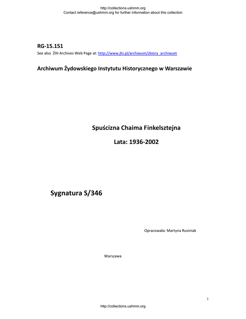 http://collections.ushmm.org Contact [email protected] for further information about this collection RG‐15.151 See also ŻIH Archives Web Page at: http://www.jhi.pl/archiwum/zbiory archiwum Archiwum Żydowskiego Instytutu Historycznego w Warszawie Spuścizna Chaima Finkelsztejna Lata: 1936‐2002 Sygnatura S/346 Opracowała: Martyna Rusiniak Warszawa 1 http://collections.ushmm.org http://collections.ushmm.org Contact [email protected] for further information about this collection Spuścizna Chaima Finkelsztejna Lata: 1936‐2002 Dzieje Zespołu archiwalnego Spuścizna Chaima Finkelsztejna, to zespól dokumentów, który znalazł się w ŻIH po śmierci autora, przekazany przez jego żonę. Mamy tu szereg listów, głównie z czasów wojny. Poza tym w spuściźnie znajduje się duża ilość czasopism głównie w jidysz zebranych po wojnie. Zespół po uporządkowaniu i opracowaniu liczy 178 jednostek archiwalnych, które myślę, że ułożyłam zgodnie jak sądzę z życzeniem autora. Spuścizna Chaima Finkelsztejna obejmuje materiały z lat 1936 – 2002. W wyniku opracowania, uporządkowania zespołu powstało sześć grup tematycznych. Grupę I stanowią dokumenty – dotyczące głównie Chaima Finkelsztejna. Grupę II stanowi korespondencja, która została podzielona na wojenną i powojenną, oraz prywatną: z rodziną i znajomymi; i urzędową. Grupa III obejmuje memoriały, notatki, projekty, prace w przygotowaniu z lat 1940 – do lat sześćdziesiątych XX w.; To fragmenty biografii Chaima Finkelsztejna, maszynopisy artykułów o czasopiśmie „Haynt”, o Ilji Schorze. Grupa IV to książki, broszury, czasopisma, wycinki prasowe, dotyczące Chaima Finkelsztejna lub napisane przez niego. Grupa V – to rachunki, bilet kolejowy, karta pokładowa, drobne notatki dotyczące różnych spraw. Grupę VI stanowią zdjęcia Chaima Finkelsztejna, Szmula Szwerdszarfa, Paula Bluma, Marysi Gierszonowicz z córeczką Waldeczką oraz zdjęcia apteki pod „Orłem” w getcie krakowskim. Większość z dokumentów zachowana jest w dobrym stanie. W wyniku opracowania spuścizny procedurze brakowania nie zostały poddane żadne materiały. Chaim Finkelsztejn, nazywany również przez bliskich Heńkiem lub panem Finkiem, urodził się 11 sierpnia 1899 roku w Warszawie. Rodzicami jego byli: Wolf Finkelsztejn (nauczyciel) i Chana. Miał trzech braci i dwie siostry: Dawida, przebywającego podczas wojny w getcie warszawskim; Josefa (Józefa) – zamieszkałego podczas wojny z żoną Zosią w Otwocku; Leona Arje (Lolka), który z żoną Noemi i córką Sarą mieszkał podczas wojny i po wojnie w Palestynie; Marysię Gierszonowicz, która z mężem Gienkiem i córeczką Waldemarą mieszkała w Białymstoku, a następnie w Słonimiu; Esterę, która przebywała podczas wojny w getcie warszawskim. Chaim Finkelsztejn ożenił się z Rywką z domu Ajzenberg 22.02.1924 w Warszawie ( Rywka ur. w 1897 r. w Białej Podlaskiej, córka Mendla Ajzenberga i Estery z domu Szklarz, umarła 21.04.1943 roku w Warszawie). Mieli dwie córki: Esterę (Tusię) urodzona 1925 r. w Warszawie, która umarła w getcie warszawskim i Awiwę ‐ ur. 17.11.1931 w Warszawie, której udało się przeżyć wojnę po stronie aryjskiej i w listopadzie 1945 roku spotkać z ojcem w Nowym Jorku, gdzie ukończyła Columbia University i została psychoterapeutą. Syn Awiwy – Rishon Blumberg jest absolwentem Business School na Philadelphia University. Chaim Finkelsztejn zaczął swoją pracę w syjonistycznym czasopiśmie „Haynt” w 1918 roku. W latach 1936‐1939 był dyrektorem tego czasopisma. Jako syjonista należał do grupy „A” (Al Hamishmar). W 1938 roku wydano jego książkę "Palestyna w pracy i walce"(Palestine in Tail and Fight). Jako dyrektor czasopisma latem 1939 roku został delegatem na Kongres Syjonistyczny w Genewie. Z powodu wybuchu wojny nie mógł powrócić do Polski, postał w Paryżu, skąd wyjechał w listopadzie 1939 roku do Nowego Jorku. Po wojnie pracował w Institute of Jewish Research in New York City (Instytut Badań Żydowskich w Nowym Jorku) jako administrator i badacz Holocaustu. Wykaz skrótów: 2 http://collections.ushmm.org http://collections.ushmm.org Contact [email protected] for further information about this collection NY – New York msnp – maszynopis rkps – rękopis ang. – angielski pol. – polski ros. – rosyjski niem. – niemiecki franc. – francuski ss. – stron str. – strona k. – karta/karty r. – rok Spis zawartości inwentarza: I. Dokumenty .................................................................................1‐14 II. Korespondencja .................................................................... 15‐125 1. Korespondencja wojenna............................................................15‐82 a. Korespondencja z rodziną w okupowanej Warszawie i w getcie warszawskim 1939‐1942................................................15‐22 Korespondencja rodziny do Chaima Finkelsztejna............................15‐18 Korespondencja Chaima Finkelsztejna do rodziny: żony Rywki i córek: Estery i Awiwy.................................................... 19‐22 b. Korespondencja wojenna – inne......................................................23‐82 Korespondencja prywatna....................................................................23‐71 Korespondencja urzędowa....................................................................72‐82 2. Korespondencja powojenna..............................................................83‐125 Korespondencja w sprawie przyjazdu ocalałej córki Awiwy Finkelsztejn do ojca Chaima Finkelsztejna ‐ 1945 rok..................................................................................................83‐108 Korespondencja prywatna......................................................................109‐115 Korespondencja urzędowa.................................................................
