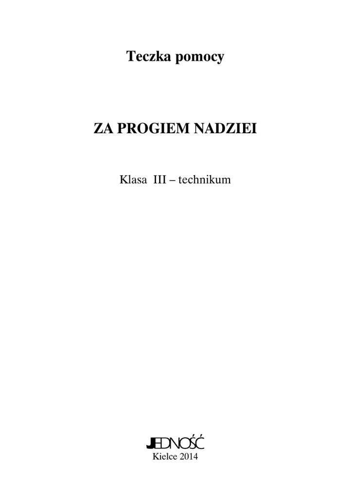 Teczka pomocy za progiem nadziei Klasa III – technikum Kielce 2014 Teczka pomocy dydaktycznych do nauczania religii rzymskokatolickiej na terenie całej Polski, z zachowaniem praw biskupów diecezjalnych, przeznaczona jest dla klas III technikum i może być stosowana jako pomoc uzupełniająca do podręcznika nr AZ-43-01/12-KI-2/14. Recenzenci: ks. dr Krzysztof Kantowski ks. prof. dr hab. Andrzej Offmański Redakcja: Sławomir Mazur, Bogusław Nosek, Kamilla Rokosz Wybór i opracowanie materiałów: ks. Kamil Banasik ks. Piotr Białek Anna Domurat ks. dr Rafał Dudała s. Agnieszka Ferensztajn Marta Gdela ks. Arkadiusz Karczyński Marta Karyś Ewa Klepczyńska Joanna Kowalczyk Monika Kozon Dariusz Kurpiński ks. Jacek Malewski Sławomir Mazur Bogusław Nosek ks. Wojciech Oczkowicz Anita Pawelec o. dr Wojciech Popielewski OMI Małgorzata Pryjda Sylwia Pura-Maciejczyk Kamilla Rokosz ks. Paweł Samiczak s. Maria Sieczka ks. Leszek Starczewski ks. Waldemar Wiśniowski ks. Jan Zwierzchowski Redakcja techniczna: Wiktor Idzik © Copyright Wydawnictwo „JEDNOŚĆ”, Kielce 2014 Wydawnictwo „JEDNOŚĆ” 25-013 Kielce, ul. Jana Pawła II nr 4 Dział sprzedaży tel. 41 349 50 50 Redakcja tel. 41 349 50 00 www.jednosc.com.pl e-mail: [email protected] Druk i oprawa Drukarnia im. A. Półtawskiego www.drukarnia.kielce.pl Spis treści Temat 1. Karta pracy – Niedokończone zdania ...................................................................... 6 Karta pracy – Cel ludzkiego życia ............................................................................ 7 Myśli do rozlosowania ............................................................................................... 8 Temat 2. Pojęcia i opisy – Bóg filozofów, Bóg religijny ........................................................ 11 Teksty biblijne dla grup ............................................................................................ 12 Temat 3. Tekst biblijny do uzupełnienia (2 Tm 3,16-17) ..................................................... 14 Sigla biblijne do pracy domowej ............................................................................. 15 Temat 4. Krzyżówka ................................................................................................................. 16 Temat 5. Zadania dla grup – Czas powstania ksiąg biblijnych ........................................... 17 Krzyżówka ................................................................................................................. 18 Temat 6. Litania do Imienia Jezus .......................................................................................... 19 Litania do Boga Ojca ................................................................................................ 20 Sigla biblijne – Imiona Boże .................................................................................... 22 Temat 7. Teksty biblijne dla grup ............................................................................................ 23 Temat 8. Tabela – Święte Księgi .............................................................................................. 27 Temat 9. Zadania dla grup – Mail w imieniu postaci biblijnej ........................................... 28 Plansza z hasłami ...................................................................................................... 29 Tekst: „Błogosławiona teściowa” ............................................................................. 30 Temat 10. Katalog typów przedstawień postaci w ikonie ...................................................... 32 Katalog symboliki kolorów w ikonie ...................................................................... 33 Ikony ........................................................................................................................... 34 Karta pracy dla grup ................................................................................................. 37 Test sprawdzający ...................................................................................................... 38 Temat 11. Karta pracy – Gdy rodzice kochają swoje dziecko… ........................................... 39 Temat 12. Zadania dla grup ....................................................................................................... 40 Temat 14. Akt oddania życia Jezusowi ..................................................................................... 41 Temat 15. Formularz „szkielet ryby” ........................................................................................ 42 Tekst o anoreksji ....................................................................................................... 43 Części Mszy Świętej .................................................................................................. 44 Zadania dla grup – Wizja Mszy Świętej Cataliny Rivas ...................................... 45 Temat 17. Karta pracy – Cuda eucharystyczne ....................................................................... 51 Mapa – Cuda eucharystyczne w Europie ............................................................... 52 Temat 18. Fragmenty: „Za pięć godzin zobaczę Jezusa” ........................................................ 54 Zadania dla grup – Warunki sakramentu pokuty ................................................ 55 Temat 20. Zadania dla grup – Uczeni o wierze ....................................................................... 60 Ankieta ....................................................................................................................... 64 Temat 21. Okienko informacyjne – Owoce Ducha Świętego ............................................... 65 Temat 22. Teksty do „tajemnych kopert” ................................................................................. 74 3 Temat 23. Tekst biblijny z pytaniami .........................