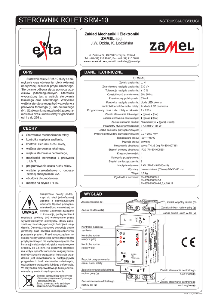 Sterownik rolet SRM-10 INSTRUKCJA OBSŁUGI Zakład Mechaniki i Elektroniki ZAMEL sp.j. J.W. Dzida, K. Łodzińska ul. Zielona 27, 43-200 Pszczyna, Poland Tel. +48 (32) 210 46 65, Fax +48 (32) 210 80 04 www.zamelcet.com, e-mail: [email protected] OPIS DANE Techniczne Sterownik rolety SRM‑10 służy do zamykania oraz otwierania rolety okiennej napędzanej silnikiem prądu zmiennego. Sterowanie odbywa się za pomocą przycisków jednobiegunowych. Sterownik wyposażony jest w wejścia sterowania lokalnego oraz centralnego. Wszystkie wejścia sterujące mogą być wyzwalane z przewodu fazowego (L) lub neutralnego (N). Użytkownik ma możliwość zaprogramowania czasu ruchu rolety w granicach od 1 s do 256 s. SRM-10 Zaciski zasilania: L, N Znamionowe napięcie zasilania: 230 V~ Tolerancja napięcia zasilania: ±10 % Częstotliwość znamionowa: 50 / 60 Hz Znamionowy pobór prądu: 35 mA Kontrolka napięcia zasilania: dioda LED zielona Kontrolki kierunków ruchu rolety: 2x dioda LED czerwona Programowany czas ruchu rolety w zakresie: 1 ÷ 256 s Zaciski sterowania lokalnego: (góra), (dół) Zaciski sterowania centralnego: (góra), (dół) Zaciski zasilania silnika: N (neutralny), cechy ● Sterowanie mechanizmem rolety, Liczba zacisków przyłączeniowych: 9 Temperatura pracy: -20 ÷ +45 oC Pozycja pracy: dowolna ● kontrolki kierunku ruchu rolety, Mocowanie obudowy: szyna TH 35 (wg PN-EN 60715) ● wejścia sterowania lokalnego, Stopień ochrony obudowy: IP20 (PN-EN 60529) ● wejścia sterowania centralnego, Klasa ochronności: II ● możliwość sterowania z przewodu L lub N, Kategoria przepięciowa: II Stopień zanieczyszczenia: 2 Napięcie udarowe: 1 kV (PN-EN 61000-4-5) ● programowanie czasu ruchu rolety, Wymiary: dwumodułowa (35 mm) 90x35x66 mm ● wyjście przekaźnikowe o dopuszczalnej obciążalności 3 A, Waga: 0,1 kg Zgodność z normami: PN-EN 60669-1 PN-EN 60669-2-1 PN-EN 61000-4-2,3,4,5,6,11 ● obudowa dwumodułowa, ● montaż na szynie TH 35. Symbol oznaczający selektywne zbieranie sprzętu elektrycznego i elektronicznego. Zakaz umieszczania zużytego sprzętu z innymi odpadami. (dół) Przekrój przewodów przyłączeniowych: 0,2 ÷ 2,50 mm2 ● kontrolka napięcia zasilania, Urządzenie należy podłączyć do sieci jednofazowej zgodnie z obowiązującymi normami. Sposób podłączenia określono w niniejszej instrukcji. Czynności związane uwaga z: instalacją, podłączeniem i regulacją powinny być wykonywane przez wykwalifikowanych elektryków, którzy zapoznali się z instrukcją obsługi i funkcjami urządzenia. Demontaż obudowy powoduje utratę gwarancji oraz stwarza niebezpieczeństwo porażenia prądem. Przed rozpoczęciem instalacji należy upewnić się czy na przewodach przyłączeniowych nie występuje napięcie. Do instalacji należy użyć wkrętaka krzyżowego o średnicy do 3,5 mm. Na poprawne działanie ma wpływ sposób transportu, magazynowania i użytkowania urządzenia. Instalacja urządzenia jest niewskazana w następujących przypadkach: brak elementów składowych, uszkodzenie urządzenia lub jego deformacje. W przypadku nieprawidłowego funkcjonowania należy zwrócić się do producenta. (góra), Parametry styków przekaźnika: 3 A / 250 V~ 85 W wygląd Zacisk zasilania (L) Zacisk zasilania (N) Zacisk wspólny silnika (N) Zacisk silnika - ruch w górę ( ) Zacisk silnika - ruch w dół ( ) Kontrolka napięcia zasilania Kontrolka ruchu rolety w górę Kontrolka ruchu rolety w dół Przycisk programowania czasu ruchu rolety Zaciski sterowania lokalnego ruch w górę ( ) Zaciski sterowania centralnego ruch w dół ( ) Zaciski sterowania lokalnego ruch w dół ( ) Zaciski sterowania centralnego ruch w górę ( ) VER. 002_12.03.2009 MOntaż, działanie 1.Rozłączyć obwód zasilania bezpiecznikiem, wyłącznikiem nadmiarowoprądowym lub rozłącznikiem izolacyjnym przyłączonymi do odpowiedniego obwodu. 2. Sprawdzić odpowiednim przyrządem stan beznapięciowy na przewodach zasilających. 3. Zamontować urządzenie SRM‑10 w rozdzielni na szynie TH 35. 4. Podłączyć przewody pod zaciski zgodnie ze schematem podłączenia. 5. Załączyć obwód zasilania. 6. Zaprogramować według potrzeb czas ruchu rolety. Sterownik realizuje operacje: podnoszenia, opuszczania lub zatrzymania rolety wyposażonej w silnik dwufazowy. Pierwsze naciśnięcie któregokolwiek z klawiszy lokalnych powoduje ruch rolety w wybranym kierunku, natomiast kolejne naciśnięcie (któregokolwiek z klawiszy sterowania lokalnego) powoduje zatrzymanie rolety. Naciśnięcie dowolnego klawisza z grupy klawiszy sterowania centralnego powoduje wykonanie żądanej czynności (opuszczenie lub podniesienie rolety) niezależnie od stanu w jakim aktualnie znajduje się roleta. Użytkownik ma możliwość zaprogramowania czasu ruchu rolety. Procedurę programowania czasu uruchamia się przez naciśnięcie przycisku „PROG.” na panelu sterownika w momencie, gdy roleta jest zatrzymana. Czerwone diody LED pulsując co 1 sekundę wyznaczają odmierzany czas ruchu rolety. Po upływie żądanego czasu należy ponownie nacisnąć przycisk „PROG.”. Czas zostanie zapisany w pamięci wewnętrznej sterownika (czas ten jest pamiętany również po zaniku napięcia zasilającego). Maksymalny czas ruchu rolety może mieć wartość 256 sekund. podłączenie Przebiegi czasowe D - ruch rolety w dół Schemat wewnętrzny G - ruch rolety w górę Zastosowanie Wymiary obudowy Rodzina produktu Sterownik rolet SRM‑10 należy do rodziny sterowników rolet SRx. Wersja urządzenia: 10 - sterowanie lokalne i centralne, programowany czas ruchu Rodzaj obudowy: M - dwumodułowa Symbol urządzenia Kompletny układ sterowania roletami okiennymi zrealizowany jest przy pomocy sterowników rolet SRM-10. Jeden sterownik może być wykorzystany tylko dla jednej rolety. Każdy ze sterowników posiada przyciski sterowania lokalnego oraz połączone wejścia sterowania centralnego, umożliwiając zamknięcie lu