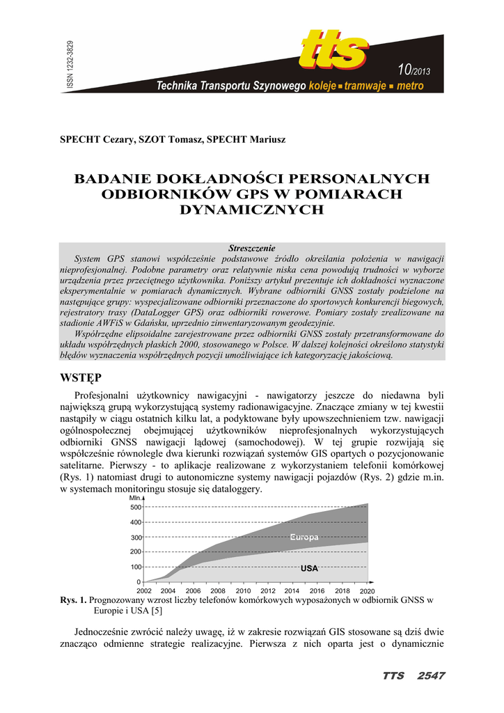 SPECHT Cezary, SZOT Tomasz, SPECHT Mariusz BADANIE DOKŁADNOŚCI PERSONALNYCH ODBIORNIKÓW GPS W POMIARACH DYNAMICZNYCH Streszczenie System GPS stanowi współcześnie podstawowe źródło określania połoŜenia w nawigacji nieprofesjonalnej. Podobne parametry oraz relatywnie niska cena powodują trudności w wyborze urządzenia przez przeciętnego uŜytkownika. PoniŜszy artykuł prezentuje ich dokładności wyznaczone eksperymentalnie w pomiarach dynamicznych. Wybrane odbiorniki GNSS zostały podzielone na następujące grupy: wyspecjalizowane odbiorniki przeznaczone do sportowych konkurencji biegowych, rejestratory trasy (DataLogger GPS) oraz odbiorniki rowerowe. Pomiary zostały zrealizowane na stadionie AWFiS w Gdańsku, uprzednio zinwentaryzowanym geodezyjnie. Współrzędne elipsoidalne zarejestrowane przez odbiorniki GNSS zostały przetransformowane do układu współrzędnych płaskich 2000, stosowanego w Polsce. W dalszej kolejności określono statystyki błędów wyznaczenia współrzędnych pozycji umoŜliwiające ich kategoryzację jakościową. WSTĘP Profesjonalni uŜytkownicy nawigacyjni - nawigatorzy jeszcze do niedawna byli największą grupą wykorzystującą systemy radionawigacyjne. Znaczące zmiany w tej kwestii nastąpiły w ciągu ostatnich kilku lat, a podyktowane były upowszechnieniem tzw. nawigacji ogólnospołecznej obejmującej uŜytkowników nieprofesjonalnych wykorzystujących odbiorniki GNSS nawigacji lądowej (samochodowej). W tej grupie rozwijają się współcześnie równolegle dwa kierunki rozwiązań systemów GIS opartych o pozycjonowanie satelitarne. Pierwszy - to aplikacje realizowane z wykorzystaniem telefonii komórkowej (Rys. 1) natomiast drugi to autonomiczne systemy nawigacji pojazdów (Rys. 2) gdzie m.in. w systemach monitoringu stosuje się dataloggery. Mln. 500 400 Europa 300 200 100 0 2002 USA 2004 2006 2008 2010 2012 2014 2016 2018 2020 Rys. 1. Prognozowany wzrost liczby telefonów komórkowych wyposaŜonych w odbiornik GNSS w Europie i USA [5] Jednocześnie zwrócić naleŜy uwagę, iŜ w zakresie rozwiązań GIS stosowane są dziś dwie znacząco odmienne strategie realizacyjne. Pierwsza z nich oparta jest o dynamicznie TTS 2547 rozwijającą się platformę Google Maps, natomiast druga wykorzystuje dedykowane oprogramowanie GIS autorstwa róŜnych producentów. Dla uŜytkowników lądowych niewątpliwie decydującym w zakresie wzrostu dokładności określenia pozycji był moment wyłączenia tzw. selektywnej dostępności w systemie GPS skutkujący wzrostem dokładności horyzontalnej ze 100 m do 9 m (p=0.95) [2]. Mln. 350 300 250 200 Europa 150 100 USA 50 0 2002 2004 2006 2008 2010 2012 2014 2016 2018 2020 Rys. 2. Prognozowany wzrost liczby samochodów wyposaŜonych w odbiornik GNSS w Europie i USA [5] Nie sposób nie dostrzec dziś coraz większego rozpowszechnienia wśród uŜytkowników odbiorników sportowych uŜywanych w rekreacji i sporcie profesjonalnym. Na poniŜszym rysunku przedstawiono przykładowe zobrazowanie połoŜenia odbiornika sportowego w zawodach sportowych, na tle numerycznego modelu terenu. Prezentowana trasa zawodnika to dystans wynoszący 225 km. Zaznaczone punkty to wynik pomiaru pozycji odbiornikiem GPS świadczący o moŜliwości istnienia znaczących błędów określenia połoŜenia w szczególności na obszarach leśnych – utrudniających odbiór sygnałów satelitarnych. Rys. 3. Przykład prezentacji pozycji GPS zawodnika na tle numerycznego modelu terenu Biorąc powyŜsze pod uwagę autorzy podjęli się próby oceny dokładności określenia połoŜenia wybranej grupy odbiorników GPS. Pierwszy etap obejmował pomiary statyczne zrealizowane na punkcie geodezyjnym krajowej osnowy geodezyjnej 1 klasy POLREF, które 2548 TTS zreferowano w [4]. Kolejnym etapem była próba oceny dokładności określenia połoŜenia z wykorzystaniem popularnych odbiorników GPS w badaniach dynamicznym, którym poświęcony jest niniejszy artykuł. 1. WYZNACZENIE WZORCOWEJ TRAJEKTORII RUCHU DLA BADANIA DOKŁADNOŚCI ODBIORNIKÓW Dla realizacji pomiarów dynamicznych umoŜliwiających ocenę dokładności określenia pozycji moŜna realizować jedynie względem uprzednio wyznaczonych współrzędnych, które umoŜliwią określenie błędów pojedynczych pomiarów. Zdecydowano, iŜ wykorzysta się w tym celu bieŜnię stadionu sportowego AWFiS, dla której wymagania w zakresie precyzji wyznaczenia nie przekraczają 2 mm, zgodnie z wymaganiami Międzynarodowego Stowarzyszenia Federacji Atletycznych (ang.: International Association of Athletics Federations – IAAF) [3, 6]. Ponadto międzynarodowe normy IAAF ustalają, Ŝe nachylenie poprzeczne bieŜni powinno wynosić 1 %, a nachylenie podłuŜne, mierzone w kierunku biegu 0.1 %. Zgodnie z wspomnianymi wytycznymi nachylenie podłuŜne mierzy się wzdłuŜ kierunku biegu na odcinkach co 50 m począwszy od mety. Na jednym takim odcinku (czyli na 50 m) to nachylenie nie moŜe przekroczyć 0.1 %. Całkowite nachylenie podłuŜne winno wynosić 0 % (oznacza to, Ŝe suma wszystkich nachyleń mierzonych co 50 m, uwzględniając ich róŜnice w stosunku do poziomu na linii mety powinna wynosić 0). Na poniŜszym rysunku przedstawiono zmiany poziomu stadionu zmierzone na pierwszym – wewnętrznym torze pomiarowym. Pomiary dynamiczne dostępnych odbiorników zrealizowano względem zinwentaryzowanej linii pomiarowej, pomiędzy dwoma torami stadionu sportowego, stanowiącej trajektorię wzorcową. W tym celu wykonano niezaleŜne pomiary z wykorzystaniem tachimetru geodezyjnego oraz odbiornika geodezyjnego systemu GPS z wykorzystaniem satelitarnej, geodezyjnej Aktywnej Sieci Geodezyjnej ASG-EUPOS. Szczegółowy opis określania połoŜenia oraz działania tej sieci opisano w [2]. W ramach badań wyznaczono połoŜenie 2 torów przy wykorzystaniu tachimetru elektronicznego Leica TPS 1103 (Rys. 4.). Jest to zautomatyzowana stacja z wewnętrzną rejestracją pomiarów, o dokładnoś