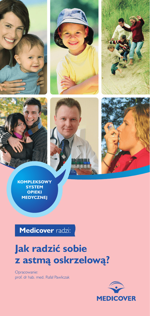 KOMPLEKSOWY SYSTEM OPIEKI MEDYCZNEJ Medicover radzi: Jak radzić sobie z astmą oskrzelową? Opracowanie: prof. dr hab. med. Rafał Pawliczak SPIS TREŚCI: Astma oskrzelowa to choroba, która niesie ze sobą wiele uciążliwych objawów. Nie jest jednak tak, że uniemożliwia normalne funkcjonowanie. Można sobie z nią radzić! Z naszym poradnikiem będzie Ci łatwiej kontrolować przebieg choroby. Wystarczy tylko ściśle przestrzegać zaleceń! Nie daj się astmie! Z Medicover będzie Ci dużo łatwiej! O astmie oskrzelowej 4 Rozpoznanie 7 Leczenie astmy 9 Styl życia pacjenta chorego na astmę 14 Choroba a aktywność zawodowa 18 Co sądzisz o poradnikach z serii Medicover radzi? Czekamy na Twoją opinię pod adresem [email protected] 2 Jak radzić sobie z astmą oskrzelową? 3 w dużych miastach, wychowujące się w „sterylnych” warunkach, które nie chodziły do żłobka lub przedszkola. Jakie są czynniki ryzyka astmy? O astmie oskrzelowej Astma oskrzelowa jest przewlekłą chorobą zapalną dróg oddechowych. Proces zapalny dotyczy oskrzeli i oskrzelików i nie jest zakaźny. Astmą nie można się zarazić. Zapalenie występujące w oskrzelach powoduje zjawisko nadreaktywności oskrzeli. Oskrzela osób chorych na astmę oskrzelową łatwiej reagują skurczem na bodźce z otoczenia. Kiedy oskrzela kurczą się, słychać świsty podczas oddychania – jeden z najczęstszych objawów astmy. Zwykle wtedy także pacjent odczuwa duszność, trudności w oddychaniu, czy ucisk w klatce piersiowej. Skąd bierze się astma? Wydaje się, że duże znaczenie mają tu czynniki genetyczne. U osób z predyspozycją genetyczną zanieczyszczenie środowiska (duże miasta), uczulenie na alergeny wziewne (pyłki drzew, traw, chwastów, pleśnie, roztocza i zwierzęta domowe), alergiczny nieżyt nosa, mogą powodować nasilenie procesu zapalnego doprowadzając do rozwinięcia się astmy oskrzelowej. • Najważniejszym czynnikiem ryzyka jest nieżyt nosa. U pacjentów chorujących na alergiczny nieżyt nosa astma występuje 3-5 razy częściej. Dotyczy to zarówno pacjentów chorujących na okresowy nieżyt nosa (np. związany z uczuleniem na pyłki traw), jak i pacjentów, którzy chorują na przewlekły nieżyt nosa (związany np. z uczuleniem na roztocza czy alergeny zwierząt domowych). Ważne jest więc, by każdy pacjent chorujący na nieżyt nosa, szczególnie na ciężki i przewlekły, był diagnozowany w kierunku astmy oskrzelowej. • Mama lub tata chorujący na astmę. Astma ma podłoże genetyczne. Nie wiadomo jednak jaki jest sposób dziedziczenia tej choroby, dlatego też trudno ocenić ryzyko dziedziczenia astmy. • Uczulenie (atopia). Uczulenie na alergeny inhalacyjne, szczególnie uczulenie na alergen kota oraz roztocze, zwiększa prawie dwukrotnie ryzyko astmy. Dlatego też pacjenci, którzy są uczuleni na te alergeny, powinni zwracać szczególną uwagę na dolegliwości ze strony układu oddechowego. • Wykonywanie niektórych zawodów. Praca w przemyśle piekarskim i cukierniczym, a także praca związana z gryzoniami (myszami i szczurami) niesie ze sobą ryzyko zachorowania na astmę zawodową. U kogo może występować astma oskrzelowa? Astma występuje zarówno u dorosłych, jak i młodzieży i dzieci. Występuje tak samo często u kobiet, jak i u mężczyzn. Na astmę częściej chorują dzieci nie mające rodzeństwa, mieszkające 4 Jak radzić sobie z astmą oskrzelową? 5 Kiedy podejrzewać astmę oskrzelową? Najbardziej charakterystyczną cechą astmy jest napadowe występowanie dolegliwości takich jak duszność, ucisk w klatce piersiowej oraz kaszel. Objawy te prawie zawsze występują nagle, często podczas wysiłku fizycznego, emocji, stresu. Często dolegliwości pojawiają się w obecności intensywnych zapachów (np. perfum i kosmetyków), dymu papierosowego, przemysłowych i miejskich zanieczyszczeń powietrza. U niektórych chorych zimne i suche powietrze, a także wiatr może wywoływać dolegliwości. Inne osoby mogą reagować w podobny sposób na dużą wilgotność powietrza. Kolejnym objawem astmy są świsty, występujące podczas oddychania. Świszczący oddech jest zawsze niepokojącym objawem i zjawisko to może mieć wiele przyczyn. Świsty pojawiające się napadowo, podczas wysiłku fizycznego lub w innych sytuacjach, np. podczas kontaktu z kotem, czy podczas snu nad ranem mogą wskazywać na astmę oskrzelową. Świsty pacjenci opisują czasem jako zjawisko bulgotania albo gwizdu. Świsty związane z astmą zawsze występują w fazie wydechu. Napadowa duszność nie zawsze jest łatwa do opisania przez pacjenta. Często pacjenci mówią raczej o uczuciu braku powietrza, konieczności otworzenia okna, ucisku w klatce piersiowej, niemożności nabrania powietrza. Kaszel może mieć bardzo wiele przyczyn. Kaszel przewlekły, suchy, występujący napadowo może być jednym z objawów astmy oskrzelowej. Szczególnie charakterystyczny jest kaszel występujący podczas wysiłku fizycznego lub zaraz po nim. Istnieje nawet wariant kaszlowy astmy nazywany niekiedy zespołem Corrao, w którym kaszel jest jedynym objawem choroby. Zmniejszona tolerancja wysiłku także bywa objawem astmy oskrzelowej. Okresowo występujące ograniczenie możliwości wykonania wysiłku fizycznego w związku z pojawiającą się dusznością, brakiem powietrza czy kaszlem często bywa jednym z objawów astmy. 6 Rozpoznanie Do rozpoznania astmy w wielu przypadkach wystarczą informacje zebrane od pacjenta podczas wizyty (wywiad lekarski) oraz badanie przedmiotowe. Jest jednak bardzo prawdopodobne, że lekarz w celu ustalenia rozpoznania skieruje pacjenta na dodatkowe badania. W wielu przypadkach będą to: • spirometria, czyli badanie czynności oddychania, • testy skórne skaryfikacyjne, • zdjęcie rentgenowskie klatki piersiowej, • próba prowokacyjna z metacholiną. Spirometria Spirometria jest badaniem umożliwiającym ocenę parametrów przepływu powietrza 