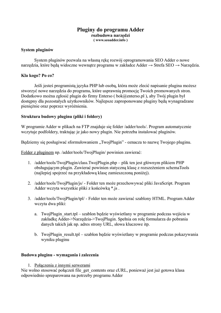 Pluginy do programu Adder rozbudowa narzędzi ( www.seoadder.info ) System pluginów System pluginów pozwala na własną rękę rozwój oprogramowania SEO Adder o nowe narzędzia, które będą widoczne wewnątrz programu w zakładce Adder → Strefa SEO → Narzędzia. Kla kogo? Po co? Jeśli jesteś programistą języka PHP lub osobą, która może zlecić napisanie plugina możesz stworzyć nowe narzędzia do programu, które usprawnią promocję Twoich promowanych stron. Dodatkowo można zgłosić plugin do firmy Enterso ( [email protected] ), aby Twój plugin był dostępny dla pozostałych użytkowników. Najlepsze zaproponowane pluginy będą wynagradzane pieniężnie oraz poprzez wyróżnienia. Struktura budowy pluginu (pliki i foldery) W programie Adder w plikach na FTP znajduje się folder /adder/tools/. Program automatycznie wczytuje podfoldery, traktując je jako nowy plugin. Nie potrzeba instalować pluginów. Będziemy się posługiwać sformułowaniem „TwojPlugin” - oznacza to nazwę Twojego pluginu. Folder z pluginem np. /adder/tools/TwojPlugin/ powinien zawierać: 1. /adder/tools/TwojPlugin/class.TwojPlugin.php – plik ten jest głównym plikiem PHP obsługującym plugin. Zawierać powinien statyczną klasę z rozszeżeniem schemaTools (najlepiej spojrzeć na przykładową klasę zamieszczoną poniżej). 2. /adder/tools/TwojPlugin/js/ - Folder ten może przechowywać pliki JavaScript. Program Adder wczyta wszystkie pliki z końcówką *.js . 3. /adder/tools/TwojPlugin/tpl/ - Folder ten może zawierać szablony HTML. Program Adder wczyta dwa pliki: a. TwojPlugin_start.tpl – szablon będzie wyświetlany w programie podczas wejścia w zakładkę Adder->Narzędzia->TwojPlugin. Spełnia on rolę formularza do pobrania danych takich jak np. adres strony URL, słowa kluczowe itp. b. TwojPlugin_result.tpl – szablon będzie wyświetlany w programie podczas pokazywania wyniku pluginu Budowa pluginu - wymagania i zalecenia 1. Połączenia z innymi serwerami Nie wolno stosować połączeń file_get_contents oraz cURL, ponieważ jest już gotowa klasa odpowiednio spreparowana na potrzeby programu Adder Przykładowe wykorzystanie cURL-a: $curl = new EntersoCurl(); $curlopt[CURLOPT_HTTPHEADER] = array('Host: '.$pingSiteInfo['host'], 'Content-type: text/xml', 'Content-length: '.$pingFrameLength."\n", $pingFrame->asXML()); $curlopt[CURLOPT_CUSTOMREQUEST] = 'POST'; // lub GET $curlopt[CURLOPT_TIMEOUT] = 3; // Maksymalny czas oczekiwania // $prop – odpowiada za ustawienia niestandarwoe jak powyżej $prop = array('curl'=>$curlopt, 'merge'=>true); // Dodanie strony do pobrania $curl->addSite('http://google.pl', $prop); $curl->addSite('http://onet.pl'); // W tym miejscu rozpoczyna pobieranie stron, które zostały dodane // Może być użyte także execute(true). True oznacza pobranie tablicy wszystkich stron, nie // tylko ostatniej $data = $curl->execute(); // Zmienna tablicowa $data zawiera teraz wszystkie pobrane strony wraz z informacjami. // Pobranie kodu html strony $contentHTML = $data['content']; // Kod pobrania strony. 200 oznacza prawidłowe. 404 brak strony. 403 zabroniony dostęp. $codeHTML = ['info']['http_code']; Powyższy kod pokazuje większość możliwości klasy EntersoCurl. Jednak aby tylko pobrać kod źródłowy strony wystarczy prosty kod: $curl = new EntersoCurl(); $curl->addSite('http://onet.pl'); $data = $curl->execute(); $contentHTML = $data['content']; 2. Folder tymczasowy - tmp Jeśli potrzebujesz zapisywać pliki tymczasowe prosimy skorzystać z folderu /adder/tmp/tools/TwojPlugin/. 3. Dodatkowe funkcje Program zawiera wbudowane funkcje, które mogą Tobie pomóc podczas tworzenia pluginu. Klasa Common a) Funkcja wyodrebniajaca formularz z kodu HTML. Zapisuje form, input,textarea w postaci XML Wywołanie : $xml = Common::extractXMLForm($codeHTML); b) Losowanie bardziej rzeczywiste niż fukcja PHP, która często nie pokazuje losowości Wywołanie : $randNumber = Common::losuj(100); // Losuje liczbę z zakresu 0-100 c) Usunięcie polskich znaków. Zamienia ą na a, ś na s itp. Wywołanie : $withoutPL = Common::DelStringPL('Łódź'); // Zwróci „Lodz” d) Zamiana polskiego stronga na małe litery. Funkcja strtolower nie potrafi zamienić np. Ś na ś. Wywołanie : $smallLetter = Common::strtolowerPL('ŚNIEŻka'); // Zwróci „śnieżka” e) Zapisanie zmiennej do programu na stałe w postaci rekordu w bazie danych MySQL (tabela adder_cfg). Jeśli była wcześniej zmienna to ją nadpisze. Jeśli nie było zmiennej to ją doda. Wywołanie : Common::cfgSet('nazwaZmiennej','wartość'); f) Odczytanie zmiennej z programu zapisanej w bazie danych MySQL (tabela adder_cfg) Wywołanie : $zmienna = Common::cfgGet('nazwaZmiennej'); g) Funkcja dopisuje http:// do adresu URL jeśli go brakuje. Wywołanie : $urlZhttp = Common::prepareUrlWithHttp('wp.pl'); h) Funkcja usuwa http:// i https:// z adresu URL Wywołanie : $urlBezhttp = Common::prepareUrlWithoutHttp('http://wp.pl'); i) Funkcja wyciąga główny adres URL z całego URLa i usuwa http:// np. z http://wp.pl/kat/abc.php?a=6 zwraca wp.pl/kat/ Wywołanie : $mainUrl = Common::prepareMainUrlWithoutHttp('wp.pl/kat/b.html'); Klasa String ( adder/inc/class.string.php ) a) Metoda konwertująca stringa na dane kodowanie (najczesciej z UTF na ISO). $charset – oczekiwane kodowanie. $from – z jakiego kodowania. $tekst - tekst do przekonwertowania (można tekże podać tablicę) Wywołanie : $tekst = String::prepareStringEncoded($charset, $tekst, $from = 'utf-8') 4. Plugin może wykorzystywać dane z bazy MySQL poprzez PDO. Nazwę tabel należy pisać zawsze poprzez adder_. Program automatycznie zamienia na ewentualny inny prefix, który był podany podcas instalacji. ( http://php.net/manual/en/book.pdo.php ) Przykład: $sql = SPDO::getInstance(); $q = $sql->prepare('SELECT * FROM adder_url WHERE id = :id'); $q->bindValue(':id', 1500); try { $q->execute(); } catch(PDOException $e) { echo 'Error: '.$e->getMessage();