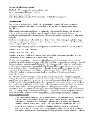 Przekształtniki elektroniczne Moduł D – Uruchamianie, testowanie i pomiary do wytycznych projektowych wer. 1.4.0 opracował: Łukasz Starzak Politechnika Łódzka, Katedra Mikroelektroniki i Technik Informatycznych Uruchomienie Sugeruje się przeprowadzić je w kolejności podanej niżej. Nawet jeżeli punkt 1 został już wykonany, to warto go powtórzyć bezpośrednio przed pierwszym testem obwodu mocy z dławikiem. Układ należy uruchamiać z zasilacza o wydajności wystarczającej dla najgorszych warunków pracy (z zasilacza pobierany będzie oczywiście prąd wejściowy przetwornicy) oraz z uwzględnieniem braku układu łagodnego rozruchu, co prowadzi do przetężenia przy załączaniu zasilania. Zasilacze 2-sekcyjne mają wydajność 3 A na sekcję; wyjścia sekcji można połączyć równolegle uzyskując wydajność 6 A; w tym celu należy: 1º połączyć styki − z − oraz + z +; 2º odpowiednio wcisnąć przyciski pośrodku panelu. W razie niewystarczającej wydajności powyższych zasilaczy, w laboratorium są także dostępne: – zasilacz 60 V, 10 A – DF1760SL10A, – zasilacz 30 V, 20 A – DF1730SL, – zasilacz 36 V, 30 A – PSH-3630A (proszę go nie używać bez wysłuchania instrukcji ze strony prowadzącego oraz sprawdzenia przez niego ustawień). Wyjście przetwornicy podwyższającej pracującej bez sprzężenia zwrotnego musi być zawsze obciążone na tyle, by układ pracował w trybie CCM (zgodnie z obliczeniami, powinien wystarczyć do tego minimalny zakładany prąd obciążenia). Niedostateczny odbiór ładunku z kondensatora wyjściowego (dostarczanego przez prąd dławika, którego składowa przemienna jest narzucona przez napięcie wejściowe i współczynnik wypełnienia) doprowadziłby bowiem do wzrostu napięcia wyjściowego ponad wartość przewidzianą wzorem dla trybu CCM (jak wiadomo, w trybie DCM funkcja przetwarzania napięcia ulega modyfikacji). Grozi to uszkodzeniem elementów układu. Jako odbiornik można wykorzystać: duży opornik regulowany (zwrócić uwagę na jego prąd maksymalny), średniej wielkości rurowy opornik mocy (zwrócić uwagę na jego moc maksymalną podaną na korpusie) lub mały opornik mocy w metalowej obudowie 50 W (ta moc obowiązuje jednak wyłącznie z odpowiednim radiatorem! – opornik bez radiatora wytrzyma ok. 20 W). Jeżeli moc znamionowa jest za mała, można połączyć kilka oporników równolegle. Oczywiście można również łączyć oporniki równolegle i szeregowo w celu uzyskania pożądanej rezystancji (dokładność prądu 10% będzie wystarczająca). Po zakończeniu pomiarów oporniki należy odłożyć tam, skąd zostały wzięte. Można również skorzystać z obciążenia elektronicznego (posiada ono 2 niezależne sekcje) – jednak wyłącznie po wysłuchaniu instrukcji prowadzącego i pod jego każdorazowym nadzorem. 1. Przed wlutowaniem dławika – tak aby wejście obwodu mocy było rozłączone – podłączyć układ do zasilacza z sensownie ustawionym ograniczeniem prądowym (z kart katalogowych układów scalonych wynika, jakiego rzędu prąd pobierają) i stopniowo zwiększać napięcie patrząc, czy z zasilacza nie zaczyna płynąć niepokojąco duży prąd. Sprawdzić woltomierzem, czy stabilizator liniowy stabilizuje napięcie – zmieniając napięcie wejściowe w założonych granicach. Sprawdzić, czy tranzystor jest wysterowany przebiegiem prostokątnym o założonej amplitudzie (mniej więcej), częstotliwości i zakresie 1 współczynnika wypełnienia (sprawdzamy to na nóżce bramki tranzystora). 2. Ustawić minimalny (zakładany) współczynnik wypełnienia. Zasilacz wyłączyć przy odpowiadającym temu współczynnikowi napięciu wejściowym (nie sprowadzać go do zera). Przy napięciu bliskim zeru, wejście przetwornicy podwyższającej, tj. dławik z tranzystorem o niskiej rezystancji, może zostać zinterpretowane przez zasilacz jako zwarcie (małe napięcie przy dużym prądzie), co doprowadzi do aktywacji zabezpieczenia nadprądowego, które ograniczy napięcie, nie pozwalając na jego zwiększenie. Dlatego ten układ należy uruchamiać podając napięcie wejściowe skokowo. Wlutować dławik. Na wyjście przyłączyć opornik o odpowiedniej wartości lub odpowiednio nastawione obciążenie elektroniczne, tak by przy nominalnym napięciu wyjściowym uzyskać minimalny zakładany prąd wyjściowy (tj. mniejszy od nominalnego). Obliczyć spodziewany prąd wejściowy dla tego prądu wyjściowego (o ile nie był obliczony na etapie projektowania). Przyłączyć sondę napięciową oscyloskopu między dren a źródło tranzystora. Sondy nie należy przyłączać do samej nóżki tranzystora (ani do wbudowanego radiatora), gdyż spowoduje to stopienie się materiału końcówki w wyniku oddziaływania temperatury i tym samym zniszczenie sondy. To samo dotyczy innych grzejących się elementów. W obwodzie zapewne można znaleźć inny punkt znajdujący się na tym samym potencjale (pomijając rezystancje i indukcyjności połączeń). 3. Na zasilaczu ustawić sensowne ograniczenie prądowe biorąc pod uwagę, że przy załączaniu wystąpi przetężenie (patrz wyniki symulacji). Załączyć zasilacz patrząc, czy nie włączyło się na stałe ograniczenie prądowe. Jeżeli włączyło się, to należy wyłączyć układ i zastanowić się nad zwiększeniem progu ograniczenia. Jeżeli się nie włączyło, to nawet, jeżeli prąd przekracza spodziewaną wartość, układ raczej działa. Można wówczas spróbować zwiększyć napięcie do maksymalnego zakładanego, co powinno poskutkować osiągnięciem napięcia wyjściowego dość zbliżonego do założonego nominalnego. 4. Po kilku sekundach sprawdzić, czy obudowy elementów nie nagrzały się do zbyt wysokiej temperatury (tranzystor, dioda, stabilizator, kondensator wyjściowy oraz kondensator stabilizatora, dławik, układy scalone). Powtórzyć tę czynność po kilkudziesięciu sekundach. Przegrzewanie się s