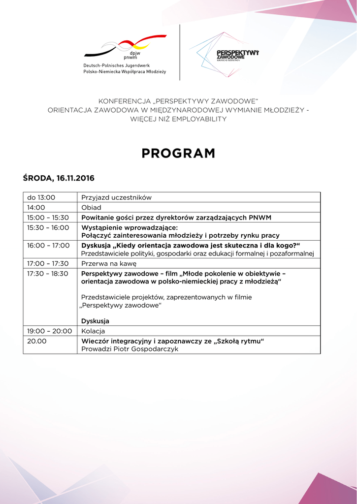 KONFERENCJA „PERSPEKTYWY ZAWODOWE“ ORIENTACJA ZAWODOWA W MIĘDZYNARODOWEJ WYMIANIE MŁODZIEŻY WIĘCEJ NIŻ EMPLOYABILITY PROGRAM ŚRODA, 16.11.2016 do 13:00 Przyjazd uczestników 14:00 Obiad 15:00 – 15:30 Powitanie gości przez dyrektorów zarządzających PNWM 15:30 – 16:00 Wystąpienie wprowadzające: Połączyć zainteresowania młodzieży i potrzeby rynku pracy 16:00 – 17:00 Dyskusja „Kiedy orientacja zawodowa jest skuteczna i dla kogo?“ Przedstawiciele polityki, gospodarki oraz edukacji formalnej i pozaformalnej 17:00 – 17:30 Przerwa na kawę 17:30 – 18:30 Perspektywy zawodowe – film „Młode pokolenie w obiektywie – orientacja zawodowa w polsko-niemieckiej pracy z młodzieżą“ Przedstawiciele projektów, zaprezentowanych w filmie „Perspektywy zawodowe“ Dyskusja 19:00 – 20:00 Kolacja 20.00 Wieczór integracyjny i zapoznawczy ze „Szkołą rytmu“ Prowadzi Piotr Gospodarczyk CZWARTEK, 17.11.2016 8:00 – 8:45 Śniadanie 9:00 – 10:00 Przykłady dobrych praktyk – wybrane projekty zgłoszone do konkursu o Polsko-Niemiecką Nagrodę Młodzieży 10:00 – 10:30 Przerwa na kawę 10:30 – 10:45 Przedstawienie grup roboczych 10:50 – 13:20 Grupy robocze 1. Praktyki zagraniczne krok po kroku. Standardy jakości i praktyczne wskazówki, jak zorganizować dobre praktyki. 2. Animacja językowa zawodowo. Teoretycznie i metodycznie - rozwój kompetencji językowych w polsko-niemieckiej wymianie młodzieży. 3. JOBO! Gry edukacyjne jako narzędzia orientacji zawodowej i rozwoju kompetencji społecznych. 4.Firma uczniowska w polsko-niemieckiej wymianie młodzieży. 13:30 – 15:00 Przerwa obiadowa 15:00 – 17:30 Grupy robocze 18:00 Program kulturalny i kolacja we Wrocławiu - Europejskiej Stolicy Kultury PIĄTEK, 18.11.2016 8:00 – 9:00 Śniadanie 9:30 – 12:30 Jak dobrze korzystać z zasobów medialnych i internetowych dot. orientacji zawodowej? 13:00 – 13:30 Ewaluacja i runda pożegnalna 13:30 – 14:30 Obiad Organizator: Partnerzy: Patronat medialny: Patronat honorowy: