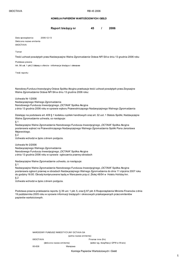 08OCTAVA RB 45 2006 KOMISJA PAPIERÓW WARTOŚCIOWYCH I GIEŁD Raport bieżący nr Data sporządzenia: 45 / 2006 2006-12-13 Skróc ona nazwa emitenta 08OCTAVA Temat Treść uchwał powziętych przez Nadzwyczajne Walne Zgromadzenie Octava NFI SA w dniu 13 grudnia 2006 roku Podstawa prawna Treść raportu: Narodowy Fundusz Inwestycyjny Octava Spółka Akcyjna przekazuje treść uchwał powziętych przez Zwyczajne Walne Zgromadzenie Octava NFI SA w dniu 13 grudnia 2006 roku: Uchwała Nr 1/2006 Nadzwyczajnego Walnego Zgromadzenia Narodowego Funduszu Inwestycyjnego „OCTAVA” Spółka Akcyjna z dnia 13 grudnia 2006 roku w sprawie wyboru Przewodniczącego Nadzwyczajnego Walnego Zgromadzenia Działając na podstawie art. 409 § 1 kodeksu spółek handlowych oraz art. 32 ust. 1 Statutu Spółki, Nadzwyczajne Walne Zgromadzenie uchwala, co następuje: §1 Nadzwyczajne Walne Zgromadzenie Narodowego Funduszu Inwestycyjnego „OCTAVA” Spółka Akcyjna postanawia wybrać na Przewodniczącego Nadzwyczajnego Walnego Zgromadzenia Spółki Pana Jarosława Majewskiego. §2 Uchwała wchodzi w życie z dniem podjęcia. Uchwała Nr 2/2006 Nadzwyczajnego Walnego Zgromadzenia Narodowego Funduszu Inwestycyjnego „OCTAVA” Spółka Akcyjna z dnia 13 grudnia 2006 roku w sprawie ogłoszenia przerwy obradach Nadzwyczajne Walne Zgromadzenie uchwala, co następuje: §1 Nadzwyczajne Walne Zgromadzenie Narodowego Funduszu Inwestycyjnego „OCTAVA” Spółka Akcyjna postanawia ogłosić przerwę w obradach Nadzwyczajnego Walnego Zgromadzenia do dnia 11 stycznia 2007 roku do godziny 16:00. Obrady kontynuowane będą w Warszawie przy ul. Złotej 48/54 w Hotelu Holiday Inn. §2 Uchwała wchodzi w życie z dniem podjęcia. Podstawa prawna przekazania raportu: § 39 ust. 1 pkt. 5, oraz § 97 pkt. 6 Rozporządzenia Ministra Finansów z dnia 19 października 2005 roku w sprawie informacji bieżących i okresowych przekazywanych przez emitentów papierów wartościowych. NARODOWY FUNDUSZ INWESTYCYJNY OCTAVA SA (pełna nazwa emitenta) 08OCTAVA Finanse inne (fin) (skróc ona nazwa emitenta) 00-838 (sektor wg. klasyfikac ji GPW w W-wie) Warszawa Komisja Papierów Wartościowych i Giełd 1 08OCTAVA RB 45 2006 (kod poc ztowy) (miejsc owość ) Prosta 69 (ulic a) 022 444 15 55 (numer) 022 444 15 50 (telefon) (fax) www.oc tava.c om.pl (e-mail) (www) (NIP) (REGON) 526-10-36-962 PODPISY OSÓB REPREZENTUJĄCYCH SPÓŁKĘ Data Imię i Nazwisko Stanowisko/Funkc ja Podpis 2006-12-13 Piotr Rymaszewski Pełnomoc nik Piotr Rymaszewski Komisja Papierów Wartościowych i Giełd 2