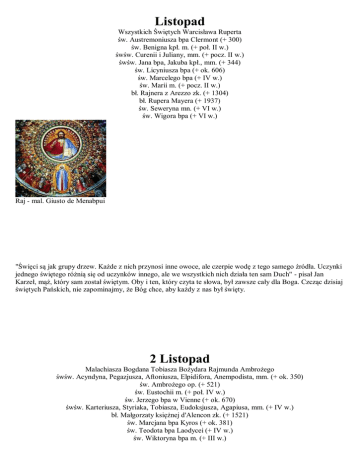 Listopad Wszystkich Świętych Warcisława Ruperta św. Austremoniusza bpa Clermont (+ 300) św. Benigna kpł. m. (+ poł. II w.) śwśw. Curenii i Juliany, mm. (+ pocz. II w.) śwśw. Jana bpa, Jakuba kpł., mm. (+ 344) św. Licyniusza bpa (+ ok. 606) św. Marcelego bpa (+ IV w.) św. Marii m. (+ pocz. II w.) bł. Rajnera z Arezzo zk. (+ 1304) bł. Rupera Mayera (+ 1937) św. Seweryna mn. (+ VI w.) św. Wigora bpa (+ VI w.) Raj - mal. Giusto de Menabpui "Święci są jak grupy drzew. Każde z nich przynosi inne owoce, ale czerpie wodę z tego samego źródła. Uczynki jednego świętego różnią się od uczynków innego, ale we wszystkich nich działa ten sam Duch" - pisał Jan Karzeł, mąż, który sam został świętym. Oby i ten, który czyta te słowa, był zawsze cały dla Boga. Czcząc dzisiaj świętych Pańskich, nie zapominajmy, że Bóg chce, aby każdy z nas był święty. 2 Listopad Malachiasza Bogdana Tobiasza Bożydara Rajmunda Ambrożego śwśw. Acyndyna, Pegazjusza, Aftoniusza, Elpidifora, Anempodista, mm. (+ ok. 350) św. Ambrożego op. (+ 521) św. Eustochii m. (+ poł. IV w.) św. Jerzego bpa w Vienne (+ ok. 670) śwśw. Karteriusza, Styriaka, Tobiasza, Eudoksjusza, Agapiusa, mm. (+ IV w.) bł. Małgorzaty księżnej d'Alencon zk. (+ 1521) św. Marcjana bpa Kyros (+ ok. 381) św. Teodota bpa Laodycei (+ IV w.) św. Wiktoryna bpa m. (+ III w.) Św. Malachiasz, biskup, kardynał (1094-1148). Urodził się w Armagh (Irlandia). Ojciec był lektorem w szkole klasztornej. Malachiasz otrzymał święcenia kapłańskie w 1119 roku. W cztery lata później został biskupem w Connor, a następnie w Down. Prowadził życie ascety Kiedy Malachiasz był w Rzymie, Innocenty II mianował go swoim legatem na Irlandię. Podczas podróży zatrzymał się w Clairvaux, gdzie zaprzyjaźnił się ze św. Bernardem. W Irlandii, ewangelizując swą ojczyznę, założył liczne klasztory. W czasie następnej wyprawy na kontynent zmarł w Clairvaux. Św. Bernard nazywał Malachiasza "biskupem-prorokiem". Być może powaga Świętego zaważyła na tym, że Malachiaszowi zaczęto przypisywać przepowiednię o papieżach i ich pontyfikatach, którą odnaleziono dopiero w 1595 roku. Kanonizował go Klemens III (1190). 3 Listopad Marcina Sylwii Chwalisława Huberta Bogumiła Ruperta Św. Marcina De Porres, zakonnika (WD) św. Domnusa bpa (+ ok. 538) śwśw. Germana, Teofila, Cezarego, Witalisa, mm. (+ II/III w.) św. Hermengaudiusa bpa (+ 1035) św. Huberta bpa (+ 727) św. Kwartusa (+ I w.) św. Piotra Franciszka Néron kpł. m. (+ 1860) św. Pirmina bpa w Meaux (+ ok. 755) św. Sylwii (+ ok. 594) - matki św. Grzegorza Wielkiego bł. Szymona zk. (+ ok. 1329) św. Wenefrydy dz. m. (+ VII w.) Św. Marcin de Porres urodził się 9 grudnia 1569 roku w Limie. Był nieślubnym dzieckiem Mulatki Anny Valasquez i hiszpańskiego szlachcica Juana de Porres - późniejszego gubernatora Panamy Marcin przerwał studia medyczne i pracował jako felczer-balwierz. Mimo sprzeciwu ojca wstąpił do dominikanów gdzie do końca życia jako brat zakonny prowadził infirmerię (szpitalik zakonny). Opiekował się tam nie tylko chorymi zakonnikami, ale wszystkimi, którzy przychodzili, niezależnie od ich pozycji społecznej i koloru skóry Dobroć okazywana chorym, opuszczonym, nieszczęśliwym uczyniła z niego żywą legendę. Spędzał wiele czasu, zwłaszcza w nocy na modlitwie i surowej pokucie. Miał szczególne nabożeństwo do Chrystusa w Najświętszym Sakramencie. Otrzymał od Boga wiele łask, między innymi dar czytania w ludzkich sercach i sumieniach. Mistyk. Zmarł 3 listopada 1639 roku. Beatyfikował go Grzegorz XVI (1837), kanonizował Jan XXIII (1962). Patron fryzjerów pielęgniarek, robotników szkół i telewizji w Peru. W IKONOGRAFII św. Marcin przedstawiany jest w habicie dominikańskim. Jego atrybuty to: anioł trzymający bicz i łańcuch, koszyk chleba, a obok mysz, krzyż, różaniec. 4 Listopad Karola Olgierda Emeryka Mściwoja Feliksa Św. Karola Boromeusza, biskupa (WO) śwśw. Agrykoli i Witalisa, mm. (+ 304) św. Amancjusza bpa (+ V w.) św. Emeryka królewicza (+ 1031) bł. Franciszki Amboise księżnej i zk. (+ 1485) bł. Heleny Enselmini zk. (+ 1230) św. Joannicjusza op. (+ 846) św. Modesty dz. (+ ok. 659) św. Pieriusa kpł. (+ IV w.) Św. Karol Boromeusz witraż z XIX w. Oxford Św. Karol Boromeusz urodził się na zamku Arona w 1538 roku jako syn arystokratycznego rodu. Studia ukończył na uniwersytecie w Pawii, uzyskując doktorat obojga praw (1559). Znawca sztuki. Grał pięknie na wiolonczeli. W 23 roku życia mianowany kardynałem i arcybiskupem Mediolanu. Święcenia kapłańskie i biskupie przyjął dopiero dwa lata później. Po niespodziewanej śmierci brata, która była dla niego duchowym wstrząsem, podjął życie pełne pobożności i ascezy. Współpracując ze swoim wujem, papieżem Piusem IV doprowadził do końca Sobór Trydencki. Uchwały tego soboru wprowadził w swej diecezji. Założył pierwsze seminarium duchowne. Hojny dla ubogich, żył ubogo. Podczas zarazy w Mediolanie (1576) niósł pomoc chorym, oddał wszystko, nawet własne łóżko. Zmarł 3 listopada 1584 roku. Pozostawił po sobie dorobek pisarski. Beatyfikowany w 1602 roku, kanonizowany w 1610. Patron boromeuszek, diecezji w Lugano i Bazylei, uniwersytetu w Salzburgu. bibliotekarzy instytutów wiedzy katechetycznej, proboszczów profesorów seminarium. W IKONOGRAFII św. Karol Boromeusz przedstawiany jest w stroju kardynalskim. Jego atrybutami są: bicz, czaszka, gołąb, kapelusz kardynalski, krucyfiks. postronek na szyi, który nosił podczas procesji pokutnych. 5 Listopad Elżbiety Zachariasza Sławomira Dominika Floriana Geralda Św. Zachariasza (+ I w.), Kapłan "z oddziału Abiasza" Św. Elżbiety (+ I w.) żona Zachariasza i matka Jana Chrzciciela św. Dominika Mau m. (+ 1862) śwśw. Domnina, Teotyma, Filoteusza, Sylwiana, mm. (+ 307) św. Fibicjusa op. bpa (+ VI w.) św. Geralda bp