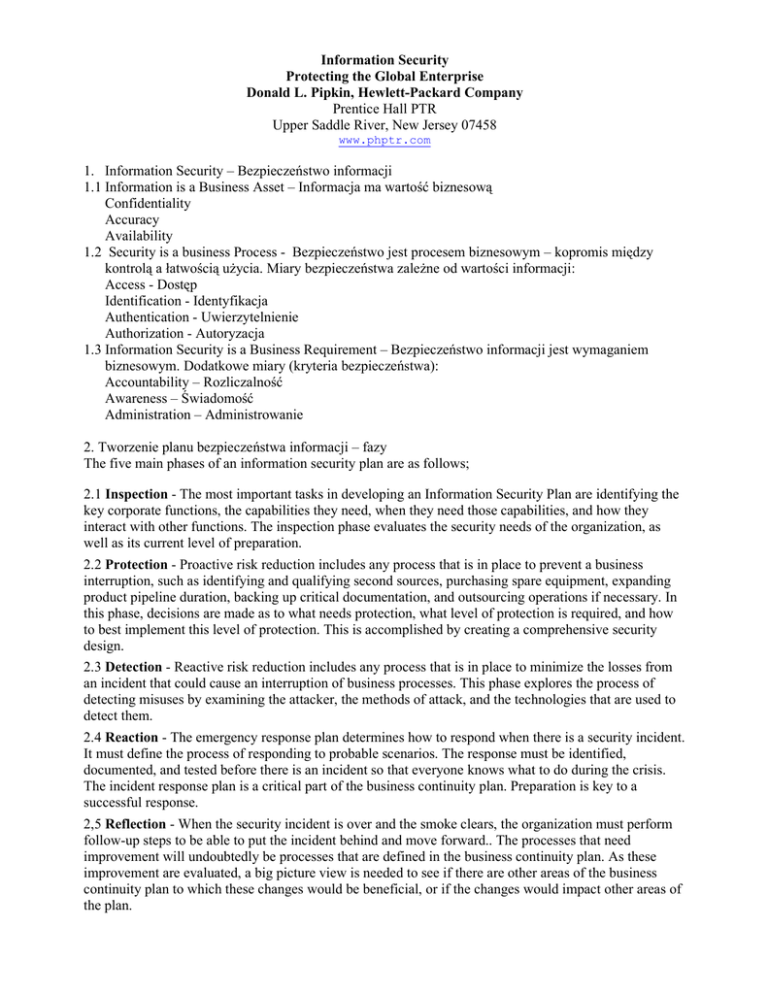 Information Security Protecting the Global Enterprise Donald L. Pipkin, Hewlett-Packard Company Prentice Hall PTR Upper Saddle River, New Jersey 07458 www.phptr.com 1. Information Security – Bezpieczeństwo informacji 1.1 Information is a Business Asset – Informacja ma wartość biznesową Confidentiality Accuracy Availability 1.2 Security is a business Process - Bezpieczeństwo jest procesem biznesowym – kopromis między kontrolą a łatwością uŜycia. Miary bezpieczeństwa zaleŜne od wartości informacji: Access - Dostęp Identification - Identyfikacja Authentication - Uwierzytelnienie Authorization - Autoryzacja 1.3 Information Security is a Business Requirement – Bezpieczeństwo informacji jest wymaganiem biznesowym. Dodatkowe miary (kryteria bezpieczeństwa): Accountability – Rozliczalność Awareness – Świadomość Administration – Administrowanie 2. Tworzenie planu bezpieczeństwa informacji – fazy The five main phases of an information security plan are as follows; 2.1 Inspection - The most important tasks in developing an Information Security Plan are identifying the key corporate functions, the capabilities they need, when they need those capabilities, and how they interact with other functions. The inspection phase evaluates the security needs of the organization, as well as its current level of preparation. 2.2 Protection - Proactive risk reduction includes any process that is in place to prevent a business interruption, such as identifying and qualifying second sources, purchasing spare equipment, expanding product pipeline duration, backing up critical documentation, and outsourcing operations if necessary. In this phase, decisions are made as to what needs protection, what level of protection is required, and how to best implement this level of protection. This is accomplished by creating a comprehensive security design. 2.3 Detection - Reactive risk reduction includes any process that is in place to minimize the losses from an incident that could cause an interruption of business processes. This phase explores the process of detecting misuses by examining the attacker, the methods of attack, and the technologies that are used to detect them. 2.4 Reaction - The emergency response plan determines how to respond when there is a security incident. It must define the process of responding to probable scenarios. The response must be identified, documented, and tested before there is an incident so that everyone knows what to do during the crisis. The incident response plan is a critical part of the business continuity plan. Preparation is key to a successful response. 2,5 Reflection - When the security incident is over and the smoke clears, the organization must perform follow-up steps to be able to put the incident behind and move forward.. The processes that need improvement will undoubtedly be processes that are defined in the business continuity plan. As these improvement are evaluated, a big picture view is needed to see if there are other areas of the business continuity plan to which these changes would be beneficial, or if the changes would impact other areas of the plan. Every organization needs to review its information security plans. During this process many will discover their business plans do not address the issue of information security. Global security direction must be created for the organization so that specific policies can be built in a consistent manner. This book will guide you through the five phases of a security plan, highlighting the key points, emphasizing those areas that are critical to an organization's success, and relating stories to illustrate the possible consequences. 2. Faza I: Inspection Przegląd – analiza ryzyka 3.1. Defining Resources – Definiowanie zasobów People Property Information Infrastructure Reputation 3.2. Assessing Threats – Określanie zagroŜeń Human Errors System Failures Natural Disasters Malicious Acts 3.3. Evaluating Potential Losses – Szacowanie potencjalnych strat Denial of service Disclosure Destruction or Corruption 3.4. Identifying Vulnerabilities – Identyfikowanie podatności Security Design Flaw Incorrect Implementation Innovative Misuses Social Engineering 3.5. Assigning Safeguards – Wybór zabezpieczeń 3.6. Evaluate Current Status – Ocena aktualnego stanu – przegląd dokumentacji i testowanie zabezpieczeń. 3.1.1 Identifying Resources Information Algorithms Software Equipment 3.1.2 Assigning Ownership Creator Maintainer User 3.1.3 Determining Value Cost of Re-creation Cost of Unavailability Cost of Disclosure 3.1.4 Security Classification The following factors should be considered when assigning a resource's security classifications: * Sensitivity of the information * Consequences of disclosure * Legal and contractual obligations and penalties * Standards and Guidelines * Information lifecycle Confidentiality Availability Integrity Checklist 3.2 Threat Assessment The goal of a threat assessment is to understand the type of threat and the likelihood that the threat will cause a loss. * Threat identification * Likelihood assessment 3.2.1 Human Error 3.2.2 Natural Disasters 3.2.3 System Failure 3.2.3.1 Hardware 3.2.3.2 Software * Software complexity * Software evolution * Software testing * Change management 3.2.3.3 Infrastructure 3.2.3.4 Malicious Acts * Evaluate Yourself as a Target 3.2.3.5 Malicious Software * Buffer Overflow * Logic Bomb * Parasite * Sniffer * Spoof * Trojan Horse * Virus * Worm 3.2.3.6 Collateral Damage * The Proximity Problem * Guilt by Association Checklist 3.3 Loss Analysis Denial of Services Theft of Resources Deletion of Information Theft of Information Disclosure of Information Corruption of Information Theft of Software Theft of Hardware Disruption of Computer Controlled Systems Checklist 3.4 Identifying Vulnerabilities 3.4.1 Location of Vulnerabilities Hardware Software Infrastructure Processes 3.4.2 Known Vulnerabilities 3.4.3Security Design Flaw