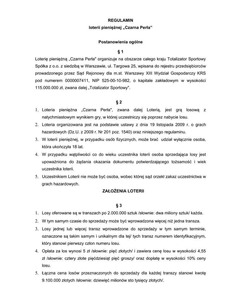 REGULAMIN loterii pieniężnej „Czarna Perła” Postanowienia ogólne §1 Loterię pieniężną „Czarna Perła" organizuje na obszarze całego kraju Totalizator Sportowy Spółka z o.o. z siedzibą w Warszawie, ul. Targowa 25, wpisana do rejestru przedsiębiorców prowadzonego przez Sąd Rejonowy dla m.st. Warszawy XIII Wydział Gospodarczy KRS pod numerem 0000007411, NIP 525-00-10-982, o kapitale zakładowym w wysokości 115.000.000 zł, zwana dalej „Totalizator Sportowy". §2 1. Loteria pieniężna „Czarna Perła", zwana dalej Loterią, jest grą losową z natychmiastowym wynikiem gry, w której uczestniczy się poprzez nabycie losu. 2. Loteria organizowana jest na podstawie ustawy z dnia 19 listopada 2009 r. o grach hazardowych (Dz.U. z 2009 r. Nr 201 poz. 1540) oraz niniejszego regulaminu. 3. W loterii pieniężnej, w przypadku osób fizycznych, może brać udział wyłącznie osoba, która ukończyła 18 lat. 4. W przypadku wątpliwości co do wieku uczestnika loterii osoba sprzedająca losy jest upoważniona do żądania okazania dokumentu potwierdzającego tożsamość i wiek uczestnika loterii. 5. Uczestnikiem Loterii nie może być osoba, wobec której sąd orzekł zakaz uczestnictwa w grach hazardowych. ZAŁOŻENIA LOTERII §3 1. Losy oferowane są w transzach po 2.000.000 sztuk /słownie: dwa miliony sztuk/ każda. 2. W tym samym czasie do sprzedaży może być wprowadzona więcej niż jedna transza. 3. Losy jednej lub więcej transz wprowadzone do sprzedaży w tym samym terminie, oznaczone są takim samym i unikalnym dla tej/ tych transz numerem identyfikacyjnym, który stanowi pierwszy człon numeru losu. 4. Opłata za los wynosi 5 zł /słownie: pięć złotych/ i zawiera cenę losu w wysokości 4,55 zł /słownie: cztery złote pięćdziesiąt pięć groszy/ oraz dopłatę w wysokości 10% ceny losu. 5. Łączna cena losów przeznaczonych do sprzedaży dla każdej transzy stanowi kwotę 9.100.000 złotych /słownie: dziewięć milionów sto tysięcy złotych/. 2 §4 1. Wysokość kapitału przeznaczonego na wygrane pieniężne wynosi dla każdej transzy 5.764.000 zł /słownie: pięć milionów siedemset sześćdziesiąt cztery tysiące złotych/ co stanowi 63,34% łącznej ceny losów przeznaczonych do sprzedaży dla każdej transzy. 2. Ilość i wysokość wygranych dla każdej transzy w Loterii: Stopień wygranych I II III IV V VI VII VIII IX Ilość wygranych Wartość wygranych Łączna wartość w złotych wygranych w złotych 200 000 14 000 25 000 75 000 200 000 1 000 000 1 750 000 800 000 1 700 000 1 2 25 500 2 000 20 000 70 000 80 000 340 000 200 000 7 000 1 000 150 100 50 25 10 5 Razem wygranych: 512 528 sztuk dla każdej transzy. ZNAMIONA LOSÓW §5 Losy Loterii wykonane są w formie prostokąta o wymiarach 10,16 cm x 15,24 cm. §6 Na pierwszej stronie losu wydrukowano: 1) nazwę loterii, 2) oznaczenie opłaty za los, 3) logo loterii pieniężnych Totalizatora Sportowego, 4) instrukcje dla uczestników Loterii, 5) pole gry pokryte w całości ścieralną warstwą ochronną, 6) numer identyfikacyjny losu. §7 Na drugiej stronie losu wydrukowano: 1) tabelę wygranych, 2) informacje o organizatorze Loterii i sposobie odbioru wygranej pieniężnej, 3) kody kreskowe służące do identyfikacji losu, 4) numer identyfikacyjny losu, 5) logo Totalizatora Sportowego. WARUNKI SPRZEDAŻY LOSÓW §8 1. Termin rozpoczęcia sprzedaży losów oraz ilość transz Loterii, oznaczonych takim samym i unikalnym dla tej/ tych transz numerem identyfikacyjnym, który stanowi pierwszy człon numeru losu, każdorazowo określa Totalizator Sportowy i podaje do publicznej wiadomości grających z co najmniej 3 – dniowym wyprzedzeniem. 2. Termin zakończenia sprzedaży losów Loterii, oznaczonych takim samym i unikalnym dla tej/ tych transz numerem identyfikacyjnym, który stanowi pierwszy człon numeru losu, każdorazowo określa Totalizator Sportowy i podaje do publicznej wiadomości grających z co najmniej 7 – dniowym wyprzedzeniem. §9 Totalizator Sportowy prowadzi sprzedaż losów Loterii za pośrednictwem kolektur oraz innych sieci dystrybucji. § 10 1. Przy zakupie losu uczestnik Loterii obowiązany jest sprawdzić, czy los spełnia wymogi określone w § 5 -7 niniejszego regulaminu. 2. W przypadku stwierdzenia przez uczestnika Loterii, że los nie spełnia wymogów określonych w § 5 -7 niniejszego regulaminu, nabywcy przysługuje zwrot ceny losu wraz z dopłatą w zamian za zwrócony los, w miejscu i momencie jego nabycia, pod warunkiem, że zwracany los nie nosi cech dokonanych zdrapań. § 11 Nabycie losu jest równoznaczne z przyjęciem warunków uczestnictwa w Loterii określonych niniejszym regulaminem. 4 ZASADY LOTERII § 12 1. Los bierze udział w grze o wygrane pieniężne. 2. W celu uzyskania wyniku gry, nabywca losu usuwa warstwę ścieralną z pola gry. Na części oznaczonej „Wygrywające liczby” odczytuje cztery liczby. Na części oznaczonej „Twoje liczby” odczytuje dziesięć liczb z przypisanymi do nich kwotami ewentualnej wygranej w złotych (opisanymi dodatkowo słownie pod każdą z liczb). Jeżeli jakakolwiek z dziesięciu liczb z części oznaczonej „Twoje liczby” ma swój odpowiednik na części oznaczonej „Wygrywające liczby” (jest taka sama), oznacza to uzyskanie wygranej pieniężnej w wysokości przypisanej do tej liczby. W przypadku wielokrotnego spełnienia powyższego warunku, kwoty wygranych (przypisane do liczb spełniających ten warunek) sumuje się. 3. Jeżeli na polu „Twoje liczby” zamiast jednej z dziesięciu liczb wystąpi symbol perły z przypisaną kwotą wygranej w złotych wtedy przysługuje wygrana równa sumie wszystkich dziesięciu kwot wygranych w złotych zamieszczonych na polu gry. § 13 1. Realizacja wygranych dla losów z jednej lub więcej transz Loterii, oznaczonych takim samym i unikalnym dla tej/ tych transz numerem identyfikacyjnym, który stanowi pierwszy człon numeru losu, odbywa się pocz