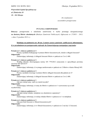 DZPZ/ 333/ 89 PN/ 2013 Olsztyn, 18 grudnia 2013 r. Wojewódzki Szpital Specjalistyczny ul. śołnierska 18 10 – 561 Olsztyn Do wiadomości uczestników postępowania PYTANIA I ODPOWIEDZI Dotyczy: postępowania o udzielenie zamówienia w trybie przetargu nieograniczonego na dostawę filtrów absolutnych (Biuletyn Zamówień Publicznych, Ogłoszenie nr 272053 – 2013, z dnia 13 grudnia 2013 r.). Działając na podstawie art. 38 ust. 2 ustawy prawo zamówień publicznych, informujemy, iŜ w przedmiotowym postępowaniu wpłynęły do Zamawiającego następujące zapytania: Pytanie nr 1. dotyczy pakietu nr 2 Proszę o podanie brakującego wymiaru filtrów kieszeniowych, chodzi o długość kieszeni? Odpowiedź: Zamawiający informuje, iŜ długość kieszeni filtrów w pakiecie nr 2 to L 600. Pytanie nr 2. dotyczy pakietu nr 2 Według obecnie obowiązującej normy EN 779:2012 oznaczenia w specyfikacji powinny zawierać M5 lub EU5? Odpowiedź: Zamawiający informuje, iŜ wymaga zaoferowania w pakiecie nr 2 filtrów o klasie filtracji M5. Pytanie nr 3. dotyczy pakietu nr 2 Proszę o podanie trzeciego wymiaru filtrów (długość kieszeni) dla pakietu nr 2? Odpowiedź: Zamawiający informuje, iŜ długość kieszeni filtrów w pakiecie nr 2 to L 600. Pytanie nr 4. dotyczy pakietu nr 1 Jaki jest rodzaj ramy: mdf czy metal (ocynk)? Odpowiedź: Zamawiający informuje, iŜ ramy do filtrów w pakiecie nr 1 wytworzone są ze stali ocynkowanej. Pytanie nr 5. dotyczy pakietu nr 1 Jaki jest rodzaj wkładu: minipleat czy aluminiowe separatory? Odpowiedź: Zamawiający informuje, iŜ rodzaj wkładu filtrów w pakiecie nr 1 to minipleat. Pytanie nr 6. dotyczy pakietu nr 2 Jaka jest ilość kieszeni w filtrach kieszeniowych? Odpowiedź: Zamawiający informuje, iŜ w filtrach kieszeniowy w pakiecie nr 2 ma być 12 kieszeni. 1 DZPZ/ 333/ 89 PN/ 2013 Olsztyn, 18 grudnia 2013 r. Pytanie nr 7. dotyczy pakietu nr 2 Jaka jest długość kieszeni? Odpowiedź: Zamawiający informuje, iŜ długość kieszeni filtrów w pakiecie nr 2 to L 600 Pytanie nr 8. dotyczy pakietu nr 2 Jaki jest rodzaj ramy: metal czy tworzywo? Odpowiedź: Zamawiający informuje, iŜ ramy do filtrów w pakiecie nr 2 wytworzone są z metalu. …………………………………… ( Podpis osoby uprawnionej ) 2