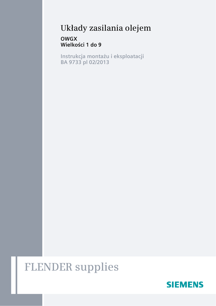Układy zasilania olejem OWGX Wielkości 1 do 9 Instrukcja montażu i eksploatacji BA 9733 pl 02/2013 FLENDER supplies Układy zasilania olejem OWGX Wielkości 1 do 9 Instrukcja montażu i eksploatacji Dane techniczne 1 Wskazówki ogólne 2 Wskazówki bezpieczeństwa 3 Transport i magazynowanie 4 Opis techniczny 5 Montaż 6 Uruchomienie 7 Eksploatacja 8 Nieprawidłowości, przyczyny i usuwanie 9 Tłumaczenie oryginalnej instrukcji montażu i eksploatacji BA 9733 pl 02/2013 2 / 31 Konserwacja i utrzymanie ruchu 10 Części zamienne, serwis 11 Deklaracje 12 Wskazówki i symbole w niniejszej instrukcji montażu i eksploatacji Uwaga: ”Instrukcja montażu i eksploatacji” będzie w dalszym ciągu tekstu nazywana ”Instrukcją” lub ”Podręcznikiem”. Wskazówki prawne Koncepcja wskazówek ostrzegawczych Niniejsza instrukcja zawiera wskazówki, których należy przestrzegać dla własnego bezpieczeństwa i celem uniknięcia szkód materialnych. Wskazówki dotyczące bezpieczeństwa własnego są oznakowane trójkątem ostrzegawczym lub opatrzone znakiem ”Ex” (w przypadku zastosowania dyrektywy 94/9/WE); wskazówki odnoszące się wyłącznie do ew. szkód materialnych są wyróżnione znakiem ”STOP”. OSTRZEŻENIE przed groźbą wybuchu! Wskazówek oznakowanych tym symbolem należy koniecznie przestrzegać, aby zapobiec szkodom spowodowanym przez wybuch. Ich nieprzestrzeganie grozi śmiercią lub ciężkim kalectwem. OSTRZEŻENIE przed groźbą szkód osobowych! Wskazówek oznakowanych tym symbolem należy koniecznie przestrzegać, aby zapobiec szkodom osobowym. Ich nieprzestrzeganie grozi śmiercią lub ciężkim kalectwem. OSTRZEŻENIE przed groźbą uszkodzenia produktu! Wskazówek oznakowanych tym symbolem należy koniecznie przestrzegać, by zapobiec uszkodzeniu produktu. Ich nieprzestrzeganie grozi szkodami materialnymi. WSKAZÓWKA! Wskazówki oznakowane tym symbolem należy traktować jako ogólne wskazówki obsługi. Ich nieprzestrzeganie może być przyczyną niepożądanych reakcji lub stanów. Ostrzeżenie o gorących powierzchniach! Wskazówek oznakowanych tym symbolem należy koniecznie przestrzegać, aby wykluczyć groźbę oparzenia na gorących powierzchniach. Ich nieprzestrzeganie grozi lekkimi lub ciężkimi obrażeniami ciała. W przypadku występowania kilku zagrożeń, stosowany jest znak wskazujący zagrożenie najpoważniejsze. W przypadku wskazówki ostrzegawczej z trójkątem ostrzegawczym informującej o groźbie szkód osobowych do odpowiedniego ostrzeżenia może być dołączone ostrzeżenie o szkodach materialnych. Wykwalifikowany personel Produkt lub system, do którego odnosi się niniejsza instrukcja może być obsługiwany wyłącznie przez wykwalifikowany personel przyuczony do wykonywania odpowiednich czynności przy przestrzeganiu instrukcji dotyczących tych czynności, zwłaszcza zaś wskazówek bezpieczeństwa i wskazówek ostrzegawczych zawartych w takich instrukcjach. Przy użytkowaniu takich produktów lub systemów wykwalifikowany personel jest w stanie - ze względu na swoje wykształcenie i doświadczenie - rozpoznać ewentualne niebezpieczeństwa i zagrożenia. BA 9733 pl 02/2013 3 / 31 Wykorzystanie produktów Siemens zgodnie z przeznaczeniem Konieczne jest przestrzeganie poniższych wskazówek: Produkty Siemens wolno eksploatować wyłącznie do celów użytkowych wskazanych w katalogu i przynależnej dokumentacji technicznej. W przypadku wykorzystania produktów lub elementów składowych innych producentów, wymagane jest, aby były one zalecane lub dopuszczone przez firmę Siemens. Warunkiem prawidłowej i bezpiecznej eksploatacji produktów jest prawidłowy transport, prawidłowe magazynowanie i ustawienie, prawidłowy montaż, prawidłowa instalacja, prawidłowe uruchomienie, prawidłowa obsługa i konserwacja . Konieczne jest zapewnienie dopuszczalnych wa‐ runków otoczenia. Konieczne jest przestrzeganie wskazówek zawartych w przynależnej dokumentacji. Marki Wszystkie nazwy opatrzone znakiem chronionego znaku towarowego ® są zarejestrowanymi markami firmy Siemens AG. Pozostałe nazwy zawarte w niniejszej instrukcji mogą być markami, których wykorzystanie na własny użytek przez strony trzecie może stanowić naruszenie właścicieli praw do takich marek. Wyłączenie odpowiedzialności Zawartość niniejszej instrukcji została przez nas sprawdzona na zgodność z opisanymi w niej oprzyrządowaniem i oprogramowaniem. Niemniej nie jest możliwe wykluczenie odstępstw, przez co nie przejmujemy odpowiedzial‐ ności za pełną zgodność w tym względzie. Informacje zawarte w niniejszej instrukcji są regularnie sprawdzane, a wymagane poprawki są przejmowane do kolejnych wydań instrukcji. Symbole Przyłącze uziemienia Punkt odpowietrzania barwa żółta Punkt wlewu oleju barwa żółta Punkt spustu oleju barwa biała Poziom oleju barwa czerwona Poziom oleju barwa czerwona Poziom oleju barwa czerwona Przyłącze układu czujnikowego drgań Punkt smarowania barwa czerwona Nałożyć smar Ucho transportowe Śruba z uchem Nie wkręcać Powierzchnia kontroli ustawienia, w poziomie Powierzchnia kontroli ustawienia, w pionie Te symbole ilustrują sposób pomiaru poziomu oleju za pomocą prętowego wskaźnika poziomu oleju. Te symbole wskazują potrzebę stałego, silnego dokręcenia prętowego wskaźnika poziomu oleju. BA 9733 pl 02/2013 4 / 31 Spis treści 1. Dane techniczne . . . . . . . . . . . . . . . . . . . . . . . . . . . . . . . . . . . . . . . . . . . . . . . . . . . 7 1.1 1.2 1.3 Ogólne dane techniczne . . . . . . . . . . . . . . . . . . . . . . . . . . . . . . . . . . . . . . . . . . . . . . . . . . . . . . . . . . . . . Lepkość oleju i rodzaj oleju . . . . . . . . . . . . . . . . . . . . . . . . . . . . . . . . . . . . . . . . . . . . . . . . . . . . . . . . . . . Warunki otoczenia . . . . . . . . . . . . . . . . . . . . . . . . . . . . . . . . . . . . . . . . . . . . . . . . . . . . . . . . . . . . . . . 