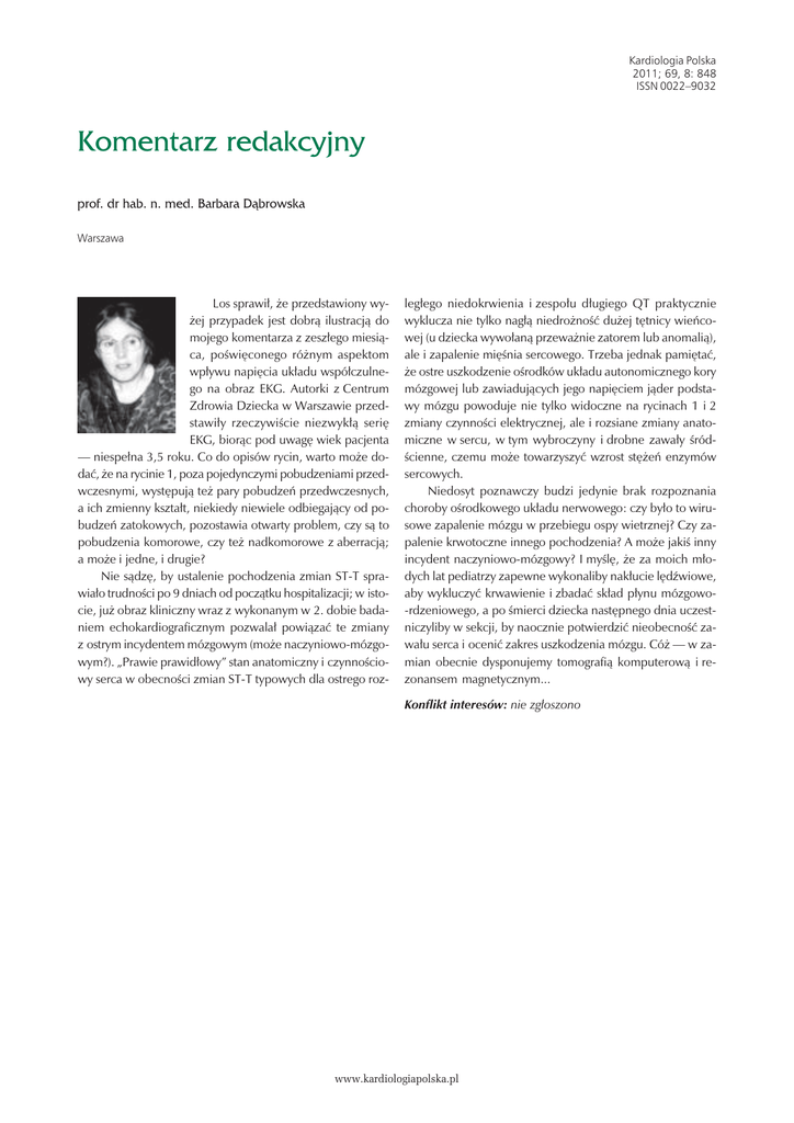 Kardiologia Polska 2011; 69, 8: 848 ISSN 0022–9032 Komentarz redakcyjny Komentarz redakcyjny prof. dr hab. n. med. Barbara Dąbrowska Warszawa Los sprawił, że przedstawiony wyżej przypadek jest dobrą ilustracją do mojego komentarza z zeszłego miesiąca, poświęconego różnym aspektom wpływu napięcia układu współczulnego na obraz EKG. Autorki z Centrum Zdrowia Dziecka w Warszawie przedstawiły rzeczywiście niezwykłą serię EKG, biorąc pod uwagę wiek pacjenta — niespełna 3,5 roku. Co do opisów rycin, warto może dodać, że na rycinie 1, poza pojedynczymi pobudzeniami przedwczesnymi, występują też pary pobudzeń przedwczesnych, a ich zmienny kształt, niekiedy niewiele odbiegający od pobudzeń zatokowych, pozostawia otwarty problem, czy są to pobudzenia komorowe, czy też nadkomorowe z aberracją; a może i jedne, i drugie? Nie sądzę, by ustalenie pochodzenia zmian ST-T sprawiało trudności po 9 dniach od początku hospitalizacji; w istocie, już obraz kliniczny wraz z wykonanym w 2. dobie badaniem echokardiograficznym pozwalał powiązać te zmiany z ostrym incydentem mózgowym (może naczyniowo-mózgowym?). „Prawie prawidłowy” stan anatomiczny i czynnościowy serca w obecności zmian ST-T typowych dla ostrego roz- ległego niedokrwienia i zespołu długiego QT praktycznie wyklucza nie tylko nagłą niedrożność dużej tętnicy wieńcowej (u dziecka wywołaną przeważnie zatorem lub anomalią), ale i zapalenie mięśnia sercowego. Trzeba jednak pamiętać, że ostre uszkodzenie ośrodków układu autonomicznego kory mózgowej lub zawiadujących jego napięciem jąder podstawy mózgu powoduje nie tylko widoczne na rycinach 1 i 2 zmiany czynności elektrycznej, ale i rozsiane zmiany anatomiczne w sercu, w tym wybroczyny i drobne zawały śródścienne, czemu może towarzyszyć wzrost stężeń enzymów sercowych. Niedosyt poznawczy budzi jedynie brak rozpoznania choroby ośrodkowego układu nerwowego: czy było to wirusowe zapalenie mózgu w przebiegu ospy wietrznej? Czy zapalenie krwotoczne innego pochodzenia? A może jakiś inny incydent naczyniowo-mózgowy? I myślę, że za moich młodych lat pediatrzy zapewne wykonaliby nakłucie lędźwiowe, aby wykluczyć krwawienie i zbadać skład płynu mózgowo-rdzeniowego, a po śmierci dziecka następnego dnia uczestniczyliby w sekcji, by naocznie potwierdzić nieobecność zawału serca i ocenić zakres uszkodzenia mózgu. Cóż — w zamian obecnie dysponujemy tomografią komputerową i rezonansem magnetycznym... Konflikt interesów: nie zgłoszono www.kardiologiapolska.pl