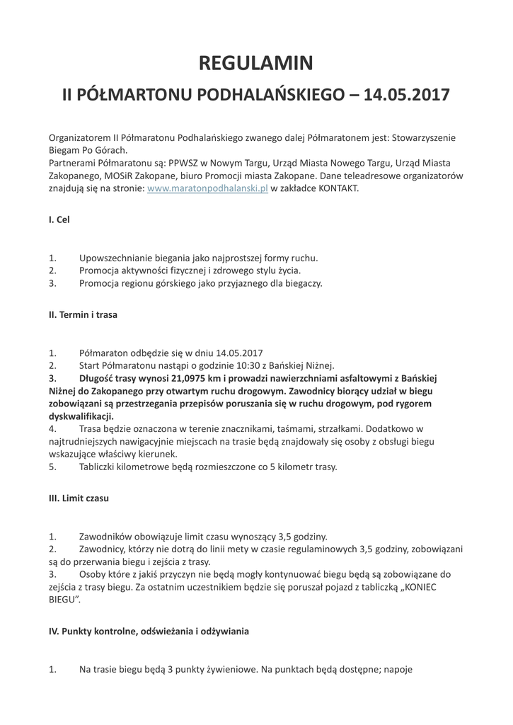 REGULAMIN II PÓŁMARTONU PODHALAŃSKIEGO – 14.05.2017 Organizatorem II Półmaratonu Podhalańskiego zwanego dalej Półmaratonem jest: Stowarzyszenie Biegam Po Górach. Partnerami Półmaratonu są: PPWSZ w Nowym Targu, Urząd Miasta Nowego Targu, Urząd Miasta Zakopanego, MOSiR Zakopane, biuro Promocji miasta Zakopane. Dane teleadresowe organizatorów znajdują się na stronie: www.maratonpodhalanski.pl w zakładce KONTAKT. I. Cel 1. 2. 3. Upowszechnianie biegania jako najprostszej formy ruchu. Promocja aktywności fizycznej i zdrowego stylu życia. Promocja regionu górskiego jako przyjaznego dla biegaczy. II. Termin i trasa 1. Półmaraton odbędzie się w dniu 14.05.2017 2. Start Półmaratonu nastąpi o godzinie 10:30 z Bańskiej Niżnej. 3. Długość trasy wynosi 21,0975 km i prowadzi nawierzchniami asfaltowymi z Bańskiej Niżnej do Zakopanego przy otwartym ruchu drogowym. Zawodnicy biorący udział w biegu zobowiązani są przestrzegania przepisów poruszania się w ruchu drogowym, pod rygorem dyskwalifikacji. 4. Trasa będzie oznaczona w terenie znacznikami, taśmami, strzałkami. Dodatkowo w najtrudniejszych nawigacyjnie miejscach na trasie będą znajdowały się osoby z obsługi biegu wskazujące właściwy kierunek. 5. Tabliczki kilometrowe będą rozmieszczone co 5 kilometr trasy. III. Limit czasu 1. Zawodników obowiązuje limit czasu wynoszący 3,5 godziny. 2. Zawodnicy, którzy nie dotrą do linii mety w czasie regulaminowych 3,5 godziny, zobowiązani są do przerwania biegu i zejścia z trasy. 3. Osoby które z jakiś przyczyn nie będą mogły kontynuować biegu będą są zobowiązane do zejścia z trasy biegu. Za ostatnim uczestnikiem będzie się poruszał pojazd z tabliczką „KONIEC BIEGU”. IV. Punkty kontrolne, odświeżania i odżywiania 1. Na trasie biegu będą 3 punkty żywieniowe. Na punktach będą dostępne; napoje izotoniczne, woda, pomarańcze, banany, czekolada. Dokładna lokalizacja punktów została oznaczona na mapie biegu. 2. W pobliżu punktów żywieniowych w szczególnych warunkach mogą być zlokalizowane, punkty odświeżania lub systemy zraszania wodą. 3. Punkty kontrolne zlokalizowane będą na trasie w kilku miejscach. V. Warunki uczestnictwa 1. W II Półmaratonie Podhalańskim startować mogą wyłącznie osoby pełnoletnie, które w dniu 14.05.2017 będą miały ukończone 18 lat. Limit uczestników na II Półmaratonie Podhalańskim wynosi 300 (w tym 25 do dyspozycji organizatora). 2. Warunkiem uczestnictwa w II Półmaratonie Podhalańskim jest prawidłowe wypełnienie Formularza Rejestracyjnego. Przekazanie prawidłowo wypełnionego formularza odbywa się w formie elektronicznej na stronie www.maratonpodhalanski.pl w zakładce ZAPISY. 3. Wypełnienie Formularza Rejestracyjnego i dokonanie Opłaty startowej jest jednoznaczne z akceptacją niniejszego Regulaminu. 4. Każdy uczestnik I Półmaratonu Podhalańskiego musi zostać zweryfikowany osobiście lub za pośrednictwem upoważnionej do tego osoby (patrz pkt.V ppkt.6) w biurze zawodów. Biuro będzie się znajdowało w budynku Podhalańskiej Państwowej Wyższej Szkoły Zawodowej Nowym Targu ul. Kokoszków 71, otwarte będzie 13.05.2017 roku (sobota) w godzinach 10.00–14.00. W dniu biegu 14.05.2017 (niedziela) biuro zawodów będzie czynne w godzinach od 9:15 do 10:00 w pobliżu startu na Bańskiej Niżnej 5. W ramach opłaty startowej uczestnik otrzymuje: – imienny numer startowy z chipem - pamiątkowy pasek biegowy na numer startowy z dodatkową kieszonką, - Dla chętnych za dodatkową opłatą 20zł koszulka pamiątkowa, opcja możliwa tylko dla zawodników zapisanych przed 15 kwietnia – folder informacyjny z mapą biegu, – 10 Dutków Podhalańskich (patrz pkt.VI), – dostęp do posiłków i napojów regeneracyjnych na trasie biegu, – możliwość skorzystania z depozytu na starcie (worek dostępny w punkcie odbioru depozytu na stracie w dniu 14.05.2017), – transport depozytu ze startu na metę, – ew. dodatkowe świadczenia uzależnione od pozyskanych sponsorów, – pamiątkowy medal na mecie. 5. Warunkiem odbioru zestawu startowego jest okazanie przez zawodnika w biurze zawodów, dowodu osobistego bądź innego dokumentu stwierdzającego jego tożsamość oraz potwierdzenia dowodu wpłaty wpisowego. 6. Odbiór pakietu startowego w imieniu innej osoby jest możliwy na podstawie podpisanego oświadczenia tej osoby oraz kserokopii dowodu osobistego zgłoszonego zawodnika. Dodatkowo należy przedstawić podpisane przez Uczestnika Biegu Oświadczenie. 7. Uczestników maratonu obowiązują przepisy ruchu drogowego oraz niniejszy regulamin. 8. Depozyty ubraniowe: zawodnicy mogą otrzymać worek oznaczony numerem startowym, umożliwiający zdeponowanie rzeczy w specjalnie wyznaczonym miejscu przy starcie. Worek z depozytu można będzie odebrać tylko na podstawie numeru startowego na mecie zawodów. W przypadku zgubienia przez zawodnika numeru startowego, Organizator jest zwolniony z odpowiedzialności za pobranie worka przez inną osobę. Uwaga: osoby pozostawiające w depozycie przedmioty wartościowe oraz dokumenty robią to na własną odpowiedzialność, Organizator nie ponosi za nie odpowiedzialności. 9. Organizator nie zapewnia miejsc noclegowych dla zawodników. 10. Osoby niepełnosprawne, które chciałyby wystartować w II Półmaratonie podhalańskim proszone są o kontakt: [email protected] VI. Dutki Podhalańskie 1. Dutki Podhalańskie wewnętrzna waluta Maratonu Podhalańskiego zwana dalej dutkami. Występuje w nominałach 5 oraz 10 Dutków Podhalańskich. 2. Dutki pełnią funkcje wewnętrznych kuponów do otrzymania świadczeń biegu. Zawodnicy za ich pomocą będą mogli zakupić pamiątki w sklepiku Maratonu Podhalańskiego, opłacić dodatkowe usługi związane z biegiem. 3. Przy wykorzystywaniu Dutków stosuje się bezpośredni przelicznik: 1 Dutek Podhalański = 1 PLN. Jednocześnie nie ma możliwości wymiany Dutków na złotówki. 4. Dopu