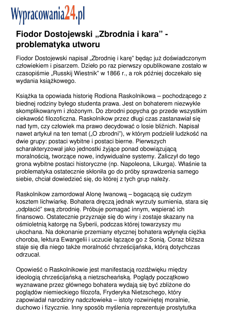Fiodor Dostojewski „Zbrodnia i kara” problematyka utworu Fiodor Dostojewski napisał „Zbrodnię i karę” będąc już doświadczonym człowiekiem i pisarzem. Dzieło po raz pierwszy opublikowane zostało w czasopiśmie „Russkij Wiestnik” w 1866 r., a rok później doczekało się wydania książkowego. Książka ta opowiada historię Rodiona Raskolnikowa – pochodzącego z biednej rodziny byłego studenta prawa. Jest on bohaterem niezwykle skomplikowanym i złożonym. Do zbrodni popycha go przede wszystkim ciekawość filozoficzna. Raskolnikow przez długi czas zastanawiał się nad tym, czy człowiek ma prawo decydować o losie bliźnich. Napisał nawet artykuł na ten temat („O zbrodni”), w którym podzielił ludzkość na dwie grupy: postaci wybitne i postaci bierne. Pierwszych scharakteryzował jako jednostki żyjące ponad obowiązującą moralnością, tworzące nowe, indywidualne systemy. Zaliczył do tego grona wybitne postaci historyczne (np. Napoleona, Likurga). Właśnie ta problematyka ostatecznie skłoniła go do próby sprawdzenia samego siebie, chciał dowiedzieć się, do której z tych grup należy. Raskolnikow zamordował Alonę Iwanową – bogacącą się cudzym kosztem lichwiarkę. Bohatera dręczą jednak wyrzuty sumienia, stara się „odpłacić” swą zbrodnię. Próbuje pomagać innym, wspierać ich finansowo. Ostatecznie przyznaje się do winy i zostaje skazany na ośmioletnią katorgę na Syberii, podczas której towarzyszy mu ukochana. Na dokonanie przemiany etycznej bohatera wpłynęła ciężka choroba, lektura Ewangelii i uczucie łączące go z Sonią. Coraz bliższa staje się dla niego także moralność chrześcijańska, którą dotychczas odrzucał. Opowieść o Raskolnikowie jest manifestacją rozdźwięku między ideologią chrześcijańską a nietzscheańską. Poglądy początkowo wyznawane przez głównego bohatera wydają się być zbliżone do poglądów niemieckiego filozofa, Fryderyka Nietzschego, który zapowiadał narodziny nadczłowieka – istoty rozwiniętej moralnie, duchowo i fizycznie. Inny sposób myślenia reprezentuje prostytutka Sonia. Wierzy ona w Boski porządek świata i nakłania Raskolnikowa, by ten przyznał się do zbrodni. Ma nadzieję, że odpokutowanie winy pomoże mu odnaleźć wewnętrzny spokój. W „Zbrodni i karze” Fiodor Dostojewski poruszył także kwestię sumienia i sprawiedliwości. Popełnione przez Raskolnikowa morderstwo skutkuje nękającymi go wyrzutami. Nie może on odnaleźć wewnętrznego spokoju, dręczą go koszmarne sny. W uśnieżeniu bólu nie pomagają nawet dobre uczynki. Sonia pokazuje bohaterowi inną drogę – drogę skruchy. Tylko przyznanie się do winy może zapewnić mu ulgę. Motyw ten pokazuje, że każda zbrodnia musi zostać odkupiona. Sprawiedliwość wydaje się być uniwersalną wartością nieograniczającą się tylko do sądu instytucjonalnego. Dotknie ona każdego, niezależnie od tego, jak bardzo będzie próbował się ukryć. Dzieło Dostojewskiego przedstawia także obraz dziewiętnastowiecznego społeczeństwa zamieszkującego ówczesną stolicę Rosji – Petersburg. Jest to sfera, w której bieda i bogactwo nieustannie się ze sobą ścierają. Nierówność społeczna jest widoczna bez trudu. Bohater, przechadzając się ulicami miasta, często widzi wspaniałe powozy i elegancko ubranych ludzi. Brutalna i odpychająca patologia (reprezentowana przez Łużyna i Swidrygajłowa) rodzi się zaś w miejscach, gdzie ludzie żyją w nędzy, a przemoc poznają już we wczesnym dzieciństwie. Wymowę „Zbrodni i kary” można uznać za prochrześcijańską. Przekroczenie zasad moralnych przez głównego bohatera prowadzi do jego wielkiego cierpienia. Jedyną skuteczną metodą na pokonanie tego stanu jest dobrowolne poddanie się karze. Okazuje się, że jednostki wyłączone ze zbiorowej moralności są tylko mrzonką. Każdego obowiązują te same, uniwersalne prawa. Autor pokazał także złożoność ludzkiej psychiki, jaka przejawia się właśnie u głównego bohatera. Raskolnikow to ubogi student, usilnie walczący z poczuciem niższości, która wynika z wielkiej biedy, jakiej doświadcza. Być może jest to przyczyna powstania jego teorii o dwóch rodzajach ludzi. Jednak po dokonaniu morderstwa, Raskolnikow jeszcze raz zweryfikował swoje poglądy. Każda zbrodnia pociąga za sobą karę, a nawet jeśli nie nałoży jej sąd, zrobi to sumienie. „Zbrodnia i kara” to poruszająca opowieść o uniwersalnym przesłaniu. Autor pokazuje, że znacznie trudniejszą metodą pokuty jest pokuta duchowa. Ukazuje także granice wytrzymałości ludzkiej psychiki, która nie jest w stanie znieść wszystkiego. Raskolnikow najpierw nie radzi sobie ze swoim ubóstwem, a później z popełnioną przez siebie zbrodnią. Jednak świat „Zbrodni i kary” nie jest pozbawiony pozytywów. Taką rolę pełni miłość – uczucie, dzięki któremu główny bohater dostał impuls do zmiany.