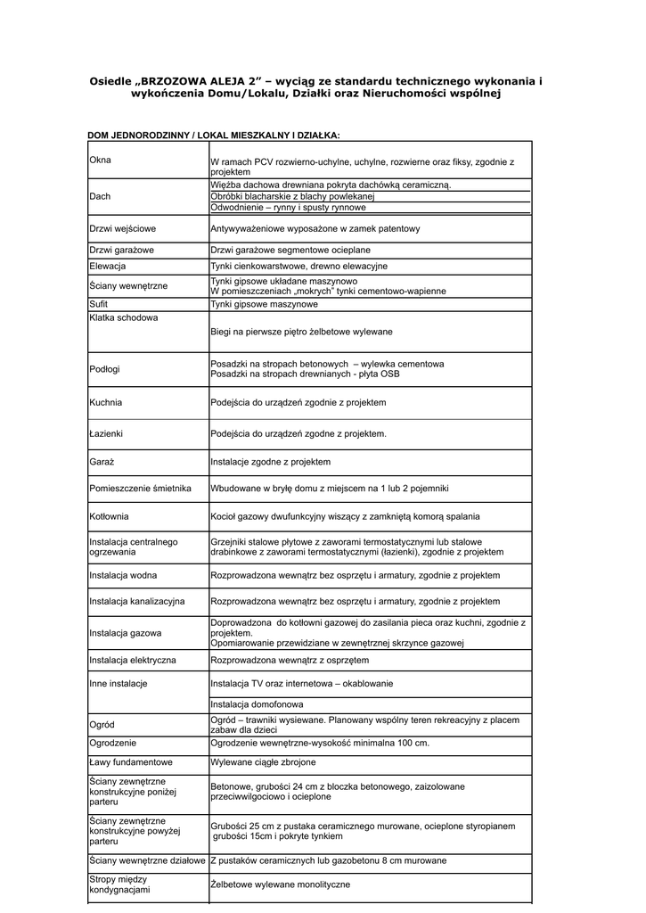 Osiedle „BRZOZOWA ALEJA 2” – wyciąg ze standardu technicznego wykonania i wykończenia Domu/Lokalu, Działki oraz Nieruchomości wspólnej DOM JEDNORODZINNY / LOKAL MIESZKALNY I DZIAŁKA: Okna Dach W ramach PCV rozwierno-uchylne, uchylne, rozwierne oraz fiksy, zgodnie z projektem Więźba dachowa drewniana pokryta dachówką ceramiczną. Obróbki blacharskie z blachy powlekanej Odwodnienie – rynny i spusty rynnowe Drzwi wejściowe Antywyważeniowe wyposażone w zamek patentowy Drzwi garażowe Drzwi garażowe segmentowe ocieplane Elewacja Tynki cienkowarstwowe, drewno elewacyjne Ściany wewnętrzne Sufit Klatka schodowa Tynki gipsowe układane maszynowo W pomieszczeniach „mokrych” tynki cementowo-wapienne Tynki gipsowe maszynowe Biegi na pierwsze piętro żelbetowe wylewane Podłogi Posadzki na stropach betonowych – wylewka cementowa Posadzki na stropach drewnianych - płyta OSB Kuchnia Podejścia do urządzeń zgodnie z projektem Łazienki Podejścia do urządzeń zgodne z projektem. Garaż Instalacje zgodne z projektem Pomieszczenie śmietnika Wbudowane w bryłę domu z miejscem na 1 lub 2 pojemniki Kotłownia Kocioł gazowy dwufunkcyjny wiszący z zamkniętą komorą spalania Instalacja centralnego ogrzewania Grzejniki stalowe płytowe z zaworami termostatycznymi lub stalowe drabinkowe z zaworami termostatycznymi (łazienki), zgodnie z projektem Instalacja wodna Rozprowadzona wewnątrz bez osprzętu i armatury, zgodnie z projektem Instalacja kanalizacyjna Rozprowadzona wewnątrz bez osprzętu i armatury, zgodnie z projektem Instalacja gazowa Doprowadzona do kotłowni gazowej do zasilania pieca oraz kuchni, zgodnie z projektem. Opomiarowanie przewidziane w zewnętrznej skrzynce gazowej Instalacja elektryczna Rozprowadzona wewnątrz z osprzętem Inne instalacje Instalacja TV oraz internetowa – okablowanie Instalacja domofonowa Ogrodzenie Ogród – trawniki wysiewane. Planowany wspólny teren rekreacyjny z placem zabaw dla dzieci Ogrodzenie wewnętrzne-wysokość minimalna 100 cm. Ławy fundamentowe Wylewane ciągłe zbrojone Ściany zewnętrzne konstrukcyjne poniżej parteru Betonowe, grubości 24 cm z bloczka betonowego, zaizolowane przeciwwilgociowo i ocieplone Ściany zewnętrzne konstrukcyjne powyżej parteru Grubości 25 cm z pustaka ceramicznego murowane, ocieplone styropianem grubości 15cm i pokryte tynkiem Ogród Ściany wewnętrzne działowe Z pustaków ceramicznych lub gazobetonu 8 cm murowane Stropy między kondygnacjami Żelbetowe wylewane monolityczne Ściany wewnętrzne działowe Z pustaków ceramicznych lub gazobetonu 8 cm murowane Stropy między kondygnacjami Żelbetowe wylewane monolityczne Strop poddasza nad piętrem Belki drewniane z izolacją akustyczną, sufit podwieszany – płyta GK na ruszcie stalowym Balkony (na piętrze) Wylewane żelbetowe (bez płytek na kleju) Taras naziemny i schody wejściowe Z kostki betonowej lub płyty betonowej Kominek W budynku zaprojektowano trzon kominowy umożliwiający podłączenie kominka wewnętrznego z zamykanym wkładem , wyposażonego w systemowy wkład kominowy NIERUCHOMOŚĆ WSPÓLNA: Ogrodzenie Drogi, chodniki i podjazdy Ogrodzenie zewnętrzne systemowe – siatka zgrzewana na słupkach stalowych (wysokość minimalna 150 cm) oraz brama wjazdowa lub szlaban wyposażona w system wideo domofonowy. Kostka brukowa betonowa Rekreacja Zagospodarowanie wspólnego terenu rekreacyjnego Media, instalacje zewnętrzne Elektryczna z sieci miejskiej Wodociągowa z sieci miejskiej ze wspólnym przyłączem dla całego osiedla Odprowadzenie ścieków do kanalizacji miejskiej grawitacyjne oraz poprzez instalację tłoczną Gazowa z sieci miejskiej Oświetlenie ulic wewnętrznych Odprowadzenie wód opadowych z dachów oraz z drogi do zbiorników chłonnoodparowujących Podziemny szczelny zbiornik wodny dla celów ochrony przeciwpożarowej wraz z instalacją napełniania i poboru wody