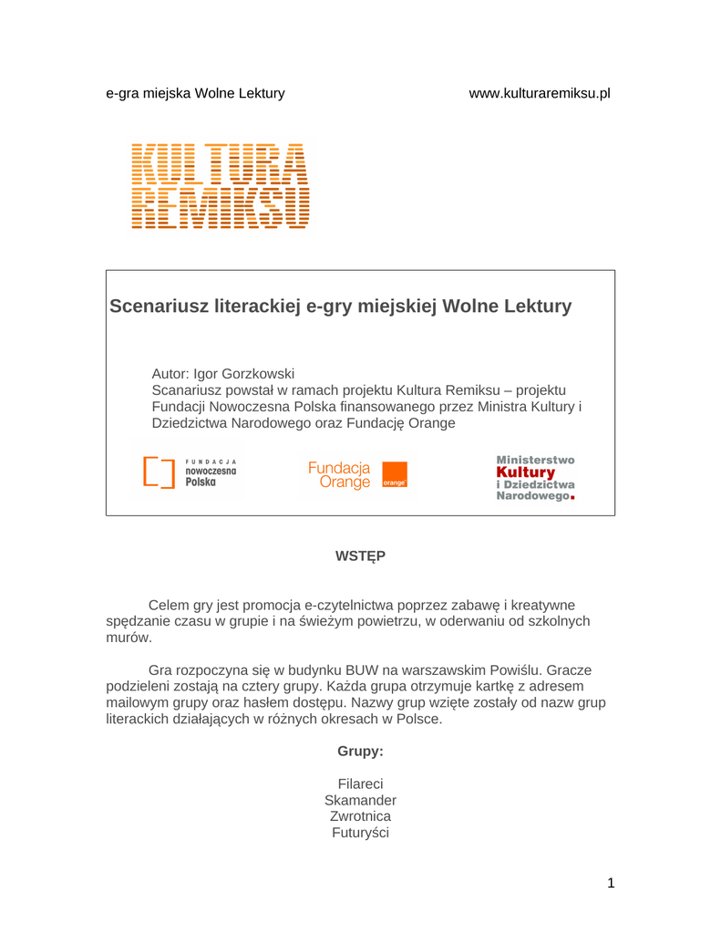 e-gra miejska Wolne Lektury www.kulturaremiksu.pl Scenariusz literackiej e-gry miejskiej Wolne Lektury Autor: Igor Gorzkowski Scanariusz powstał w ramach projektu Kultura Remiksu – projektu Fundacji Nowoczesna Polska finansowanego przez Ministra Kultury i Dziedzictwa Narodowego oraz Fundację Orange WSTĘP Celem gry jest promocja e-czytelnictwa poprzez zabawę i kreatywne spędzanie czasu w grupie i na świeżym powietrzu, w oderwaniu od szkolnych murów. Gra rozpoczyna się w budynku BUW na warszawskim Powiślu. Gracze podzieleni zostają na cztery grupy. Każda grupa otrzymuje kartkę z adresem mailowym grupy oraz hasłem dostępu. Nazwy grup wzięte zostały od nazw grup literackich działających w różnych okresach w Polsce. Grupy: Filareci Skamander Zwrotnica Futuryści 1 e-gra miejska Wolne Lektury www.kulturaremiksu.pl Grupy komunikują się za pomocą laptopa lub tabletu z dostępem do internetu. Na założonych specjalnie na użytek gry skrzynkach pocztowych czekają trzy wiadomości: 1. Wiadomość od organizatorów gry: Informacja o zasadach gry, informacje ogólne, numery telefonów awaryjnych itp. 2. List - powitanie od Wielkiego Bibliotekarza. 3. List od Wielkiego Bibliotekarza z pierwszą zagadką. Po rozwiązaniu pierwszej zagadki gracze otrzymują drogą mailową adres pierwszej lokalizacji. Oraz informację o tym że hasło rozpoznawcze ludzi Bibliotekarza to: WOLNE LEKTURY odzew: NIECH ŻYJĄ Załączniki: List od organizatorów: Drodzy gracze! Przed Wami niecodzienne e-literackie wyzwanie. Powierzamy Wam misję odnalezienie Wielkiego e-Bibliotekarza. Jest on niezbędny do uratowania e-książek (które trawi groźny wirus) i bardzo nam zależy na spotkaniu z nim, ale jest niezwykle wymagający i postawił szereg warunków zanim zdecyduje się nam pomóc. Od tej chwili zostajecie podzieleni na 4 zespoły, które realizować będą zadania i raportować je bezpośrednio Wielkiemu e-Bibliotekarzowi. Mamy z nim kontakt telefoniczny: nr telefonu mailowy: [email protected] (adres przykładowy) Oto nazwy Waszych grup: 1. Skamander 2. Filareci 3. Futuryści 4. Zwrotnica Oddajemy Wam do dyspozycji tablety z dostępem do internetu oraz kompletem Wolnych Lektur, które wyjątkowo upodobał sobie e-Bibliotekarz. 2 e-gra miejska Wolne Lektury www.kulturaremiksu.pl Aby otrzymać zadanie, za każdym razem musicie podać hasło: Wolne Lektury. Po wykonaniu zadania musicie zgłosić się do Wielkiego e-Bibliotekarza, który powie Wam, jakie dalsze kroki przedsięwziąć i jak się do niego zbliżyć. Na realizację zadania macie czas do godz. 13:30. Jeśli nie uda Wam się odnaleźć go do tej pory, koniecznie zadzwońcie do niego najpóźniej o 13:31 z prośbą o instrukcję awaryjną. Zwycięża drużyna, która pierwsza odnajdzie naszego bohatera. Powodzenia! Bardzo liczymy na Waszą pomoc e-czytelnicy + telefon kontaktowy w nagłych wypadkach: nr telefonu List powitanie od Bibliotekarza: Przyjaciele, Jeszcze się nie znamy, ale to kwestia niedługiego czasu... Możecie mnie nazywać WIELKIM BIBLIOTEKARZEM albo po prostu BIBLIOTEKARZEM. Jestem przewodniczącym tajnego Stowarzyszenia chroniącego książki. Nastały czasy chude i mroczne. Stada wirusów i żarłocznych moli atakują moje księgozbiory. Nie będę ukrywał, potrzebuję Waszej pomocy! Wkrótce otrzymacie dalsze instrukcje. NIECH ŻYJĄ WOLNE LEKTURY! Wasz WIELKI BIBLIOTEKARZ 3 e-gra miejska Wolne Lektury www.kulturaremiksu.pl Listy od Bibliotekarza z pierwszymi zagadkami: Witajcie, Oto pierwsze zadanie. Wybierzcie właściwą odpowiedź i prześlijcie ją na mój adres mailowy. Jeżeli odpowiedź będzie prawidłowa, prześlę Wam nazwę i adres miejsca gdzie powinniście się niezwłocznie udać. NIECH ŻYJĄ WOLNE LEKTURY Z poważaniem WIELKI BIBLIOTEKARZ Stowarzyszenie literackie Skamander Spotykało się w: A. Kawiarni Jama Michalikowa w Krakowie B. Kawiarni Pod Picadorem w Warszawie C. Domu Słowa Polskiego w Warszawie Witajcie, Oto pierwsze zadanie. Wybierzcie właściwą odpowiedź i prześlijcie ją na mój adres mailowy. Jeżeli odpowiedź będzie prawidłowa prześlę wam nazwę i adres miejsca gdzie powinniście się niezwłocznie udać. NIECH ŻYJĄ WOLNE LEKTURY Z poważaniem WIELKI BIBLIOTEKARZ Grupa literacka Futuryści wydawała pismo literackie: A. M3 czyli Miasto masa maszyna B. Tygodnik literacki C. Nuż w bżuhu 4 e-gra miejska Wolne Lektury www.kulturaremiksu.pl Witajcie, Oto pierwsze zadanie. Wybierzcie właściwą odpowiedź i prześlijcie ją na mój adres mailowy. Jeżeli odpowiedź będzie prawidłowa prześlę Wam nazwę i adres miejsca gdzie powinniście się niezwłocznie udać. NIECH ŻYJĄ WOLNE LEKTURY Z poważaniem WIELKI BIBLIOTEKARZ Stowarzyszenie Filareci wzięło swą nazwę od: A. Greckiego słowa philáretos oznaczającego miłośnika cnoty moralnej. B. Salonu w pałacu Zamoyskich w Wilnie otoczonego filarami, w którym spotykali się członkowie stowarzyszenia. C. Od nazwy znaku tak zwanej filary, który nosili w klapie surdutu członkowie stowarzyszenia. Witajcie, Oto pierwsze zadanie. Wybierzcie właściwą odpowiedź i prześlijcie ją na mój adres mailowy. Jeżeli odpowiedź będzie prawidłowa prześlę wam nazwę i adres miejsca gdzie powinniście się niezwłocznie udać. NIECH ŻYJĄ WOLNE LEKTURY Z poważaniem WIELKI BIBLIOTEKARZ Grupa literacka Zwrotnica wzięła swą nazwę od: a. Nazwiska jej założyciela pisarza i malarza Jana Zwrotnicy b. Pisma literackiego wydawanego w Warszawie c. Pisma literackiego wydawanego w Krakowie Od wyruszenia z BUW gra będzie miała następujący schemat: a. b. c. d. Znaleźć miejsce. Zidentyfikować lekturę lub autora Rozwiązać zadanie związane z lekturą. Rozwiązane zadanie pozwala nawiązać kontakt z Bibliotekarzem, który dostarcza danych koniecznych do znalezienia kolejnego miejsca. 5 e-gra miejska Wolne Lektury www.kulturaremiksu.pl -------------------------------------------------------------------------------------