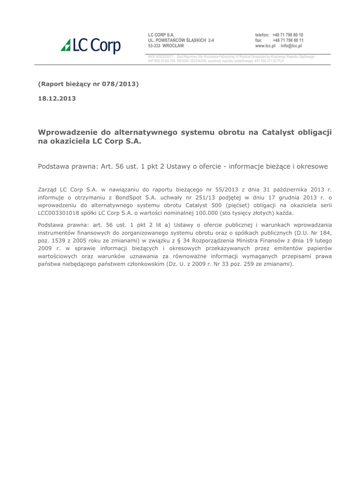 LC CORP S.A. UL. POWSTAŃCÓW ŚLĄSKICH 2-4 53-333 WROCŁAW telefon: +48 71 798 80 10 fax: +48 71 798 80 11 www.lcc.pl [email protected] KRS 0000253077 - Sąd Rejonowy dla Wrocławia-Fabrycznej VI Wydział Gospodarczy Krajowego Rejestru Sądowego NIP 899-25-62-750, REGON: 020246398, wysokość kapitału zakładowego: 447.558.311,00 PLN 1 (Raport bieżący nr 078/2013) 18.12.2013 Wprowadzenie do alternatywnego systemu obrotu na Catalyst obligacji na okaziciela LC Corp S.A. Podstawa prawna: Art. 56 ust. 1 pkt 2 Ustawy o ofercie - informacje bieżące i okresowe Zarząd LC Corp S.A. w nawiązaniu do raportu bieżącego nr 55/2013 z dnia 31 października 2013 r. informuje o otrzymaniu z BondSpot S.A. uchwały nr 251/13 podjętej w dniu 17 grudnia 2013 r. o wprowadzeniu do alternatywnego systemu obrotu Catalyst 500 (pięćset) obligacji na okaziciela serii LCC003301018 spółki LC Corp S.A. o wartości nominalnej 100.000 (sto tysięcy złotych) każda. Podstawa prawna: art. 56 ust. 1 pkt 2 lit a) Ustawy o ofercie publicznej i warunkach wprowadzania instrumentów finansowych do zorganizowanego systemu obrotu oraz o spółkach publicznych (D.U. Nr 184, poz. 1539 z 2005 roku ze zmianami) w związku z § 34 Rozporządzenia Ministra Finansów z dnia 19 lutego 2009 r. w sprawie informacji bieżących i okresowych przekazywanych przez emitentów papierów wartościowych oraz warunków uznawania za równoważne informacji wymaganych przepisami prawa państwa niebędącego państwem członkowskim (Dz. U. z 2009 r. Nr 33 poz. 259 ze zmianami).