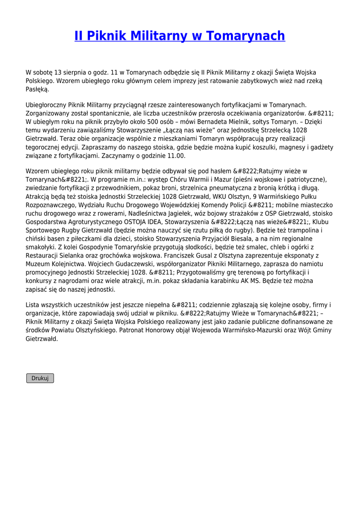 II Piknik Militarny w Tomarynach W sobotę 13 sierpnia o godz. 11 w Tomarynach odbędzie się II Piknik Militarny z okazji Święta Wojska Polskiego. Wzorem ubiegłego roku głównym celem imprezy jest ratowanie zabytkowych wież nad rzeką Pasłęką. Ubiegłoroczny Piknik Militarny przyciągnął rzesze zainteresowanych fortyfikacjami w Tomarynach. Zorganizowany został spontanicznie, ale liczba uczestników przerosła oczekiwania organizatorów. – W ubiegłym roku na piknik przybyło około 500 osób – mówi Bernadeta Mielnik, sołtys Tomaryn. – Dzięki temu wydarzeniu zawiązaliśmy Stowarzyszenie „Łączą nas wieże” oraz Jednostkę Strzelecką 1028 Gietrzwałd. Teraz obie organizacje wspólnie z mieszkaniami Tomaryn współpracują przy realizacji tegorocznej edycji. Zapraszamy do naszego stoiska, gdzie będzie można kupić koszulki, magnesy i gadżety związane z fortyfikacjami. Zaczynamy o godzinie 11.00. Wzorem ubiegłego roku piknik militarny będzie odbywał się pod hasłem „Ratujmy wieże w Tomarynach”. W programie m.in.: występ Chóru Warmii i Mazur (pieśni wojskowe i patriotyczne), zwiedzanie fortyfikacji z przewodnikiem, pokaz broni, strzelnica pneumatyczna z bronią krótką i długą. Atrakcją będą też stoiska Jednostki Strzeleckiej 1028 Gietrzwałd, WKU Olsztyn, 9 Warmińskiego Pułku Rozpoznawczego, Wydziału Ruchu Drogowego Wojewódzkiej Komendy Policji – mobilne miasteczko ruchu drogowego wraz z rowerami, Nadleśnictwa Jagiełek, wóz bojowy strażaków z OSP Gietrzwałd, stoisko Gospodarstwa Agroturystycznego OSTOJA IDEA, Stowarzyszenia „Łączą nas wieże”, Klubu Sportowego Rugby Gietrzwałd (będzie można nauczyć się rzutu piłką do rugby). Będzie też trampolina i chiński basen z piłeczkami dla dzieci, stoisko Stowarzyszenia Przyjaciół Biesala, a na nim regionalne smakołyki. Z kolei Gospodynie Tomaryńskie przygotują słodkości, będzie też smalec, chleb i ogórki z Restauracji Sielanka oraz grochówka wojskowa. Franciszek Gusal z Olsztyna zaprezentuje eksponaty z Muzeum Kolejnictwa. Wojciech Gudaczewski, współorganizator Pikniki Militarnego, zaprasza do namiotu promocyjnego Jednostki Strzeleckiej 1028. – Przygotowaliśmy grę terenową po fortyfikacji i konkursy z nagrodami oraz wiele atrakcji, m.in. pokaz składania karabinku AK MS. Będzie też można zapisać się do naszej jednostki. Lista wszystkich uczestników jest jeszcze niepełna – codziennie zgłaszają się kolejne osoby, firmy i organizacje, które zapowiadają swój udział w pikniku. „Ratujmy Wieże w Tomarynach” – Piknik Militarny z okazji Święta Wojska Polskiego realizowany jest jako zadanie publiczne dofinansowane ze środków Powiatu Olsztyńskiego. Patronat Honorowy objął Wojewoda Warmińsko-Mazurski oraz Wójt Gminy Gietrzwałd. Drukuj
