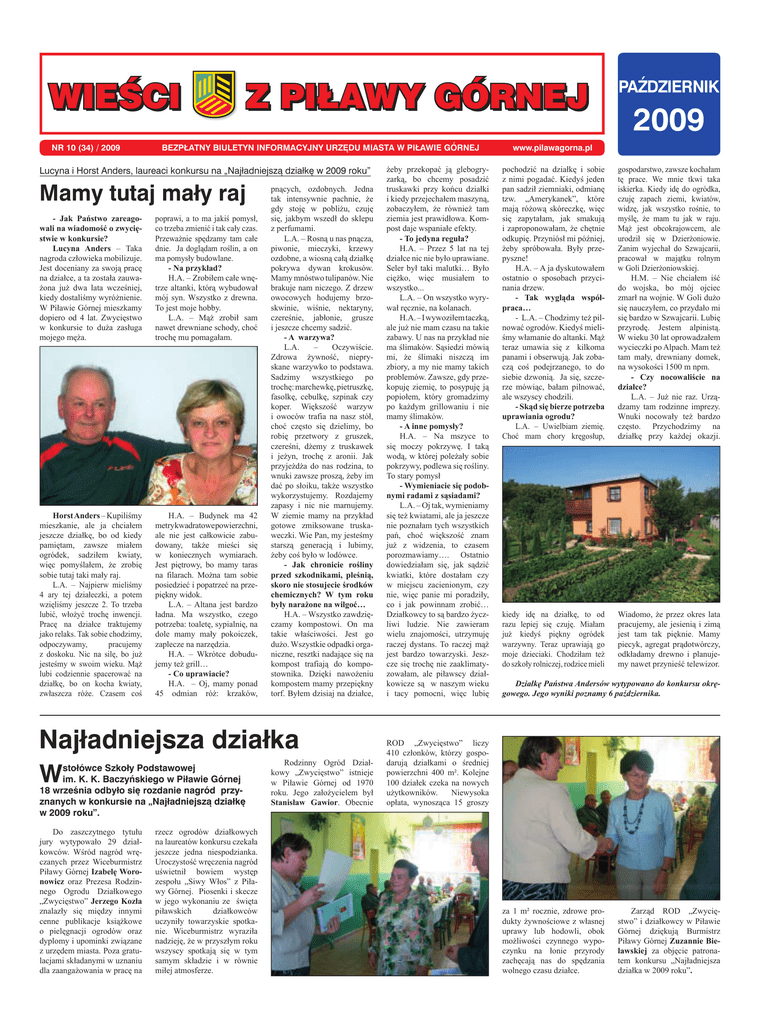 WIEŚCI NR 10 (34) / 2009 Z PIŁAWY GÓRNEJ BEZPŁATNY BIULETYN INFORMACYJNY URZĘDU MIASTA W PIŁAWIE GÓRNEJ Lucyna i Horst Anders, laureaci konkursu na „Najładniejszą działkę w 2009 roku” Mamy tutaj mały raj - Jak Państwo zareagowali na wiadomość o zwycięstwie w konkursie? Lucyna Anders – Taka nagroda człowieka mobilizuje. Jest doceniany za swoją pracę na działce, a ta została zauważona już dwa lata wcześniej, kiedy dostaliśmy wyróżnienie. W Piławie Górnej mieszkamy dopiero od 4 lat. Zwycięstwo w konkursie to duża zasługa mojego męża. poprawi, a to ma jakiś pomysł, co trzeba zmienić i tak cały czas. Przeważnie spędzamy tam całe dnie. Ja doglądam roślin, a on ma pomysły budowlane. - Na przykład? H.A. – Zrobiłem całe wnętrze altanki, którą wybudował mój syn. Wszystko z drewna. To jest moje hobby. L.A. – Mąż zrobił sam nawet drewniane schody, choć trochę mu pomagałam. Horst Anders – Kupiliśmy mieszkanie, ale ja chciałem jeszcze działkę, bo od kiedy pamiętam, zawsze miałem ogródek, sadziłem kwiaty, więc pomyślałem, że zrobię sobie tutaj taki mały raj. L.A. – Najpierw mieliśmy 4 ary tej działeczki, a potem wzięliśmy jeszcze 2. To trzeba lubić, włożyć trochę inwencji. Pracę na działce traktujemy jako relaks. Tak sobie chodzimy, odpoczywamy, pracujemy z doskoku. Nic na silę, bo już jesteśmy w swoim wieku. Mąż lubi codziennie spacerować na działkę, bo on kocha kwiaty, zwłaszcza róże. Czasem coś H.A. – Budynek ma 42 metry kwadratowe powierzchni, ale nie jest całkowicie zabudowany, także mieści się w koniecznych wymiarach. Jest piętrowy, bo mamy taras na filarach. Można tam sobie posiedzieć i popatrzeć na przepiękny widok. L.A. – Altana jest bardzo ładna. Ma wszystko, czego potrzeba: toaletę, sypialnię, na dole mamy mały pokoiczek, zaplecze na narzędzia. H.A. – Wkrótce dobudujemy też grill… - Co uprawiacie? H.A. – Oj, mamy ponad 45 odmian róż: krzaków, pnących, ozdobnych. Jedna tak intensywnie pachnie, że gdy stoję w pobliżu, czuję się, jakbym wszedł do sklepu z perfumami. L.A. – Rosną u nas pnącza, piwonie, mieczyki, krzewy ozdobne, a wiosną całą działkę pokrywa dywan krokusów. Mamy mnóstwo tulipanów. Nie brakuje nam niczego. Z drzew owocowych hodujemy brzoskwinie, wiśnie, nektaryny, czereśnie, jabłonie, grusze i jeszcze chcemy sadzić. - A warzywa? L.A. – Oczywiście. Zdrowa żywność, niepryskane warzywko to podstawa. Sadzimy wszystkiego po trochę: marchewkę, pietruszkę, fasolkę, cebulkę, szpinak czy koper. Większość warzyw i owoców trafia na nasz stół, choć często się dzielimy, bo robię przetwory z gruszek, czereśni, dżemy z truskawek i jeżyn, trochę z aronii. Jak przyjeżdża do nas rodzina, to wnuki zawsze proszą, żeby im dać po słoiku, także wszystko wykorzystujemy. Rozdajemy zapasy i nic nie marnujemy. W ziemie mamy na przykład gotowe zmiksowane truskaweczki. Wie Pan, my jesteśmy starszą generacją i lubimy, żeby coś było w lodówce. - Jak chronicie rośliny przed szkodnikami, pleśnią, skoro nie stosujecie środków chemicznych? W tym roku były narażone na wilgoć… H.A. – Wszystko zawdzięczamy kompostowi. On ma takie właściwości. Jest go dużo. Wszystkie odpadki organiczne, resztki nadające się na kompost trafiają do kompostownika. Dzięki nawożeniu kompostem mamy przepiękny torf. Byłem dzisiaj na działce, Najładniejsza działka W stołówce Szkoły Podstawowej im. K. K. Baczyńskiego w Piławie Górnej 18 września odbyło się rozdanie nagród przyznanych w konkursie na „Najładniejszą działkę w 2009 roku”. Do zaszczytnego tytułu jury wytypowało 29 działkowców. Wśród nagród wręczanych przez Wiceburmistrz Piławy Górnej Izabelę Woronowicz oraz Prezesa Rodzinnego Ogrodu Działkowego „Zwycięstwo” Jerzego Kozła znalazły się między innymi cenne publikacje książkowe o pielęgnacji ogrodów oraz dyplomy i upominki związane z urzędem miasta. Poza gratulacjami składanymi w uznaniu dla zaangażowania w pracę na rzecz ogrodów działkowych na laureatów konkursu czekała jeszcze jedna niespodzianka. Uroczystość wręczenia nagród uświetnił bowiem występ zespołu „Siwy Włos” z Piławy Górnej. Piosenki i skecze w jego wykonaniu ze święta piławskich działkowców uczyniły towarzyskie spotkanie. Wiceburmistrz wyraziła nadzieję, że w przyszłym roku wszyscy spotkają się w tym samym składzie i w równie miłej atmosferze. Rodzinny Ogród Działkowy „Zwycięstwo” istnieje w Piławie Górnej od 1970 roku. Jego założycielem był Stanisław Gawior. Obecnie żeby przekopać ją glebogryzarką, bo chcemy posadzić truskawki przy końcu działki i kiedy przejechałem maszyną, zobaczyłem, że również tam ziemia jest prawidłowa. Kompost daje wspaniałe efekty. - To jedyna reguła? H.A. – Przez 5 lat na tej działce nic nie było uprawiane. Seler był taki malutki… Było ciężko, więc musiałem to wszystko... L.A. – On wszystko wyrywał ręcznie, na kolanach. H.A. – I wywoziłem taczką, ale już nie mam czasu na takie zabawy. U nas na przykład nie ma ślimaków. Sąsiedzi mówią mi, że ślimaki niszczą im zbiory, a my nie mamy takich problemów. Zawsze, gdy przekopuję ziemię, to posypuję ją popiołem, który gromadzimy po każdym grillowaniu i nie mamy ślimaków. - A inne pomysły? H.A. – Na mszyce to się moczy pokrzywę. I taką wodą, w której poleżały sobie pokrzywy, podlewa się rośliny. To stary pomysł - Wymieniacie się podobnymi radami z sąsiadami? L.A. – Oj tak, wymieniamy się też kwiatami, ale ja jeszcze nie poznałam tych wszystkich pań, choć większość znam już z widzenia, to czasem porozmawiamy…. Ostatnio dowiedziałam się, jak sądzić kwiatki, które dostałam czy w miejscu zacienionym, czy nie, więc panie mi poradziły, co i jak powinnam zrobić… Działkowcy to są bardzo życzliwi ludzie