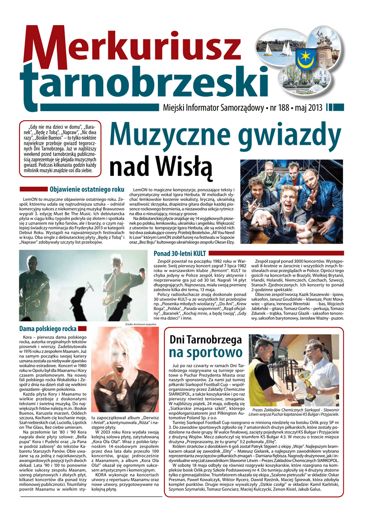 erkuriusz m t arnobrzeski Miejski Informator Samorządowy • nr 188 • maj 2013 „Gdy nie ma dzieci w domu”, „Baranek”, ,,Będę z Tobą”, ,,Napraw”, „Nic dwa razy”, „Boskie Buenos” – to tylko niektóre największe przeboje gwiazd tegorocznych Dni Tarnobrzega. Już w najbliższy weekend przed tarnobrzeską publicznością zaprezentuje się plejada muzycznych gwiazd. Podczas kilkunastu godzin każdy miłośnik muzyki znajdzie coś dla siebie. Muzyczne gwiazdy nad Wisłą Objawienie ostatniego roku LemON to muzyczne objawienie ostatniego roku. Zespół, któremu udała się najtrudniejsza sztuka – odniósł komercyjny sukces z niekomercyjną muzyką! Brawurowo wygrali 3. edycję Must Be The Music. Ich debiutancka płyta w ciągu kilku tygodni pokryła się złotem i spotkała się z uznaniem nie tylko fanów, ale i branży, o czym najlepiej świadczy nominacja do Fryderyka 2013 w kategorii Debiut Roku. Wystąpili na najważniejszych festiwalach w kraju. Oba single z debiutanckiej płyty ,,Będę z Tobą” i ,,Napraw” zdobywały szczyty list przebojów. LemON to magiczne kompozycje, poruszające teksty i charyzmatyczny wokal Igora Herbuta. W melodiach słychać łemkowskie korzenie wokalisty, liryczną, ukraińską wrażliwość skrzypka, drapieżna gitara dodaje każdej piosence rockowego brzmienia, a niezawodna sekcja rytmiczna dba o nieustający, niosący groove. Na debiutanckiej płycie znajduje się 14 wyjątkowych piosenek po polsku, łemkowsku, ukraińsku i angielsku. Większość z utworów to kompozycje Igora Herbuta, ale są wśród nich też dwa zaskakujące covery. Przebój Beatelsów ,,All You Need Is Love” którym LemON zrobił furorę na festiwalu w Sopocie oraz ,,Bez Boju” kultowego ukraińskiego zespołu Okean Elzy. Ponad 30-letni KULT Zespół powstał na początku 1982 roku w Warszawie. Swój pierwszy koncert zagrał 7 lipca 1982 roku w warszawskim klubie „Remont”. KULT to chyba jedyny w Polsce zespół, który aktywnie i nieprzerwanie gra już od 30 lat. Nagrali 14 płyt długogrających. Najnowsza, miała swoją premierę zaledwie kilka dni temu, 13 maja. Polscy radiosłuchacze znają doskonale ponad 30 utworów KULT-u ze wszystkich list przebojów np. „Piosenka młodych wioślarzy”, „Do Ani”, „Krew Boga”, „Polska”, „Parada wspomnień”, „Rząd oficjalny”, „Baranek”, „Kochaj mnie, a będę twoją”, „Gdy nie ma dzieci” i inne. Dama polskiego rocka Kora – pierwsza dama polskiego rocka, autorka oryginalnych tekstów piosenek i wierszy. Zadebiutowała w 1976 roku z zespołem Maanam. Już na samym początku swojej kariery uznana została za niebywałe zjawisko wokalno-estradowe. Koncert w 1980 roku w Opolu był dla Maanamu i Kory czasem przełomowym. Na nowej fali polskiego rocka Wokalistka i Zespół z dnia na dzień stali się wielkimi gwiazdami- głosem pokolenia. Każda płyta Kory i Maanamu to wielkie przeboje z doskonałymi tekstami i świetną muzyką. Do największych hitów należą m.in.: Boskie Buenos, Karuzela marzeń, Oddech szczura, Kocham cię kochanie moje, Szał niebieskich ciał, Luciolla, Lipstick on The Glass, Bez ciebie umieram. Na przełomie lat ’80 i ’90 Kora nagrała dwie płyty solowe: „Bella pupa” Kora i Pudelsi oraz „Ja Pana w podróż zabiorę” do tekstów Kabaretu Starszych Panów. Obie uważane są za jedną z najciekawszych, awangardowych pozycji tych dwóch dekad. Lata ’90 i ’00 to ponownie wielkie sukcesy zespołu Maanam, szereg platynowych i złotych płyt, kilkaset koncertów dla ponad trzy milionowej publiczności. Triumfalny powrót Maanamu w wielkim sty- Zespół zagrał ponad 3000 koncertów. Występowali 8-krotnie w Jarocinie i wszystkich innych festiwalach oraz przeglądach w Polsce. Oprócz tego gościli na koncertach w Brazylii, Wielkiej Brytanii, Irlandii, Holandii, Niemczech, Czechach, Szwecji, Stanach Zjednoczonych. Ich koncerty to ponad 2-godzinne spektakle. Obecnie zespół tworzą: Kazik Staszewski - śpiew, saksofon, Janusz Grudziński – klawisze, Piotr Morawiec – gitara, Ireneusz Wereński - bas, Wojciech Jabłoński – gitara, Tomasz Goehs – perkusja, Tomasz Zdunek – trąbka, Tomasz Glazik - saksofon tenorowy, saksofon barytonowy, Jarosław Ważny - puzon. Źródło: Archiwum zespołów Dni Tarnobrzega na sportowo lu zapoczątkował album „Derwisz i Anioł”, a kontynuowała „Róża” i następne płyty. W 2003 roku Kora wydała swoją kolejną solowa płytę, zatytułowaną „Kora Ola Ola!”. Wraz z polsko-latynoskim 14-osobowym zespołem przez dwa lata dała przeszło 100 koncertów, grając jednocześnie z Maanamem, a album „Kora Ola Ola!” okazał się ogromnym sukcesem artystycznym i komercyjnym. KORA wykonuje na koncertach utwory z repertuaru Maanamu oraz nowe utwory, przygotowywane na kolejną płytę. Już po raz czwarty w ramach Dni Tarnobrzega rozgrywane są turnieje sportowe o Puchar Prezydenta Miasta oraz naszych sponsorów. Za nami już turniej piłkarski Siarkopol Football Cup – współorganizowany przez Zakłady Chemiczne SIARKOPOL, a także koszykarskie i po raz pierwszy również tenisowe, zmagania. W najbliższy piątek, 24 maja, odbędą się „Siatkarskie zmagania szkół”, którego Prezes Zakładów Chemicznych Siarkopol - Sławomir współorganizatorem jest Pilkington Au- Litwin wręcza Puchar kapitanowi KS Bułgar i Przyjaciele. tomotive Poland Sp. z o.o. Turniej Siarkopol Football Cup rozegrano w minioną niedzielę na boisku Orlik przy SP nr 3. Do zawodów sportowych zgłosiło się 7 amatorskich drużyn piłkarskich, które zostały podzielone na dwie grupy. W walce finałowej, zacięty pojedynek stoczył KS Bułgar i Przyjaciele z drużyną Wojów. Mecz zakończył się triumfem KS Bułgar 4:3. W meczu o trzecie miejsce drużyna „Przepraszamy, że tu gramy” 3:2 pokonała „Elitę”. Królem strzelców z dorobkiem 6 goli został Patryk Stępień z ekipy „Woje”. Najlepszym bram