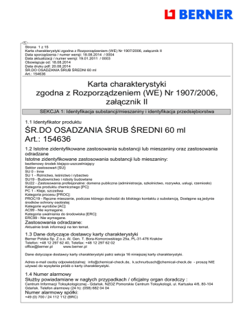 Strona 1 z 15 Karta charakterystyki zgodna z Rozporządzeniem (WE) Nr 1907/2006, załącznik II Data sporządzenia / numer wersji: 18.08.2014 / 0004 Data aktualizacji / numer wersji: 19.01.2011 / 0003 Obowiązuje od: 18.08.2014 Data druku pdf: 20.08.2014 ŚR.DO OSADZANIA ŚRUB ŚREDNI 60 ml Art.: 154636 Karta charakterystyki zgodna z Rozporządzeniem (WE) Nr 1907/2006, załącznik II SEKCJA 1: Identyfikacja substancji/mieszaniny i identyfikacja przedsiębiorstwa 1.1 Identyfikator produktu ŚR.DO OSADZANIA ŚRUB ŚREDNI 60 ml Art.: 154636 1.2 Istotne zidentyfikowane zastosowania substancji lub mieszaniny oraz zastosowania odradzane Istotne zidentyfikowane zastosowania substancji lub mieszaniny: beztlenowy środek klejąco-uszczelniający Sektor zastosowań [SU]: SU 0 - Inne SU 1 - Rolnictwo, leśnictwo i rybactwo SU19 - Budownictwo i roboty budowlane SU22 - Zastosowania profesjonalne: domena publiczna (administracja, szkolnictwo, rozrywka, usługi, rzemiosło) Kategoria produktu chemicznego [PC]: PC 1 - Kleje, szczeliwa Kategoria procesu [PROC]: PROC19 - Ręczne mieszanie, podczas którego dochodzi do bliskiego kontaktu z substancją. Dostępne są jedynie środków ochrony osobistej Kategorie wyrobów [AC]: AC99 - Nie wymagane. Kategoria uwalniania do środowiska [ERC]: ERC99 - Nie wymagane. Zastosowania odradzane: Aktualnie brak informacji na ten temat. 1.3 Dane dotyczące dostawcy karty charakterystyki Berner Polska Sp. Z o.o. Al. Gen. T. Bora-Komorowskiego 25a, PL-31-476 Kraków Telefon: +48 12 297 62 40, Telefax: +48 12 297 62 02 [email protected] www.berner.pl Dane dotyczące dostawcy karty charakterystyki patrz sekcja 16 niniejszej karty charakterystyki. Adres e-mail osoby odpowiedzialnej: [email protected], [email protected] - proszę NIE używać do wysyłania próśb o karty charakterystyki. 1.4 Numer alarmowy Służby powiadamiane w nagłych przypadkach / oficjalny organ doradczy : Centrum Informacji Toksykologicznej - Gdańsk. NZOZ Pomorskie Centrum Toksykologii, ul. Kartuska 4/6, 80-104 Gdańsk. Telefon alarmowy (24 h): (058) 682 04 04 Numer alarmowy spółki: +49 (0) 700 / 24 112 112 (BRC) Strona 2 z 15 Karta charakterystyki zgodna z Rozporządzeniem (WE) Nr 1907/2006, załącznik II Data sporządzenia / numer wersji: 18.08.2014 / 0004 Data aktualizacji / numer wersji: 19.01.2011 / 0003 Obowiązuje od: 18.08.2014 Data druku pdf: 20.08.2014 ŚR.DO OSADZANIA ŚRUB ŚREDNI 60 ml Art.: 154636 SEKCJA 2: Identyfikacja zagrożeń 2.1 Klasyfikacja substancji lub mieszaniny 2.1.1 Klasyfikacja zgodnie z rozporządzeniem (WE) Nr 1272/2008 (CLP) Zgodnie z rozporządzeniem (WE) Nr 1272/2008 (CLP) mieszanina nie została sklasyfikowana jako niebezpieczna. 2.1.2 Klasyfikacja zgodnie z dyrektywami 67/548/EWG oraz 1999/45/WE (łącznie ze zmianami) Zgodnie z dyrektywą 1999/45/WE mieszanina nie została sklasyfikowana jako niebezpieczna. 2.2 Elementy oznakowania 2.2.1 Oznakowanie zgodnie z rozporządzeniem (WE) Nr 1272/2008 (CLP) Nie dotyczy 2.3 Inne zagrożenia Mieszanina nie zawiera substancji vPvB (vPvB = very persistent, very bioaccumulative) bądź nie jest wykazana w załączniku XIII rozporządzenia (WE) 1907/2006. Mieszanina nie zawiera substancji PBT (PBT = persistent, bioaccumulative, toxic) bądź nie jest wykazana w załączniku XIII rozporządzenia (WE) 1907/2006. SEKCJA 3: Skład/informacja o składnikach 3.1 Substancja n.s. 3.2 Mieszanina -Numer rejestracji (REACH) Index EINECS, ELINCS, NLP CAS Stęż.% Klasyfikacja zgodnie z dyrektywą 67/548/EWG Klasyfikacja zgodnie z rozporządzeniem (WE) Nr 1272/2008 (CLP) ------ SEKCJA 4: Środki pierwszej pomocy 4.1 Opis środków pierwszej pomocy Drogi oddechowe Osobę usunąć z zagrożonej strefy. Osobie zapewnić dopływ świeżego powietrza, w zależności od objawów skonsultować się z lekarzem. Kontakt ze skórą Zanieczyszczone, nasączone ubranie należy niezwłocznie zdjąć, dokładnie wyprać w wodzie z mydłem, w razie podrażnienia skóry (zaczerwienienie itd.), zasięgnać porady lekarskiej. Kontakt z oczami Usunąć szkła kontaktowe. Przez kilka minut dokładnie spłukać dużą ilością wody, jeżeli potrzeba, udać się do lekarza. Strona 3 z 15 Karta charakterystyki zgodna z Rozporządzeniem (WE) Nr 1907/2006, załącznik II Data sporządzenia / numer wersji: 18.08.2014 / 0004 Data aktualizacji / numer wersji: 19.01.2011 / 0003 Obowiązuje od: 18.08.2014 Data druku pdf: 20.08.2014 ŚR.DO OSADZANIA ŚRUB ŚREDNI 60 ml Art.: 154636 Drogi pokarmowe Jamę ustną dokładnie przepłukać wodą. Podać dużą ilość wody do picia, natychmiast udać się do lekarza. 4.2 Najważniejsze ostre i opóźnione objawy oraz skutki narażenia Jeśli dotyczy, objawy występujące z opóźnieniem i działanie podane są w punkcie 11. lub wśród dróg wchłaniania w punkcie 4.1. W określonych przypadkach objawy zatrucia mogą pojawić się dopiero po dłuższym czasie/po kilku godzinach. 4.3 Wskazania dotyczące wszelkiej natychmiastowej pomocy lekarskiej i szczególnego postępowania z poszkodowanym n.b. SEKCJA 5: Postępowanie w przypadku pożaru 5.1 Środki gaśnicze Odpowiednie środki gaśnicze Strumień wody/piana/CO2/suchy środek gaśniczy Niewłaściwe środki gaśnicze Pełny strumień wody 5.2 Szczególne zagrożenia związane z substancją lub mieszaniną W przypadku pożaru mogą powstać: Tlenki węgla Gazy trujące. 5.3 Informacje dla straży pożarnej Nie wdychać dymów powstających w wyniku pożaru lub wybuchu. Sprzęt ochrony dróg oddechowych niezależny od powietrza otoczenia. W razie potrzeby - pełna ochrona. Zagrożone pojemniki chłodzić wodą. Skażoną wodę gaśniczą zneutralizować zgodnie z przepisami administracyjnymi SEKCJA 6: Postępowanie w przypadku niezamierzonego uwolnienia do środowiska 6.1 Indywidualne środki ostrożności, wyposażenie ochronne i procedury w sytuacjach awaryjnych Dbać o wystarczającą wentylację nawiewną. Unikać kontaktu z oczami i skórą. W danym przypadku mieć n