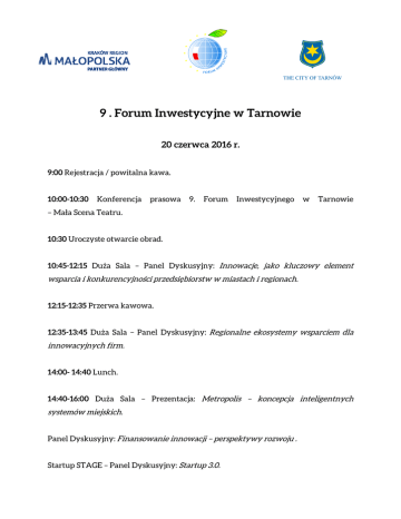 9 . Forum Inwestycyjne w Tarnowie 20 czerwca 2016 r. 9:00 Rejestracja / powitalna kawa. 10:00-10:30 Konferencja prasowa 9. Forum Inwestycyjnego w Tarnowie – Mała Scena Teatru. 10:30 Uroczyste otwarcie obrad. 10:45-12:15 Duża Sala – Panel Dyskusyjny: Innowacje, jako kluczowy element wsparcia i konkurencyjności przedsiębiorstw w miastach i regionach. 12:15-12:35 Przerwa kawowa. 12:35-13:45 Duża Sala – Panel Dyskusyjny: Regionalne ekosystemy wsparciem dla innowacyjnych firm. 14:00- 14:40 Lunch. 14:40-16:00 Duża Sala – Prezentacja: Metropolis – koncepcja inteligentnych systemów miejskich. Panel Dyskusyjny: Finansowanie innowacji – perspektywy rozwoju . Startup STAGE – Panel Dyskusyjny: Startup 3.0. 16:00-16:20 Przerwa kawowa 16:20-17:40 Duża Sala – Prezentacja: Kapitał ludzki: Sukces poprzez ludzi . Panel Dyskusyjny: Kapitał ludzki: Sukces poprzez ludzi . 16:20-18:00 Startup STAGE - Start-up’s Prezentacje. 18:00- 18:10 Przerwa kawowa. 18:10-19:20 Duża Sala – Panel Dyskusyjny: Innowacje w służbie branży energetycznej. Startup STAGE - Panel Dyskusyjny: Get inspired – historie sukcesu . 19:30 Gala rozdania nagród: START UP Award oraz Inwestor i Inwestycje Roku 2016. 21 czerwca 2016 r. od 9:00 Powitalna kawa. 9:20-10:30 Duża Sala - Panel Dyskusyjny: Nauka- Technologia – Biznes. Startup STAGE: Powrót do przeszłości. Jak polski biznes może skorzystać z tych możliwości dla rozwoju i zwiększania konkurencyjności, które miał 20 lat temu ? Startup STAGE: Możliwości biznesowe i inwestycyjne w Malezji. Startup STAGE: Inwestycje w sektor turystyczny w Meksyku. Startup STAGE: Biznes w Europie i dla Europy: perspektywa Ukrainy. Startup STAGE: Środowisko start-upowe na Łotwie. 10:30-10:45 Przerwa kawowa. 10:45-12:00 Duża Sala – Prezentacja: Opieka zdrowotna a Smart City. Panel Dyskusyjny: Kompleksowa informatyzacja ochrony zdrowia. Startup STAGE – Panel Dyskusyjny: Time to market, czyli jak akcelerować startupy w stronę inwestycji i rynkowego debiutu? Startup STAGE – Prezentacja: Dobry marketing nie sprzedaje a pozwala kupować – czyli jak wodzić klienta za nos? 12:00-12:15 Przerwa kawowa. 12:15-13:30 Duża Sala: Panel Dyskusyjny : Rynek cyfrowy – jak wykorzystać jego potencjał? Prezentacja: Inwestycje w nowoczesne narzędzia cyfrowe i nowe modele biznesowe w dążeniu do satysfakcji klientów sieci handlowych. Startup STAGE – Warsztaty: Get Inspired. Skuteczny wizerunek online w 5 krokach. StartupMistakes, Jak założyć odnoszący sukcesy. Startup unikając powszechnych pomyłek (w języku angielskim). Jak „zaprojektować” biznes z sukcesem. Hacathon. Innovator Małopolski. 13:30-14:00 Lunch. 14:00-15:10 Duża Sala: Panel Dyskusyjny: Nowe trendy w dobie digitalizacji – loT Big Data, Mobile. Startup STAGE Panel Dyskusyjny: Wartość i ocena potencjału technologii/ start-upu z perspektywy inwestora . 15:10-15:20 Przerwa kawowa. 15:20-16:20 Duża Sala: Prezentacja: Design Thinking: wykorzystanie technik 3D w myśleniu projektowym. Panel Dyskusyjny: Innowacje w technologiach medycznych. Startup STAGE Prezentacja: Virtual Reality – przełom technologiczny! Prezentacja: Jak bezpieczna jest nasza organizacja? Skuteczna analiza i predykcja zagrożeń za pomocą IBM QRadar SIEM. Dyskusja: Cyberbezpieczeństwo – zagrożenia dostępu danych. 16:30 Gala Robot Show.