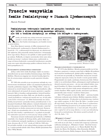strona 54 Zeszyty Komiksowe Marzec 2005 Przeciw wszystkim Komiks feministyczny w Stanach Zjednoczonych M arcin Puźn iak Feministyczne twórczynie komiksów od początku borykały się nie tylko z niezrozumieniem masowego odbiorcy, ale też z brakiem akceptacji ze stwony ich kolegów z undergroundu. K om ik s, jak k ażdy inny rodzajtw órczości artystyczne j, posiada w sw oim ob ręb ie w ie l e nurtów . Mało znanym , ch oćb ardzo inte re sującym , je st k om ik s tw orzony prze z k ob ie ty. K ara Maia Spe nce r zauw aża, że k il k a rom ansow ych tytułów k om ik sow ych , w ydaw anych w Stanach Z je dnoczonych w l atach 60. i 70., a adre sow anych do dzie w cząt, nie odzw ie rcie dl ało w pływ ów , jak ie przyniosły zm iany k ul turow e i św iatopogl ądow e te go ok re su. Pozycje te nie spe łniły w żade n sposób sw oje go zadania. Podk re śl a, że dopie ro rysow niczk i, k tóre sam e zde cydow ały się tw orzyć i w ydaw aćw łasne prace , zaofe row ały to, cze go od daw na b rak ow ało w prze m yśl e k om ik sow ym : praw dziw e go oraz często zde cydow ane go punk tu w idze nia św iata z k ob ie ce jpe rspe k tyw y (1). FU ND AMENTY K O MIK SO WEGO FEMINIZ MU Je dną z osób , k tóre m iały de cydujący w pływ na rozw óji uk ształtow anie się nurtu k om ik su fe m inistyczne go, b yła Trina R ob b ins. H istoria je josiągnięćje st rów nie ż k ronik ą dąże ń k ob ie t do artystyczne go zaistnie nia na pol u opow ie ści ob razk ow ych . W 19 66 rok u artystk a ta po raz pie rw szy ze tk nęła się z w ydaw nictw am i nie zal e żnym i. Je de n z je jznajom ych pok azałje jnow ojorsk i, podzie m ny m agazyn „East Vil l age O th e r”, k tóry zam ie szczałna sw oich łam ach tak że now y rodzajk om ik sów , całk ow icie odm ie nnych od znanych do te jpory opow ie ści o supe rb oh ate rach . Były to k om ik sy unde rgroundow e , k tórych b urzl iw y rozw ójprzypadłna te n ok re s. Były one , jak ok re śl a je artystk a, „b ard zo psych od eliczn e i n iek on ieczn ie m usiały m iećsen s, ale b yły jed n ocześn ie b ard zo zróżn icow an e” (2). Sil nie k onte stow ały one am e ryk ańsk ą rze czyw istośći poruszały te m aty, prze m il czyw ane w tradycyjnych k om ik sach . Były je dnym z w ażnych e l e m e ntów re w ol ucji ob yczajow e ji se k sual ne jk ońca l at 60. K ontak t z nim i b ył drogow sk aze m na drodze artystyczne jte jtw órczyni. Z aznacza ona: „D zięk i n im uśw iad om iłam sob ie co ch cęrob ić. Prób ow ałam w cześn iej rob ićtak że k om ik sy o superb oh aterach , co sięjed n ak n ie pow iod ło. N ie n ad aw ałam siępo prostu n a tw órczyn iętego rod zaju tytułów.” (3) Fascynacja now ym i te nde ncjam i spow odow ała, że R ob b ins w yje ch ała z Los Ange l e s do Now e go Jork u, gdzie dzięk i przyjaźni z re dak tore m naw iązała w spółpracę ze w spom nianym już pism e m . Je jpraca dl a „E. V . O .” trw ała od 19 66 do 19 68 rok u. Na początk u m yśl ała, że je st je dyną k ob ie tą rysującą tam k om ik sy, z czase m poznała je dnak tak że Nancy K al ish (pse udonim Panzik a)i W il l y Me nde s. O k ładk a „It Ain’t Me Bab e ” i pie rw sze go num e ru „W im m e n’s Com ix” Z MASK U LINIZ O WANY UN D ER GR OUN D W 19 70 rok u R ob b ins i Me nde s prze prow adziły się do San Fransisco, ponie w aż w tam tym czasie b yła to Me k k a dl a podzie m nych artystów k om ik sow ych . Je dnak prób y w spółpracy z innym i tw órcam i nie pow iodły się. Środow isk o artystyczne tw orzyl i w yłącznie m ężczyźni, k tórzy nie ch cie l i w sw oim gronie k ob ie t. Przypom inało ono m ęsk i, zam k nięty, h e rm e tyczny k l ub . D ob rze w idać to na arch iw al nym fil m ie , pok azującym ze spółunde rgroundow ych artystów przy pracy – nie m a tam żadnych k ob ie t, rysujących k om ik sy (4). O pory rysow nik ów w yjaśnia po części fak t, że b ardzo często ich prace m iały jaw nie m izoginistyczny i se k sistow sk i ch arak te r. Pe łne zapału artystk i, nie zrażone tym fak te m , postanow iły sam e tw orzyć i w ydaw aćw łasne prace . R ok 19 70 przyniósł„It Ain’t Me , Bab e ” – pie rw szy k om ik s w yk onany w yłącznie prze z k ob ie ty. R ob b ins w spom ina ok ol iczności je go pow stania: „Przyłączyłam sięd o fem in istyczn ego i pod ziem n ego zespołu czasopism a »It Ain ’t Ab out M e, Bab e«i zaczęłam rysow ać d la n iego k om ik s. D oszły m n ie słuch y, że R on Turn er [z w yd aw n ictw a Last Gasp Pub lish in g]przym ierzał sięd o w yd an ia k om ik su o w yzw olen iu k ob iet, w ięc pow ied ziałam m u, że m am tak i jed en . Przyszed ł d o m n ie i w ypisał m i czek n a tysiąc d olarów, co w tym czasie b yło pok aźn ą k w otą jak n a tytuł pod ziem n y. Tak w łaśn ie n arod ził sięk om ik s »It Ain ’t M e, Bab e«.” (5) „W IMMEN ’S CO MIX ” W 19 72 rok u zainte re sow anie k om ik se m w śród rysow nicze k stało się na tyl e duże , że m ożna b yło rozpocząć w ydaw anie cyk l iczne jantol ogii pt. „W im m e n’s Com ix”. Tytułb yłtw orzony prze z duże grono artyste k , m . in. Sh aron R udah l , Te rry R ich ards, Le e Marrs, Pat Moodian, Al ine K om insk y, Mich e l l e Brand, Lorę Fountain, Sh e l b y Sam pson, K are n Marie H ask e l l , Marzec 2005 Zeszyty Komiksowe Jane t W ol fe Stanl e y i oczyw iście Trinę R ob b ins. Sposób pracy nad k ol e jnym i num e ram i przypom inałw spól ne działania m ęsk ich rysow nik ów . Te rry R ich ards w spom ina: „Z d ecyd ow ałyśm y, że b ęd ziem y tw orzyćcyk liczn y, k ob iecy tytuł i że b ęd ziem y pracow aćw sposób k olek tyw n y, k tóry to term in b ył w tych d n iach używ an y w sposób luźn y, a ozn aczał, że n ie b ęd zie lid era an i red ak tora n aczeln ego. Z am iast tego b ęd zie zm ien iający sięsk ład n ad zorujący, n atom i