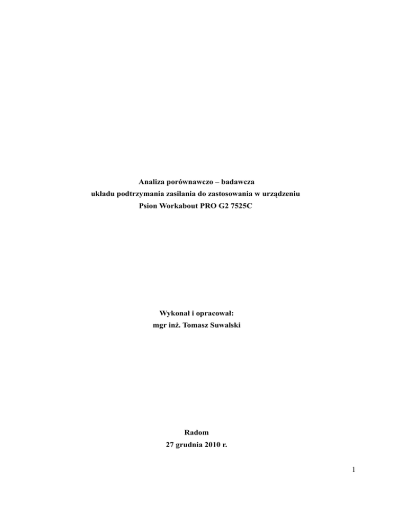 Analiza porównawczo – badawcza układu podtrzymania zasilania do zastosowania w urządzeniu Psion Workabout PRO G2 7525C Wykonał i opracował: mgr inż. Tomasz Suwalski Radom 27 grudnia 2010 r. 1 1 1.1 Porównanie układów podtrzymujących napięcie (oryginalny a zastępczy) Wnioski wynikające z analizy przeprowadzonych badań Po przeprowadzeniu oględzin i testów stwierdzam, że obydwa zastosowane akumulatory są o tych samych lub nieznacznie różniących się parametrach. W oferowanym układzie zastępczym zastosowany jest oryginalny i wysokiej klasy akumulator firmy GP1. Parametry elektryczne w cyklu ładowania i rozładowania dla obu typu układów są praktycznie identyczne i mieszczą się z dużym zapasem jeśli chodzi o graniczne parametry dotyczące eksploatacji akumulatora GP 1022L15. Jedynym ograniczeniem jest ciągłe użytkowanie tego akumulatora w temperaturze znacznie niższej niż minus 20 °C. Parametry mechaniczne również nie różnią się znacznie. Można stwierdzić że są takie same, tak jak wtyk i przewody zasilające. Wobec powyższego mogę stwierdzić, że zastosowanie akumulatora zastępczego produkcji firmy GP jest trafną decyzją. Duża liczba cykli ładowania zapewnia większą trwałość, dłuższy czas między wymianami a w konsekwencji niższe koszty eksploatacji przy zachowaniu najwyższej jakości jakiej gwarantem jest produkt firmy GP. .......................................... mgr inż. Tomasz Suwalski 1 Jako renomowany producent i potentat na rynku GP gwarantuje swoją marką produkty o najwyższej jakości. 2 2 Charakterystyka układu podtrzymującego napięcie (Oryginalnego) 2.1 Informację o zastosowanym akumulatorze: W badanym układzie podtrzymującym napięcie zastosowano ładowalny cylindryczny akumulator litowo-jonowy 1022L15K. Akumulator nie posiada oznaczeń pozwalających identyfikacje producenta a tym samym jego jakości. 2.2 Charakterystyki ładowania i rozładowywania testowanego akumulatora: Ładowanie 60 prąd [mA] 50 40 30 20 10 0 0 10 20 30 40 55 65 70 85 100 112 112 120 130 135 140 145 155 167 180 205 280 czas [s] a) Ładowanie: Ładowanie 4,4 napięcie [V] 4,2 4 3,8 3,6 3,4 3,2 0 10 20 30 40 55 65 70 85 100 112 112 120 130 135 140 145 155 167 180 205 280 czas [s] b) Rozładowanie Rozładowanie 4 3,5 napięcie [V] 3 2,5 2 1,5 1 0,5 0 0 2 4 5 6 7 8 10 12 14 16 20 23 26 28 29 30 31 32 32,5 czas [min] 3 3 Charakterystyka układu podtrzymującego napięcie (Zastępczego) Informację o zastosowanym akumulatorze: 3.1 W badanym układzie podtrzymującym napięcie zastosowano ładowalny cylindryczny akumulator litowo-jonowy GP 1022L15 o następujących danych znamionowych2: • • • • • • • • • napięcie: 3,7V pojemność: od 140 do 155 mAh rekomendowany prąd rozładowujący: od 31 do 310 mA ilość cykli ładowania (spadek pojemności do 70%): 500 cykli średnica: 10,2 mm długość: 21,6 mm waga: 4,2 g temperatura ładowania: od 0 °C do 45 °C temperatura rozładowania: od -20 °C do 60°C Jest to oryginalny akumulator firmy GP3! 3.2 Charakterystyki zastosowanego akumulatora4 na podstawie danych producenta: c) Ładowanie: 2 Szczegółowe dane do pobrania ze strony producenta GP, http://www.gpbatteries.it/SelfSiteInfo.asp?loc=none&idSez=7&idPag=19 3 Dzięki najnowocześniejszej technologii produkcji, aktywnej działalności oraz prowadzonym badaniom, GP Batteries należy do ścisłej czołówki firm bateryjnych na świecie. Jako członek holdingu Gold Peak Group dostarcza bogaty asortyment baterii i akumulatorów producentom wyrobów elektronicznych oraz innym wiodącym firmom bateryjnym. Na rynku konsumenckim produkty GP sprzedawane są pod własną marką. 4 Według producenta: http://www.gpbattery.pl/index.php?iid=439 4 d) Rozładowanie w zależności od wartości prądu rozładowującego: e) Rozładowanie w zależności od temperatury pracy akumulatora: 5 3.3 Charakterystyki ładowania i rozładowywania testowanego akumulatora: W wyniku przeprowadzonych 20 cykli ładowania i rozładowania uzyskano charakterystyki dla badanego akumulatora: a) Ładowanie: Ładowanie 60 prąd [mA] 50 40 30 20 10 0 0 10 20 30 40 55 65 70 85 100 112 112 120 130 135 140 145 155 167 180 205 280 czas [s] Ładowanie 4,4 napięcie [V] 4,2 4 3,8 3,6 3,4 3,2 0 10 20 30 40 55 65 70 85 100 112 112 120 130 135 140 145 155 167 180 205 280 czas [s] b) Rozładowanie Rozładowanie 4 3,5 napięcie [V] 3 2,5 2 1,5 1 0,5 0 0 2 4 5 6 7 8 10 12 14 16 20 23 26 28 29 30 31 czas [min] 6 4 4.1 Załącznik Nota katalogowa producenta akumulatora zastępczego GP1022L15 7 5 Spis treści 1 Porównanie układów podtrzymujących napięcie (oryginalny a zastępczy)......................................2 1.1 Wnioski wynikające z analizy przeprowadzonych badań.....................................................2 2 Charakterystyka układu podtrzymującego napięcie (Oryginalnego)................................................3 2.1 Informację o zastosowanym akumulatorze: .........................................................................3 2.2 Charakterystyki ładowania i rozładowywania testowanego akumulatora:...........................3 3 Charakterystyka układu podtrzymującego napięcie (Zastępczego)..................................................4 3.1 Informację o zastosowanym akumulatorze: .........................................................................4 3.2 Charakterystyki zastosowanego akumulatora na podstawie danych producenta:.................4 3.3 Charakterystyki ładowania i rozładowywania testowanego akumulatora:...........................6 4 Załącznik...........................................................................................................................................7 4.1 Nota katalogowa producenta akumulatora zastępczego GP1022L15...................................7 5 Spis treści.......................................................................................................................
