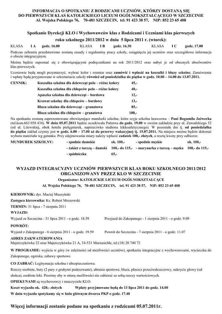 INFORMACJA O SPOTKANIU Z RODZICAMI UCZNIÓW, KTÓRZY DOSTANĄ SIĘ DO PIERWSZYCH KLAS KATOLICKIEGO LICEUM OGÓLNOKSZTAŁCĄCEGO W SZCZECINIE Al. Wojska Polskiego 76, 70-481 SZCZECIN, tel. 91 423 38 57, NIP: 852 23 65 408 Spotkanie Dyrekcji KLO i Wychowawców klas z Rodzicami i Uczniami klas pierwszych roku szkolnego 2011/2012 w dniu 5 lipca 2011 r. (wtorek): KLASA IA godz. 16.00 KLASA IB godz. 16.30 KLASA IC godz. 17.00 Podczas zebrania przedstawione zostaną zasady i regulaminy pracy szkoły, osiągnięcia jej uczniów oraz szczegółowa informacja o obozie integracyjnym. Można będzie zapoznać się z obowiązującymi podręcznikami na rok 2011/2012 oraz nabyć je od obecnych absolwentów klas pierwszych. Uczniowie będą mogli przymierzyć, wybrać kolor i rozmiar oraz zamówić i wpłacić na koszulki i bluzy szkolne. Zamówienia i wpłaty będą przyjmowane w sekretariacie szkoły również od poniedziałku do piątku w godz. 10.00 – 14.00 do 13.07.2011. CENNIK: Koszulka szkolna dla dziewcząt polo – różne kolory 45,- Koszulka szkolna dla chłopców polo – różne kolory 40,- Apaszka szkolna dla dziewcząt – bordowa 12,- Krawat szkolny dla chłopców – bordowy 13,- Bluza szkolna dla dziewcząt – granatowa 85,- Bluza szkolna dla chłopców – granatowa 100,- Na spotkaniu zostaną zaprezentowane obowiązujące mundurki szkolne, które szyje szkolna krawcowa – Pani Bogumiła Jaźwecka (tel.kom.663 058 434). W dniu 05.07.2011 będzie oczekiwała Państwa do godz. 19.00 w swoim zakładzie przy ul. Zawadzkiego 52 (od ul. Litewskiej, obok hotelu pielęgniarek, naprzeciwko stadionu lekkoatletycznego). W pozostałe dni tj. od poniedziałku do piątku zakład czynny jest w godz. 6.00 – 17.00 aż do przerwy wakacyjnej tj. 15.07.2011. Na miejscu można będzie dokonać wyboru materiału wg gatunku. Przy zdejmowaniu miary należy wpłacić zadatek 100,- złotych, a resztę kwoty przy odbiorze. MUNDUREK SZKOLNY: - spodnie damskie ok. 100,- - spodnie męskie - żakiet z tarczą – damski 100,- do 115,- - marynarka z tarczą – męska - spódniczka 65,- ok. 100,100,- do 115,- WYJAZD INTEGRACYJNY UCZNIÓW PIERWSZYCH KLAS ROKU SZKOLNEGO 2011/2012 ORGANIZOWANY PRZEZ KLO W SZCZECINIE Organizator: KATOLICKIE LICEUM OGÓLNOKSZTAŁCĄCE Al. Wojska Polskiego 76, 70-481 SZCZECIN, tel. 91 423 38 57, NIP: 852 23 65 408 KIEROWNIK: dyr. Maciej Muszyński Zastępca kierownika: Ks. Robert Mrozowski TERMIN: 31 lipca - 7 sierpnia 2011 WYJAZD: Wyjazd ze Szczecina - 31 lipca 2011 - o godz. 18.59 Przyjazd do Zakopanego - 1 sierpnia 2011 - o godz. 9.09 POWRÓT: Wyjazd z Zakopanego - 6 sierpnia 2011 - o godz. 19.59 Powrót do Szczecina - 7 sierpnia 2011 - o godz. 11.07 ADRES ZAKWATEROWANIA Majerczykówka 22 oraz Majerczykówka 21 A, 34-531 Murzasichle, tel.(18) 20 740 72 W PROGRAMIE: wyjścia w góry (w zależności od możliwości uczniów), spotkania integracyjne z wychowawcami, wycieczka do Zakopanego, ogniska, zabawy sportowe. CO ZABRAĆ: Legitymacja szkolna i ubezpieczeniowa. Rzeczy osobiste, buty (2 pary z grubymi podeszwami), ubrania sportowe, bluza, płaszcz przeciwdeszczowy, nakrycie głowy (od słońca), osobiste leki. Prosimy aby w miarę możliwości nie zabierać ze sobą rzeczy wartościowych. OPIEKUNAMI są wychowawcy i nauczyciele KLO. Koszt wyjazdu ok. 420,- złotych Wpłaty przyjmowane będą do 13 lipca 2011 do godz. 14.00 W dniu wyjazdu spotykamy się w holu głównym dworca PKP o godz. 17.40 Więcej informacji zostanie podane na spotkaniu z rodzicami 05.07.2011r.