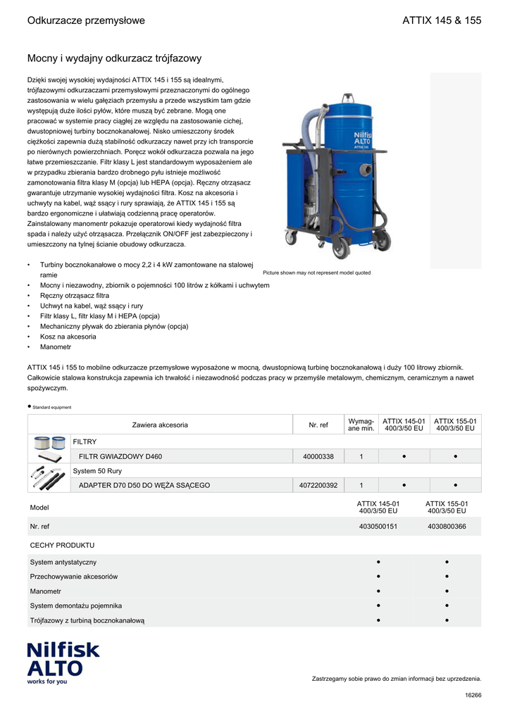 Odkurzacze przemysłowe ATTIX 145 & 155 Mocny i wydajny odkurzacz trójfazowy Dzięki swojej wysokiej wydajności ATTIX 145 i 155 są idealnymi, trójfazowymi odkurzaczami przemysłowymi przeznaczonymi do ogólnego zastosowania w wielu gałęziach przemysłu a przede wszystkim tam gdzie występują duże ilości pyłów, które muszą być zebrane. Mogą one pracować w systemie pracy ciągłej ze względu na zastosowanie cichej, dwustopniowej turbiny bocznokanałowej. Nisko umieszczony środek ciężkości zapewnia dużą stabilność odkurzaczy nawet przy ich transporcie po nierównych powierzchniach. Poręcz wokół odkurzacza pozwala na jego łatwe przemieszczanie. Filtr klasy L jest standardowym wyposażeniem ale w przypadku zbierania bardzo drobnego pyłu istnieje możliwość zamonotowania filtra klasy M (opcja) lub HEPA (opcja). Ręczny otrząsacz gwarantuje utrzymanie wysokiej wydajności filtra. Kosz na akcesoria i uchwyty na kabel, wąż ssący i rury sprawiają, że ATTIX 145 i 155 są bardzo ergonomiczne i ułatwiają codzienną pracę operatorów. Zainstalowany manomentr pokazuje operatorowi kiedy wydajność filtra spada i należy użyć otrząsacza. Przełącznik ON/OFF jest zabezpieczony i umieszczony na tylnej ścianie obudowy odkurzacza. • • • • • • • • Turbiny bocznokanałowe o mocy 2,2 i 4 kW zamontowane na stalowej Picture shown may not represent model quoted ramie Mocny i niezawodny, zbiornik o pojemności 100 litrów z kółkami i uchwytem Ręczny otrząsacz filtra Uchwyt na kabel, wąż ssący i rury Filtr klasy L, filtr klasy M i HEPA (opcja) Mechaniczny pływak do zbierania płynów (opcja) Kosz na akcesoria Manometr ATTIX 145 i 155 to mobilne odkurzacze przemysłowe wyposażone w mocną, dwustopniową turbinę bocznokanałową i duży 100 litrowy zbiornik. Całkowicie stalowa konstrukcja zapewnia ich trwałość i niezawodność podczas pracy w przemyśle metalowym, chemicznym, ceramicznym a nawet spożywczym. ● Standard equipment Zawiera akcesoria Nr. ref Wymag ane min. ATTIX 145-01 400/3/50 EU ATTIX 155-01 400/3/50 EU 40000338 1 ● ● 4072200392 1 ● ● FILTRY FILTR GWIAZDOWY D460 System 50 Rury ADAPTER D70 D50 DO WĘŻA SSĄCEGO Model ATTIX 145-01 400/3/50 EU ATTIX 155-01 400/3/50 EU Nr. ref 4030500151 4030800366 System antystatyczny ● ● Przechowywanie akcesoriów ● ● Manometr ● ● System demontażu pojemnika ● ● Trójfazowy z turbiną bocznokanałową ● ● CECHY PRODUKTU Zastrzegamy sobie prawo do zmian informacji bez uprzedzenia. 16266 Odkurzacze przemysłowe ATTIX 145 & 155 Mocny i wydajny odkurzacz trójfazowy Model ATTIX 145-01 400/3/50 EU ATTIX 155-01 400/3/50 EU Nr. ref 4030500151 4030800366 Rama na kółkach z hamulcami ● ● Filtr klasy L ● ● Wtyczka z zamiennikem faz ● ● ATTIX 145-01 400/3/50 EU ATTIX 155-01 400/3/50 EU 2200 4000 400/3/50/16 400/3/50/16 5250 8600 300/30 300/30 Poziom hałasu (dB(A)) 68 72 Przewód elektryczny (m) 9 9 100 100 Manual filter shaker Manual filter shaker PET Starfilter PET Starfilter 113 x 60 x 153 113 x 60 x 153 114 139 CECHY PRODUKTU Dane techniczne Energy Label Moc pmaks. (W) Moc piec (W) Zasilanie (V/~/Hz/A) Wielkość przepływ powietrza (l/min) Podciśnienie (mbar/kPA) Pojemność pojemnika (maks l.) System czyszczenia filtra Typ filtra głównego Długość x szerokość x wysokość (cm) Ciężar (kg) ● Standard equipment, ○ Supplementary accessories, □ Mountable equipment Nr. ref Wymag ane min. ATTIX 145-01 400/3/50 EU ATTIX 155-01 400/3/50 EU 4072200392 1 ● ● RURA ALUMINIOWA 1 m Ø50 15335 1 ○ ○ RURY Ø50 2X525MM PCV 5152 1 ○ ○ SSAWA ALUM Ø50MM/200MM 41100 1 ○ ○ SSAWA Ø50X175 PP 5153 1 ○ ○ SSAWA OKRĄGŁA SZCZOTKOWA Ø50 40458 1 ○ ○ ZESTAW DO WIÓRÓW Ø50MM 2 ELEMENTY 61681 1 ○ ○ ZESTAW PRZEMYSŁOWY Ø50MM 6 ELEM 63216 1 ○ ○ ZESTAW STANDARDOWY Ø50MM 3 ELEM 6085 1 ○ ○ Akcesoria System 50 Rury ADAPTER D70 D50 DO WĘŻA SSĄCEGO System 50 Szczotki uniwersalne ZESTAWY AKCESORIÓW DO ODKURZACZY Zastrzegamy sobie prawo do zmian informacji bez uprzedzenia. 16266 Odkurzacze przemysłowe ATTIX 145 & 155 Mocny i wydajny odkurzacz trójfazowy Nr. ref Wymag ane min. ATTIX 145-01 400/3/50 EU ATTIX 155-01 400/3/50 EU WĄŻ DO WIÓRÓW Ø50X4000 MM 15182 1 ○ ○ WĄŻ METALOWY Ø50X4000 MM 15013 1 ○ ○ WĄŻ ODPORNY NA TEMPERATURĘ D50X4000 11061 1 ○ ○ WĄŻ OLEJOODPORNY D50X4000 6468 1 ○ ○ WĄŻ SSĄCY 50X4000MM 15815 1 ○ ○ WĄŻ UNIWERSALNY D36X4000 MM 15358 1 ○ ○ WĄŻ UNIWERSALNY Ø50X1750 MM 19930 1 ○ ○ SSAWA STOŻKOWA GUMA Ø50MM 19936 1 ○ ○ SSAWA SZCZELINOWA Ø50X370 PE 7102 1 ○ ○ SSAWKA GUMOWA SKOŚNA Ø50 MM 7868 1 ○ ○ SSAWKA PŁASKA GUMOWA Ø50 MM 31244 1 ○ ○ SSAWA ALUM Ø50MM/500MM NA MOKRO 15344 1 ○ ○ SSAWA ALUM Ø50MM/500MM NA SUCHO 15343 1 ○ ○ 302002880 1 ○ ○ 18 KIESZENIOWY FILTR GWIAZDOWY KL M 40000699 1 ○ ○ FILTR GWIAZDOWY D460 40000338 1 ● ● 4056000523 1 ○ ○ KRATKA I ZAWÓR D460 Z5 60034 1 ○ ○ UCHWYT DO WĘŻA 40000856 1 ○ ○ 40000915 1 ○ ○ PŁYWAK MECHANICZNY S2B/S3B SS 4056000519 1 ○ ○ ZESTAW DO ROZŁADOWYWANIA MS2-S3-T30S 4056000468 1 ○ ○ 4084001017 1 ○ ○ Z5 60109 1 ○ ○ Akcesoria System 50 Wąż do odkurzacza System 50 Ssawa stożkowa System 50 Ssawa podłogowa SSAWA PODŁOGOWA FILTRY FILTR HEPA (AU) ZESPOŁY MONTAŻOWE INNE AKCESORIA KOSZ NA ŚCINKI D460 L100 WORKI FILTRUJĄCE PACKAGE OF 5 BAGS D460 LDPE OPCJE WKŁADKA CYKLONOWA D460 Zastrzegamy sobie prawo do zmian informacji bez uprzedzenia. 16266
