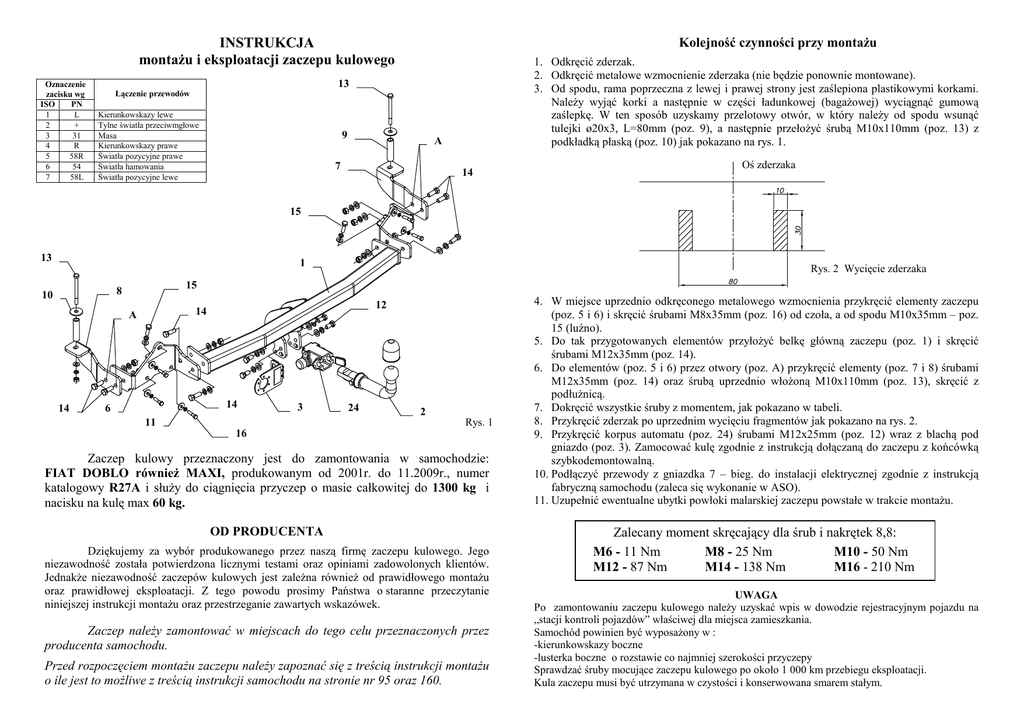 Kolejność czynności przy montaŜu INSTRUKCJA montaŜu i eksploatacji zaczepu kulowego Oznaczenie zacisku wg ISO PN 1 L 2 + 3 31 4 R 5 58R 6 54 7 58L 1. Odkręcić zderzak. 2. Odkręcić metalowe wzmocnienie zderzaka (nie będzie ponownie montowane). 3. Od spodu, rama poprzeczna z lewej i prawej strony jest zaślepiona plastikowymi korkami. NaleŜy wyjąć korki a następnie w części ładunkowej (bagaŜowej) wyciągnąć gumową zaślepkę. W ten sposób uzyskamy przelotowy otwór, w który naleŜy od spodu wsunąć tulejki ø20x3, L=80mm (poz. 9), a następnie przełoŜyć śrubą M10x110mm (poz. 13) z podkładką płaską (poz. 10) jak pokazano na rys. 1. 13 Łączenie przewodów Kierunkowskazy lewe Tylne światła przeciwmgłowe Masa Kierunkowskazy prawe Światła pozycyjne prawe Światła hamowania Światła pozycyjne lewe 9 A 7 14 Oś zderzaka 15 13 1 15 8 10 12 14 A 14 Rys. 2 Wycięcie zderzaka 14 6 3 11 24 2 Rys. 1 16 Zaczep kulowy przeznaczony jest do zamontowania w samochodzie: FIAT DOBLO równieŜ MAXI, produkowanym od 2001r. do 11.2009r., numer katalogowy R27A i słuŜy do ciągnięcia przyczep o masie całkowitej do 1300 kg i nacisku na kulę max 60 kg. OD PRODUCENTA Dziękujemy za wybór produkowanego przez naszą firmę zaczepu kulowego. Jego niezawodność została potwierdzona licznymi testami oraz opiniami zadowolonych klientów. JednakŜe niezawodność zaczepów kulowych jest zaleŜna równieŜ od prawidłowego montaŜu oraz prawidłowej eksploatacji. Z tego powodu prosimy Państwa o staranne przeczytanie niniejszej instrukcji montaŜu oraz przestrzeganie zawartych wskazówek. Zaczep naleŜy zamontować w miejscach do tego celu przeznaczonych przez producenta samochodu. Przed rozpoczęciem montaŜu zaczepu naleŜy zapoznać się z treścią instrukcji montaŜu o ile jest to moŜliwe z treścią instrukcji samochodu na stronie nr 95 oraz 160. 4. W miejsce uprzednio odkręconego metalowego wzmocnienia przykręcić elementy zaczepu (poz. 5 i 6) i skręcić śrubami M8x35mm (poz. 16) od czoła, a od spodu M10x35mm – poz. 15 (luźno). 5. Do tak przygotowanych elementów przyłoŜyć belkę główną zaczepu (poz. 1) i skręcić śrubami M12x35mm (poz. 14). 6. Do elementów (poz. 5 i 6) przez otwory (poz. A) przykręcić elementy (poz. 7 i 8) śrubami M12x35mm (poz. 14) oraz śrubą uprzednio włoŜoną M10x110mm (poz. 13), skręcić z podłuŜnicą. 7. Dokręcić wszystkie śruby z momentem, jak pokazano w tabeli. 8. Przykręcić zderzak po uprzednim wycięciu fragmentów jak pokazano na rys. 2. 9. Przykręcić korpus automatu (poz. 24) śrubami M12x25mm (poz. 12) wraz z blachą pod gniazdo (poz. 3). Zamocować kulę zgodnie z instrukcją dołączaną do zaczepu z końcówką szybkodemontowalną. 10. Podłączyć przewody z gniazdka 7 – bieg. do instalacji elektrycznej zgodnie z instrukcją fabryczną samochodu (zaleca się wykonanie w ASO). 11. Uzupełnić ewentualne ubytki powłoki malarskiej zaczepu powstałe w trakcie montaŜu. Zalecany moment skręcający dla śrub i nakrętek 8,8: M6 - 11 Nm M8 - 25 Nm M10 - 50 Nm M12 - 87 Nm M14 - 138 Nm M16 - 210 Nm UWAGA Po zamontowaniu zaczepu kulowego naleŜy uzyskać wpis w dowodzie rejestracyjnym pojazdu na „stacji kontroli pojazdów” właściwej dla miejsca zamieszkania. Samochód powinien być wyposaŜony w : -kierunkowskazy boczne -lusterka boczne o rozstawie co najmniej szerokości przyczepy Sprawdzać śruby mocujące zaczepu kulowego po około 1 000 km przebiegu eksploatacji. Kula zaczepu musi być utrzymana w czystości i konserwowana smarem stałym. PPUH AUTO-HAK Sp.J. WyposaŜenie zaczepu: Produkcja Zaczepów Kulowych Henryk & Zbigniew Nejman 76-200 SŁUPSK ul. Słoneczna 16K tel/fax (059) 8-414-414; 8-414-413 E-mail: [email protected] www. autohak.com.pl Zaczep kulowy bez wyposaŜenia elektrycznego R27A Klasa: A50-X Nr kat. Przeznaczony do zamontowania w samochodzie: Producent: FIAT Model: DOBLO równieŜ MAXI produkowanego od 2001r. do 11.2009r. Dane techniczne: wartość siły D: 7,9 kN maksymalna masa przyczepy: 1300 kg maksymalny nacisk na kulę: 60 kg Numer homologacji zgodnie z dyrektywą 94/20/WE: e20*94/20*0813*00 KARTA GWARANCYJNA Producent udziela gwarancji niniejszą kartą gwarancyjną na okres 24 miesięcy licząc od dnia zakupu zaczepu kulowego do samochodu: FIAT DOBLO produkowanego od 2001r. do 11.2009r. Data produkcji .............................. Data zakupu............................................. Zakres gwarancji obejmuje wyłącznie wady jakościowe wynikające z winy producenta. Gwarancja nie obejmuje natomiast uszkodzeń zawinionych przez nabywcę, wynikających z niewłaściwego montaŜu, uŜytkowania lub konserwacji, uszkodzeń mechanicznych, normalnego zuŜycia podczas eksploatacji itp. Gwarancja udzielona na zakupiony towar nie wyłącza, nie ogranicza ani nie zawiesza uprawnień kupującego wynikających z niezgodności towaru z umową. Reklamacje naleŜy zgłaszać w punkcie sprzedaŜy, składając jednocześnie kartę gwarancyjną. Usunięcie "wady" następuje po stwierdzeniu przez punkt sprzedaŜy wspólnie z producentem słuszności złoŜonej reklamacji. Reklamacja powinna być załatwiona w ciągu 14 dni od dnia uznania reklamacji. Karta gwarancyjna jest niewaŜna jeŜeli nie jest wypełniona i podpisana. Data zgłoszenia reklamacji: ................................................................... INFORMACJA WSTĘPNA Zaczep kulowy jest skonstruowany zgodnie z zasadami bezpieczeństwa ruchu drogowego. Zaczep kulowy jest elementem wpływającym na bezpieczeństwo jazdy i moŜe zostać zainstalowany wyłącznie przez personel wyspecjalizowany. Niedopuszczalne jest dokonywanie jakichkolwiek zmian w konstrukcji zaczepu. Powoduje to wygaśniecie dopuszczenia do stosowania. W przypadku obecności masy izolacyjnej lub osłony podwozia w miejscu przylegania zaczepu, naleŜy ją usunąć. Nieosłonięte miejsca karoserii oraz wywiercone otwory naleŜy pomalować farbą antyko