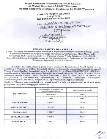 Zespół Zarządców Nieruchomości WAM Sp. z 0.0. uł. Wolnej Wszechnicy 5, 02-097 Warszawa Oddział Energetyki Cieplnej, ul. Elektoralna 24, 00-890 Warszawa MNIEJSZA TARYFA STANOWi ZAŁĄCZNIK UO DECYZJI PREZESA URE 1:..j!..<!!.ł~.4K~t.t:.:?:1,(.'!:w....~ z dnia .... "r O /JĄ V. Qh).ft::: ..~.g1.Q:6.'J(JQ)j~P11/!.7'3KSJlf/2f1~(I(CJ . . Z upcwoJ,.· Unędv nil' il/! p,.,ua "1; EMI'fClyki f. ZMIANA TARYFY DLA CIEPŁA części dotyczącej źródeł ciepła zlokalizowanych w województwie mazowieckim (Białobrzegi, Osiedle Wojskowe; Pomiechówek, Wojska Polskiego 72; Warszawa, Chełmżyńska; Mińsk Mazowiecki, Sobieskiego 85; Sochaczew, Lotników l; Warszawa-Wesoła, Wojska Polskiego 153,154,155,14; Stara Miłosna, Szkolna 14, Sulejówek przy ul. Plac Czarnieckiego 41, Grójec przy ul. Piłsudskiego 78, Warszawa - Rembertów przy ul. E. Gierczak) W W taryfie dla ciepła ustalonej przez Zespół Zarządców Nieruchomości WAM Spółka z 0.0. z siedzibą w Warszawie, Oddział Energetyki Cieplnej w Warszawie stanowiącej załącznik do decyzji Prezesa Urzędu Regulacji Energetyki z dnia 8 grudnia 2010 r. nr OWA-42l O-l 6(22)/20 1O/13859/IIIML, opublikowanej w Dzienniku Urzędowym Województwa Mazowieckiego Nr 210 z dnia 15 grudnia 2010 r. zmieniona decyzją Prezesa Urzędu Regulacji Energetyki z dnia 22 lipca 2011 r. nr OWA-42 l 097(23)/2010/201 11138591IIMZ1RWR, opublikowanej w Dzienniku Urzędowym Województwa Mazowieckiego Nr 139 z dnia 03 sierpnia 2011 r., wprowadza się następujące zmiany: Część IV "Rodzaje oraz wysokości cen i stawek opłat", w zakresie stawek opiat za ciepło i usługi przesyłowe, otrzymuje następujące brzmienie: stawka opłaty miesięcznej za zamówioną moc ciepną stawka opłaty za ciepło złIMW/m-c zł/Gl netto netto GRUPA M.B.OW 8951,85 51,86 GRUPA M.P. WP72 6111,47 54,91 9322,97 49,14 GRUPA M.MM. S 85 9514,68 49,57 GRUPA M.S.L. l 8660,51 89,69 grupa odbiorców GRUPAM.W.C stawka opłaty miesięcznej za zamówioną moc ciepną stawka opłaty za ciepło zł!MW/m-c zł/GJ netto netto 7484,11 52,72 GRUPA M.SM.S.14 10 573,31 50,15 GRUPA M.W.WP.153 9801,30 50,45 GRUPA M.S.41 7095,75 50,96 GRUPA M.G.78 11 701,83 62,08 7075,77 53,26 grupa odbiorców GRUPA M.W.WP. 154, 155 GRUPA M.W.WP.14 Lp. Rodzaj ceny lub stawki opiat Jednostki miary Grupa M.W.Gl Grupa M.W.G2 Cena za zamówioną moc cieplną 1 za rok netto 86056,20 86056,20 7171,35 7171,35 złIMW za miesiąc netto Ceny ciepła - 2 netto zł/GJ 32,90 32,90 10,98 10,98 Ceny nośnika ciepła 3 netto zł/m" Stawka opiaty stałej za usługi przesyłowe 4 za rok netto złIMW za miesiąc netto 10256,12 18617,64 854,68 1551,47 Stawka opłat zmiennych za usługi przesyłowe 5 netto zł/GJ 4,29 7,59 Ustalone w taryfie stawki opłat nie zawierają podatku od towarów i usług (VA T). Pcdatek VAT nalicza się zgodnie z obowiązującymi przepisami. ZA5TEPo. DYHTOP~. es. re N!GNYC~ oddzi<llu Energ<-"ty"i Cieplnej ZZN v~p. z o.o, inz ~SI1'iSKI