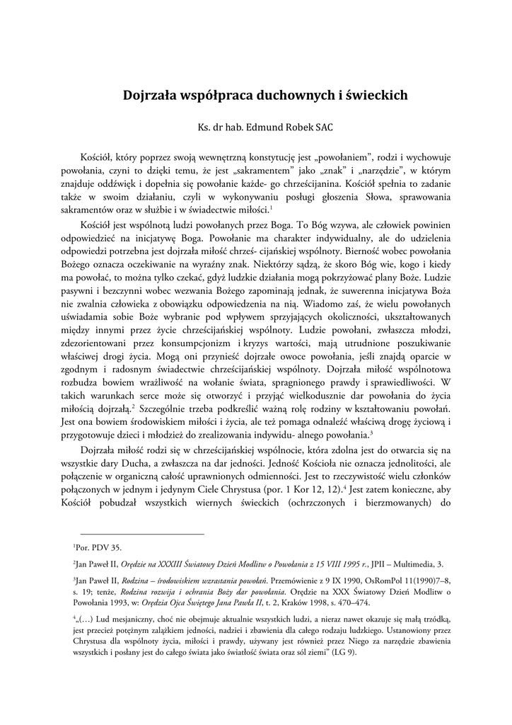 Dojrzała współpraca duchownych i świeckich Ks. dr hab. Edmund Robek SAC Kościół, który poprzez swoją wewnętrzną konstytucję jest „powołaniem”, rodzi i wychowuje powołania, czyni to dzięki temu, że jest „sakramentem” jako „znak” i „narzędzie”, w którym znajduje oddźwięk i dopełnia się powołanie każde- go chrześcijanina. Kościół spełnia to zadanie także w swoim działaniu, czyli w wykonywaniu posługi głoszenia Słowa, sprawowania sakramentów oraz w służbie i w świadectwie miłości.1 Kościół jest wspólnotą ludzi powołanych przez Boga. To Bóg wzywa, ale człowiek powinien odpowiedzieć na inicjatywę Boga. Powołanie ma charakter indywidualny, ale do udzielenia odpowiedzi potrzebna jest dojrzała miłość chrześ- cijańskiej wspólnoty. Bierność wobec powołania Bożego oznacza oczekiwanie na wyraźny znak. Niektórzy sądzą, że skoro Bóg wie, kogo i kiedy ma powołać, to można tylko czekać, gdyż ludzkie działania mogą pokrzyżować plany Boże. Ludzie pasywni i bezczynni wobec wezwania Bożego zapominają jednak, że suwerenna inicjatywa Boża nie zwalnia człowieka z obowiązku odpowiedzenia na nią. Wiadomo zaś, że wielu powołanych uświadamia sobie Boże wybranie pod wpływem sprzyjających okoliczności, ukształtowanych między innymi przez życie chrześcijańskiej wspólnoty. Ludzie powołani, zwłaszcza młodzi, zdezorientowani przez konsumpcjonizm i kryzys wartości, mają utrudnione poszukiwanie właściwej drogi życia. Mogą oni przynieść dojrzałe owoce powołania, jeśli znajdą oparcie w zgodnym i radosnym świadectwie chrześcijańskiej wspólnoty. Dojrzała miłość wspólnotowa rozbudza bowiem wrażliwość na wołanie świata, spragnionego prawdy i sprawiedliwości. W takich warunkach serce może się otworzyć i przyjąć wielkodusznie dar powołania do życia miłością dojrzałą.2 Szczególnie trzeba podkreślić ważną rolę rodziny w kształtowaniu powołań. Jest ona bowiem środowiskiem miłości i życia, ale też pomaga odnaleźć właściwą drogę życiową i przygotowuje dzieci i młodzież do zrealizowania indywidu- alnego powołania.3 Dojrzała miłość rodzi się w chrześcijańskiej wspólnocie, która zdolna jest do otwarcia się na wszystkie dary Ducha, a zwłaszcza na dar jedności. Jedność Kościoła nie oznacza jednolitości, ale połączenie w organiczną całość uprawnionych odmienności. Jest to rzeczywistość wielu członków połączonych w jednym i jedynym Ciele Chrystusa (por. 1 Kor 12, 12).4 Jest zatem konieczne, aby Kościół pobudzał wszystkich wiernych świeckich (ochrzczonych i bierzmowanych) do 1 Por. PDV 35. 2 Jan Paweł II, Orędzie na XXXIII Światowy Dzień Modlitw o Powołania z 15 VIII 1995 r., JPII – Multimedia, 3. 3 Jan Paweł II, Rodzina – środowiskiem wzrastania powołań. Przemówienie z 9 IX 1990, OsRomPol 11(1990)7–8, s. 19; tenże, Rodzina rozwija i ochrania Boży dar powołania. Orędzie na XXX Światowy Dzień Modlitw o Powołania 1993, w: Orędzia Ojca Świętego Jana Pawła II, t. 2, Kraków 1998, s. 470–474. 4 „(…) Lud mesjaniczny, choć nie obejmuje aktualnie wszystkich ludzi, a nieraz nawet okazuje się małą trzódką, jest przecież potężnym zalążkiem jedności, nadziei i zbawienia dla całego rodzaju ludzkiego. Ustanowiony przez Chrystusa dla wspólnoty życia, miłości i prawdy, używany jest również przez Niego za narzędzie zbawienia wszystkich i posłany jest do całego świata jako światłość świata oraz sól ziemi” (LG 9). DOJRZAŁA WSPÓŁPRACA DUCHOWNYCH I ŚWIECKICH 2. uświadomienia sobie obowiązku czynnego udziału w życiu kościelnym.5 Obok posługi kapłańskiej, także inne posługi ustanowione lub po prostu uznane, mogą się rozwijać z pożytkiem dla całej wspólnoty, zaspokajając jej wielorakie potrzeby: od katechezy po aktywny udział w liturgii, od wychowania młodzieży po różne formy działalności charytatywnej.6 Bogactwo dojrzałej miłości we wspólnocie chrześcijańskiej tworzą osoby duchowne i świeckie. Św. Bernard otwarcie pouczał wszystkie stany Kościoła, że mają stanowić jedno ciało: Skoro Pan nakazuje nam: Czuwajcie i módlcie się, byście nie popadli w pokusę, wynika stąd, że bez połączonego wysiłku wiernych (świeckich) i pasterzy (duchownych) nie może być bezpieczne ani państwo, ani oblubienica, ani owczarnia. Pytasz o różnicę między nimi? Są jednym.7 Współpraca wiernych świeckich należy do istoty życia Kościoła. Im lepiej się ona układa, tym łatwiej jest realizować nawet najbardziej trudne wyzwania apostolskie i duszpasterskie współczesnego Kościoła i świata.8 Tym bardziej potrzebny jest dialog, który umożliwi rozwiązywanie trudności, które rodzą się na linii: duchowni świeccy, a jednocześnie umożliwi poszukiwanie nowych, pionierskich sposobów realizowania zadań pastoralnych.9 Ważnym obszarem współpracy, choć ciągle zbyt mało docenianym, jest służba powołaniom w Kościele. Wymaga to od wiernych świeckich zrozumienia istoty kapłaństwa służebnego i rozeznania przyczyn, które utrudniają wypełnianie misji zbawczej przez sługi Kościoła. Laikat ma w tym względzie duże możliwości, gdyż posługa kapłanów uzależniona jest od warunków zewnętrznych, o których szeroką wiedzę posiadają ludzie na co dzień wypełniający swoje powołanie w świecie. Posługa kapłańska jest bo- wiem podobnie uwarunkowana, jak wiele innych funkcji społecznych. Można wśród tych warunków zewnętrznych wymienić takie, jak: wielość zadań i funkcji, złożoność życia ludzkiego w ogóle, a zwłaszcza życia społeczności chrześcijańskich, nadmierna aktywność i nawał zajęć, typowe dla tak wielu grup społecznych – wszystko to odbiera kapłanom czas i energię i wymusza niejako otwarcie na współpracę pastoralną (dusz- pasterską i apostolską) z wiernymi świeckimi.10 Współpraca w s