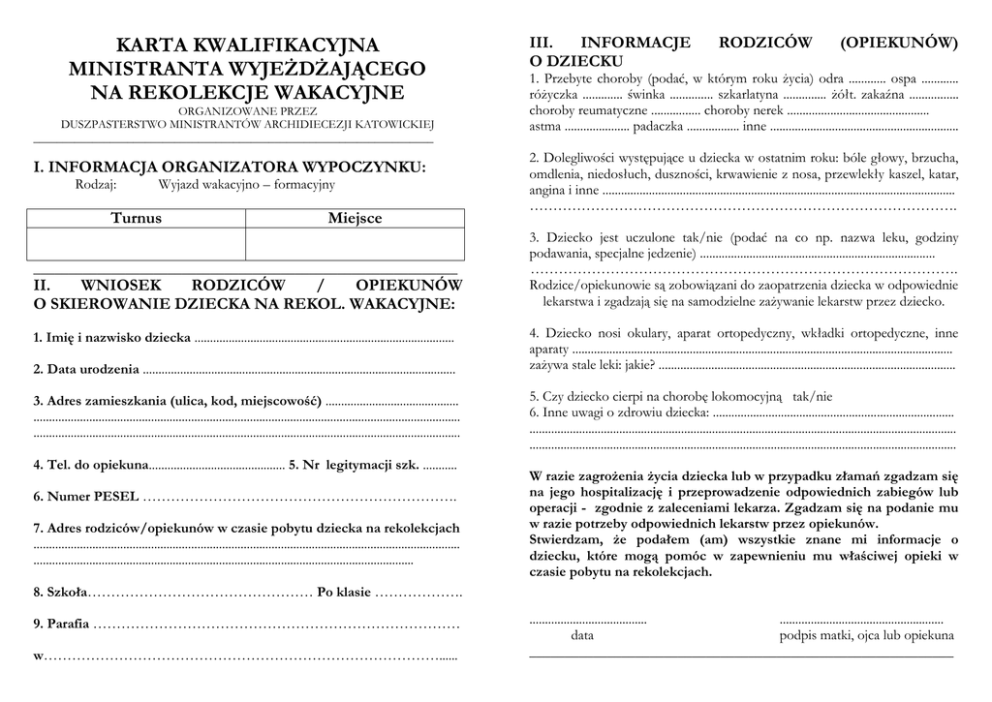 KARTA KWALIFIKACYJNA MINISTRANTA WYJEŻDŻAJĄCEGO NA REKOLEKCJE WAKACYJNE ORGANIZOWANE PRZEZ DUSZPASTERSTWO MINISTRANTÓW ARCHIDIECEZJI KATOWICKIEJ ____________________________________________________________________ I. INFORMACJA ORGANIZATORA WYPOCZYNKU: Rodzaj: Wyjazd wakacyjno – formacyjny Turnus Miejsce ____________________________________________________________ II. WNIOSEK RODZICÓW / OPIEKUNÓW O SKIEROWANIE DZIECKA NA REKOL. WAKACYJNE: 1. Imię i nazwisko dziecka .................................................................................... 2. Data urodzenia ..................................................................................................... 3. Adres zamieszkania (ulica, kod, miejscowość) ........................................... .......................................................................................................................................... .......................................................................................................................................... 4. Tel. do opiekuna............................................ 5. Nr legitymacji szk. ........... 6. Numer PESEL …………………………………………………………. 7. Adres rodziców/opiekunów w czasie pobytu dziecka na rekolekcjach .......................................................................................................................................... ........................................................................................................................... III. INFORMACJE O DZIECKU RODZICÓW (OPIEKUNÓW) 1. Przebyte choroby (podać, w którym roku życia) odra ............ ospa ............ różyczka ............. świnka .............. szkarlatyna .............. żółt. zakaźna ................ choroby reumatyczne ................ choroby nerek .............................................. astma ..................... padaczka ................. inne ............................................................. 2. Dolegliwości występujące u dziecka w ostatnim roku: bóle głowy, brzucha, omdlenia, niedosłuch, duszności, krwawienie z nosa, przewlekły kaszel, katar, angina i inne .................................................................................................................. ………………………………………………………………………………. 3. Dziecko jest uczulone tak/nie (podać na co np. nazwa leku, godziny podawania, specjalne jedzenie) ............................................................................ ………………………………………………………………………………. Rodzice/opiekunowie są zobowiązani do zaopatrzenia dziecka w odpowiednie lekarstwa i zgadzają się na samodzielne zażywanie lekarstw przez dziecko. 4. Dziecko nosi okulary, aparat ortopedyczny, wkładki ortopedyczne, inne aparaty ........................................................................................................................... zażywa stale leki: jakie? ................................................................................................ 5. Czy dziecko cierpi na chorobę lokomocyjną tak/nie 6. Inne uwagi o zdrowiu dziecka: .............................................................................. .......................................................................................................................................... .......................................................................................................................................... W razie zagrożenia życia dziecka lub w przypadku złamań zgadzam się na jego hospitalizację i przeprowadzenie odpowiednich zabiegów lub operacji - zgodnie z zaleceniami lekarza. Zgadzam się na podanie mu w razie potrzeby odpowiednich lekarstw przez opiekunów. Stwierdzam, że podałem (am) wszystkie znane mi informacje o dziecku, które mogą pomóc w zapewnieniu mu właściwej opieki w czasie pobytu na rekolekcjach. 8. Szkoła………………………………………… Po klasie ………………. 9. Parafia …………………………………………………………………… w…………………………………………………………………………...... ...................................... ..................................................... data podpis matki, ojca lub opiekuna ____________________________________________________________ III. INFORMACJE DLA UCZESTNIKA Początek rekolekcji w podanym dniu o godz. 15.00. Uczestnicy przyjeżdżają na miejsce od godz. 12.00. Przyjazd na punkt rekolekcyjny odbywa się pod opieką osoby dorosłej (podobnie i wyjazd). Rekolekcje wakacyjne ministrantów organizowane sa na wzór kolonii, dlatego uczestnicy mieszkają w kilkuosobowych pokojach, posiadających często łóżka piętrowe. Pod opieką animatorów sami dbają o porządek i wykonują drobne prace porządkowe (sprzątanie jadalni, sypialni, utrzymanie porządku wokół swojego łóżka/szafy itp.). W dniu przyjazdu przywozimy ze sobą wypełnioną niniejszą kartę. Jej brak spowoduje nieprzyjęcie dziecka na rekolekcje. Istnieje możliwość, na początku turnusu wpłacenia kieszonkowego dziecka osobie Prowadzącej turnus, w celu wypłacania małych kwot każdego dnia pobytu na rekolekcjach. Na Rekolekcje zabieramy z sobą: Pismo św., różaniec, notatnik, skarbiec modlitw i pieśni, śpiwór lub koc, prześcieradło, jasiek, ubrania i buty na zmianę (w tym obuwie sportowe, nadające się do wycieczek górskich i grania w piłkę nożną), przybory do higieny osobistej, pantofle, bieliznę osobistą, kąpielówki, ubranie przeciwdeszczowe, nakrycie głowy chroniące przed upałem, długie spodnie do udziału we Mszy świętej, odzież według uznania rodziców na wyjazd tygodniowy. Koniecznie kartę NFZ i legitymację szkolną WARUNKI UCZESTNICTWA 1. Uczestnik zobowiązany jest stosować się do 