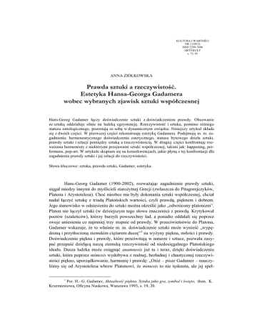 KULTURA I WARTOŚCI NR 1 (2012) ISSN 2299-7806 ARTYKUŁY s. 72–93 ANNA ZIÓŁKOWSKA Prawda sztuki a rzeczywistość. Estetyka Hansa-Georga Gadamera wobec wybranych zjawisk sztuki współczesnej Hans-Georg Gadamer łączy doświadczenie sztuki z doświadczeniem prawdy. Obcowanie ze sztuką oddziałuje silnie na ludzką egzystencję. Rzeczywistość i sztuka, pomimo różnego statusu ontologicznego, pozostają ze sobą w dynamicznym związku. Niniejszy artykuł składa się z dwóch części. W pierwszej części rekonstruuję estetykę Gadamera. Podejmuję m. in. zagadnienia: hermeneutycznego doświadczenia estetycznego, statusu bytowego dzieła sztuki, prawdy sztuki i relacji pomiędzy sztuką a rzeczywistością. W drugiej części konfrontuję rozważania hermeneuty z niektórymi przejawami sztuki współczesnej, takimi jak: happening, performans, pop-art. W artykule skupiam się na konsekwencjach, jakie płyną z tej konfrontacji dla zagadnienia prawdy sztuki i jej relacji do rzeczywistości. Słowa kluczowe: sztuka, prawda sztuki, Gadamer, estetyka. Hans-Georg Gadamer (1900-2002), rozważając zagadnienie prawdy sztuki, sięgał miedzy innymi do myślicieli starożytnej Grecji (zwłaszcza do Pitagorejczyków, Platona i Arystotelesa). Choć nieobce mu były dokonania sztuki współczesnej, chciał nadal łączyć sztukę z triadą Platońskich wartości, czyli prawdą, pięknem i dobrem. Jego stanowisko w odniesieniu do sztuki można określić jako „odwrócony platonizm”. Platon nie łączył sztuki (w dzisiejszym tego słowa znaczeniu) z prawdą. Krytykował poetów (szaleńców), którzy burzyli powszechny ład, a ponadto oddalali się poprzez swoje uniesienia co najmniej trzy stopnie od prawdy. W przeciwieństwie do Platona, Gadamer wskazuje, że to właśnie m. in. doświadczenie sztuki może wynieść „wypędzoną i przytłoczoną ziemskim ciężarem duszę”1 na wyżyny piękna, miłości i prawdy. Doświadczenie piękna i prawdy, które prześwitują w naturze i sztuce, pozwala zasypać przepaść dzielącą naszą ziemską rzeczywistość od niedosięgalnego Platońskiego ideału. Dusza ludzka może osiągnąć anamnesis już tu i teraz, dzięki doświadczeniu sztuki, która poprzez mimesis wydobywa z realnej, bezładnej i chaotycznej rzeczywistości piękno, uporządkowanie, harmonię i prawdę: „Otóż – pisze Gadamer – nauczyliśmy się od Arystotelesa wbrew Platonowi, że mimesis to nie tęsknota, ale jej speł1 Por. H.- G. Gadamer, Aktualność piękna. Sztuka jako gra, symbol i święto, tłum. K. Krzemieniowa, Oficyna Naukowa, Warszawa 1993, s. 19, 20. nienie. W spełnieniu tkwi cud porządku, który zwiemy »kosmosem«. Taki sens mimesis, sens naśladowania i rozpoznania w naśladowaniu, jest pojęciem dostatecznie szerokim, aby pomóc w zrozumieniu nowoczesnej sztuki”2; i dalej: „Każde dzieło sztuki jest jeszcze czymś takim, czym była kiedyś rzecz, w czego istnieniu rozbłyskuje i potwierdza się porządek; może nie taki porządek, który treściowo zbiega się z naszymi wyobrażeniami porządku, łączącymi niegdyś swojskie nam rzeczy w całość oswojonego świata. Ale zawiera się w nich wciąż odnawiany i potężny pierwiastek duchowej energii porządkującej”3. W wypowiedziach Gadamera zastanowienie wzbudza utożsamienie prawdy sztuki z pięknem (w sensie harmonii, doskonałości i porządku). Czytelnika, mającego chociażby pobieżny kontakt ze współczesnymi eksperymentami artystycznymi, może dziwić stwierdzenie, że Platońska trójjednia prawdy, dobra i piękna w połączeniu z Arystotelesowską mimesis może pomagać w zrozumieniu nowoczesnej sztuki. Awangardowe dzieła wydają się mieć niewiele wspólnego z „duchową energią porządkującą”. Z drugiej strony trudno zaprzeczyć, że sztuka współczesna w znacznej mierze ma ambicje poznawcze. Nie chce być tylko pięknym ornamentem i pozorem, ale chce być poznaniem i poszukiwaniem tego, co autentyczne. Tym, co istotnie łączy niektóre przejawy sztuki współczesnej (takie np. jak pop-art, happening, performans) i estetykę Gadamera jest kategoria prawdy. Niniejszy artykuł składa się z dwóch części. W pierwszej części rekonstruuję estetykę Gadamera, poszukując odpowiedzi na pytania: na czym polega poznawczy sens hermeneutycznie rozumianego przeżycia estetycznego; jaki jest sposób istnienia sztuki; jakie relacje zachodzą pomiędzy przeżyciem estetycznym, sztuką i rzeczywistością; o jaką prawdę w sztuce chodzi? Natomiast w drugiej, polemicznej części artykułu, podejmuję wyłaniające się wobec nowoczesnych tendencji artystycznych pytania: czy rozważania Gadamera mogą pozostać jeszcze w jakiś sposób aktualne po skonfrontowaniu ich z niektórymi przejawami sztuki współczesnej (na przykład z tzw. antysztuką); czy prawda sztuki – w hermeneutycznym ujęciu – może łączyć się z tym, co chaotyczne, irracjonalne i co stanowi zaprzeczenie wszelkiego ładu i harmonii; czy prawda sztuki może być oddzielona od dobra i piękna; o jaką prawdę w sztuce współczesnej chodzi? ESTETYKA HANSA-GEORGA GADAMERA Doświadczenie sztuki a poznanie. Opór wobec estetyki autonomicznej Gadamer poszukuje doświadczenia prawdy w obszarze szeroko pojętej humanistyki, wykraczającej poza wąsko wyspecjalizowane dziedziny nauki. Dostrzega i dowartościowuje manifestację prawdy, obecną w takich dziedzinach ludzkiej aktywności jak na przykład filozofia, doświadczenie religijne i doświadczenie sztuki. Prawda, objawiająca się w doświadczeniu sztuki, jest nieredukowalna do innego rodzaju 2 H.-G. Gadamer, Rozum, słowo, dzieje. Szkice wybrane, tłum. M. Łukaszewicz, K. Michalski, PIW, Warszawa 1979, s. 153, 154. 3 Tamże, s. 155. 73 poznania, nie daje się ona w żaden sposób zastąpić przez pojęcie, rozważania naukowe, ani też teorię sztuki. To podejście, wskazujące, że w sztuce objawia się prawda specyficzna, niedostępna na żadnej inn