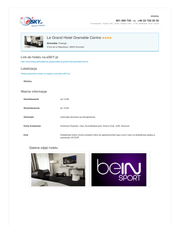 Infolinia 801 080 730 lub +48 32 728 30 30 Poniedziałek - Piątek: 8:00 - 22:00 | Sobota: 9:00 - 17:00 | Niedziela: 12:00 - 20:00 Le Grand Hotel Grenoble Centre Grenoble, Francja 5 Rue de la République, 38000 Grenoble Link do hotelu na eSKY.pl http://onet.eskyts.pl/hotele/francja/grenoble-le-grand-hotel-grenoble-centre Lokalizacja Zobacz położenie hotelu na mapie w serwisie eSKY.pl Okolica Ważne informacje Zameldowanie od 14:00 Wymeldowanie do 12:00 Zwierzęta zwierzęta domowe są akceptowane Karty kredytowe American Express, Visa, Euro/Mastercard, Diners Club, JCB, Discover Inne Dodatkowe łóżko można wstawić tylko do apartamentów typu junior suite za dodatkową opłatą w wysokości 45 EUR. Galeria zdjęć hotelu Hotele – Bilety lotnicze – Tanie linie lotnicze – Ubezpieczenia Podróżne