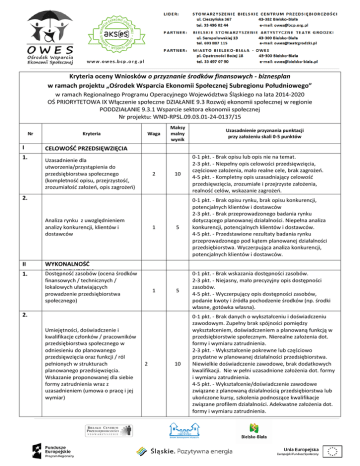 Kryteria oceny Wniosków o przyznanie środków finansowych - biznesplan w ramach projektu „Ośrodek Wsparcia Ekonomii Społecznej Subregionu Południowego” w ramach Regionalnego Programu Operacyjnego Województwa Śląskiego na lata 2014-2020 OŚ PRIORYTETOWA IX Włączenie społeczne DZIAŁANIE 9.3 Rozwój ekonomii społecznej w regionie PODDZIAŁANIE 9.3.1 Wsparcie sektora ekonomii społecznej Nr projektu: WND-RPSL.09.03.01-24-0137/15 Nr I 1. Kryteria Waga Maksy malny wynik CELOWOŚĆ PRZEDSIĘWZIĘCIA Uzasadnienie dla utworzenia/przystąpienia do przedsiębiorstwa społecznego (kompletność opisu, przejrzystość, zrozumiałość założeń, opis zagrożeń) 2 10 0-1 pkt. - Brak opisu lub opis nie na temat. 2-3 pkt. - Niepełny opis celowości przedsięwzięcia, częściowe założenia, mało realne cele, brak zagrożeń. 4-5 pkt. - Kompletny opis uzasadniający celowość przedsięwzięcia, zrozumiałe i przejrzyste założenia, realność celów, wskazanie zagrożeń. 5 0-1 pkt. - Brak opisu rynku, brak opisu konkurencji, potencjalnych klientów i dostawców 2-3 pkt. - Brak przeprowadzonego badania rynku dotyczącego planowanej działalności. Niepełna analiza konkurencji, potencjalnych klientów i dostawców. 4-5 pkt. - Przedstawione rezultaty badania rynku przeprowadzonego pod kątem planowanej działalności przedsiębiorstwa. Wyczerpująca analiza konkurencji, potencjalnych klientów i dostawców. 5 0-1 pkt. - Brak wskazania dostępności zasobów. 2-3 pkt. - Niejasny, mało precyzyjny opis dostępności zasobów. 4-5 pkt. - Wyczerpujący opis dostępności zasobów, podanie kwoty i źródła pochodzenie środków (np. środki własne, gotówka własna). 10 0-1 pkt. - Brak danych o wykształceniu i doświadczeniu zawodowym. Zupełny brak spójności pomiędzy wykształceniem, doświadczeniem a planowaną funkcją w przedsiębiorstwie społecznym. Nierealne założenia dot. formy i wymiaru zatrudnienia. 2-3 pkt. - Wykształcenie pokrewne lub częściowo przydatne w planowanej działalności przedsiębiorstwa. Niewielkie doświadczenie zawodowe, brak dodatkowych kwalifikacji. Nie w pełni uzasadnione założenia dot. formy i wymiaru zatrudnienia. 4-5 pkt. - Wykształcenie/doświadczenie zawodowe związane z planowaną działalnością przedsiębiorstwa lub ukończone kursy, szkolenia podnoszące kwalifikacje związane profilem działalności. Adekwatne założenia dot. formy i wymiaru zatrudnienia. 2. Analiza rynku z uwzględnieniem analizy konkurencji, klientów i dostawców II 1. Uzasadnienie przyznania punktacji przy założeniu skali 0-5 punktów 1 WYKONALNOŚĆ PRZEDSIĘWZIĘCIA Dostępność zasobów (ocena środków finansowych / technicznych / lokalowych ułatwiających prowadzenie przedsiębiorstwa społecznego) 1 2. Umiejętności, doświadczenie i kwalifikacje członków / pracowników przedsiębiorstwa społecznego w odniesieniu do planowanego przedsięwzięcia oraz funkcji / ról pełnionych w strukturach planowanego przedsięwzięcia. Wskazanie proponowanej dla siebie formy zatrudnienia wraz z uzasadnieniem (umowa o pracę i jej wymiar) 2 3. 4. III 1. Możliwości pozyskania i utrzymania rynków zbytu (ocena konkurencyjności profilu działalności w odniesieniu do sytuacji danego rynku/rynków) Płynność finansowa (zachowanie płynności finansowej po upływie okresu 12 miesięcy od zarejestrowania przedsiębiorstwa) oraz realności założonych przychodów i kosztów w okresie pierwszych 12 miesięcy działalności 1. 2 2 10 0-1 pkt. - Błędne założenia dotyczące płynności finansowej (nierealne założenia przychodów / kosztów) 2-3 pkt. - Nie w pełni uzasadnione / nieznacznie przeszacowane założenia dotyczące płynności finansowej (przychodów / kosztów). 4-5 pkt. - Opis dotyczący płynności finansowej racjonalny i uzasadniony. 10 0-1 pkt. - Brak informacji o wariantowości planowanej działalności lub brak uzasadnienia konieczności jej wystąpienia. 2-3 pkt. - Brak wariantowości w planowanej działalności przedsiębiorstwa, małe możliwości poszerzenia planowanej działalności. Założenie rozszerzenia działań lub wariantowej zmiany bez opisu wpływu zmian na wyniki planowanej działalności. 4-5 pkt. - Przewidziana i opisana realna możliwość poszerzenia działalności gospodarczej lub wariantowa jej zmiana. Opis ewentualnych zmian – elastyczność pomysłu. 10 0-1 pkt. - Błędne, nieracjonalne założenia ekonomiczne planowanego przedsięwzięcia. 2-3 pkt. - Założenia ekonomiczne budzące wątpliwości (mała racjonalność przyjętych założeń, brak wiarygodnych uzasadnień co do przyjętych założeń) 4-5 pkt. - Założenia ekonomiczne przejrzyste, racjonalne z podaniem ich pełnego uzasadnienia. Kompletna i realna analiza finansowa. 5 0-1 pkt. - Brak przejrzystości opisu profilu działalności. Wzajemnie wykluczające się założenia działalności opisywane w poszczególnych częściach biznesplanu mające istotny wpływ na zakres prowadzonej działalności. 2-3 pkt. - Opis profilu działalności nie w pełni przejrzysty. Wzajemnie niespójne założenia działalności opisywane w poszczególnych częściach biznesplanu mające jednak niewielki wpływ na zakres prowadzonej działalności. 4-5 pkt. - Opis profilu działalności w pełni przejrzysty. Spójne założenia działalności opisywane w poszczególnych częściach biznesplanu. EFEKTYWNOŚĆ KOSZTOWA Zasadność ekonomiczna planowanego przedsięwzięcia na podstawie analizy finansowej. 2 V 10 WIELOWARIANTOWOŚĆ Możliwość rozszerzenia profilu działalności lub jej zmiany (elastyczność przedsięwzięcia) IV 2 0-1 pkt. - Brak opisu możliwości pozyskania i utrzymania rynków zbytu. 2-3 pkt. - Ocena możliwości pozyskania i utrzymania rynków zbytu zbyt ogólnikowa lub niepełna. 4-5 pkt. - Wnikliwa ocena możliwości pozyskania i utrzymania rynków zbytu. OPERATYWNOŚĆ 1. Przejrzystość profilu działalności 1 5 0-1 pkt. - Brak prostych i zrozumia