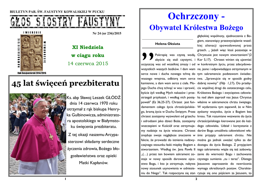 BIULETYN PAR. ŚW. FAUSTYNY KOWALSKIEJ W PUCKU Głos Siostry FaustynY Nr 24 (nr 236)/2015 XI Niedziela w ciągu roku 14 czerwca 2015 45 lat święceń prezbiteratu Ks. abp Sławoj Leszek GŁÓDŹ dnia 14 czerwca 1970 roku otrzymał z rąk biskupa Henryka Gulbinowicza, administratora apostolskiego w Białymstoku święcenia prezbiteratu. Z tej okazji naszemu Arcypasterzowi składamy serdeczne życzenia zdrowia, Bożego błogosławieństwa oraz opieki Matki Kapłanów. 1 Ochrzczony Obywatel Królestwa Bożego „ głębokiej wspólnoty, zjednoczenia z Bogiem, stanowiący przezwyciężenie wszelkiej alienacji spowodowanej przez grzech. „ Jeżeli więc ktoś pozostaje w Chrystusie jest nowym stworzeniem”(2 Kor 5,17). Chrzest winien się ujawniać w konkretnym życiu, przez zdecydowane, jasne i odpowiadające otrzymanym w tym sakramencie podstawom świadectwa. „Sprawujcie się w sposób godny dobrej nowiny” (Filip 1,27). Do przebycia wspólnej drogi do ostatecznego celu, Królestwa Bożego i zwycięstwa człowieka nad złem zaprosił nas Jezus Chrystus właśnie w sakramencie chrztu świętego. W wydarzeniu tym zapewnił, że w Nim zyskamy wszystko, życie z Bogiem bez kresu. Tak rozumiane wezwanie do życia chrześcijańskiego kierowane jest do każdego człowieka. Udział i korzystanie z darów Boga umożliwia człowiekowi właśnie przyjęty sakrament chrztu. Nie można go jednak uważać tylko za dar dostępu do życia Bożego. Z przyjęciem tego sakramentu wiąże się też zobowiązanie do wierności Bogu i zachowania czystego sumienia „tu i teraz”. Dlatego Jezusowe zaproszenie do nawrócenia wymaga określonych postaw. Charakteryzuje się ono pójściem za Jezusem, to Helena Oksiuta Pokropię was czystą wodą, abyście się stali czystymi, i oczyszczę was od wszelkiej zmazy i od wszystkich waszych bożków. I dam wam serce nowe i ducha nowego tchnę do waszego wnętrza, odbiorę wam serce kamienne, a dam wam serce z ciała. Mojego Ducha chcę tchnąć w was i sprawić, byście żyli według Mych nakazów i przestrzegali przykazań, i według nich postępowali" (Ez 36,25-27). Chrzest jest fundamentem całego życia chrześcijańskiego, bramą życia w Duchu Świętym. Przez chrzest zostajemy wyzwoleni od grzechu i odrodzeni jako dzieci Boże, zostajemy wszczepieni w Kościół oraz otrzymujemy nadzieje na życie wieczne. Chrzest znajduje swoje najgłębsze znaczenie w fakcie, że prowadzi do istnienia nadzwyczajnego stosunku łaski między Bogiem a stworzeniem. Według św. Jana Pawła II „(…) przez ten bowiem sakrament zostaje w nowy sposób darowane ojcostwo Boga, i kto je otrzymuje, nabywa nowy stosunek usynowienia w odniesieniu do Niego”. Tak rozpoczyna się stan 2 znaczy uczynienie Jego osoby najwyższą wartością w życiu. Benedykt XVI naucza „ (…)Chrzest jest niejako mostem, który Pan zbudował między Sobą a nami; drogą, dzięki której staje się dla nas dostępny; Bożą tęczą nad naszym życiem; obietnicą wielkiego „tak” Boga; bramą nadziei i jednocześnie znakiem wskazującym nam drogę, którą mamy przebyć z zaangażowaniem i z radością, by Go spotkać i poczuć, że On nas miłuje”. Chrzest to wspaniała rzeczywistość przez którą osoba ludzka zostaje włączona w jedną i szczególną relację Jezusa z Ojcem, tak, że słowa wypowiedziane z nieba nad Jednorodzonym Synem: „Ten jest Mój Syn Umiłowany, w którym mam upodobanie” (Mt 3,17), stają się prawdziwe dla każdego, odrodzonych z wody i z Ducha Świętego. Ks. Jan Twardowski pisał „(…) być ochrzczonym to być tym, przez kogo Pan Jezus chce przyjść. Każdy chrześcijanin podobny jest do ślepego od urodzenia, któremu Jezus przez sakrament chrztu otwiera oczy”. Chrzest zobowiązuje człowieka do życia w świętości; do życia otwartego na Boga, w modlitwie i zgodnie z przykazaniami. Świadczyć o Bogu w codziennym życiu i działaniu. Odróżniać to, co posiada istotną wartość od tego, co jej nie posiada. Człowiek tylko w jedności z Bogiem kieruje się ku pewnej przyszłości, która wpisuje się w perspektywę inną niż iluzoryczne, chwilowe propozy- cje bożków tego świata, a która daje prawdziwą radość, zapał i siłę w codziennym życiu. Pięknie tę prawdę ujął prof. K. Toeplitz „(…) zwracać się ku dobru, które się człowiekowi objawia, dzięki czemu człowiek staje się sobą, to znaczy żyje z Boga, a On w człowieku, w życiu ludzkim”. Taka postawa implikuje nie tylko akt rozumu, woli i uczuć, ale przede wszystkim konkretne postępowanie, ład moralny. Chrzest jest początkiem i podstawą powierzenia człowieka Bogu. Chrzest nadaje życiu człowieka zasadniczy, odpowiedni kierunek. Chrzest zaprasza do otwarcia się na rzeczywistość, która ukazuje dobro i piękno życia w zjednoczeniu z Bogiem. Chrzest zawierający w sobie symbol oczyszczenia jest odpowiedzią na pragnienie człowieka, aby być autentycznie wolnym od wszelkiego zła, egoizmu czy obojętności. Ochrzczony obywatelem Królestwa Bożego? Aby być obywatelem Królestwa Bożego, nie wystarczy być ochrzczonym i znać jedynie pozornie mierniki Boże. Nieraz mówimy, że akceptujemy ogólnie obowiązujące przepisy i normy. Kiedy jednak jakieś wymaganie jest dla nas niewygodne, nie wahamy się je jakoś ominąć. Jako obywatele Królestwa Bożego już tu na ziemi powinniśmy kierować się wznioślejszymi pobudkami. Dlaczego? Ponieważ darzymy miłością Prawodawcę – Boga, a On nas. Nie znamy godziny kiedy nas czas tu na ziemi minie. Czy 3 okażemy się wtedy dobrymi obywatelami? Teraz jest najlepszy czas, by to dowieść. Wszystkie codzienne decyzje podejmujmy tak, by przysparzać chwały Panu i pokazywać, że to co zostało zapoczątkowane w nas w momencie chrztu wciąż wydaje piękne owoce. Jak pisze papież Franciszek „(…) człowiek otrzymuje w chrzcie naukę, którą ma wyznawać, oraz konkretną formę życia, która wymaga zaangażowania ca